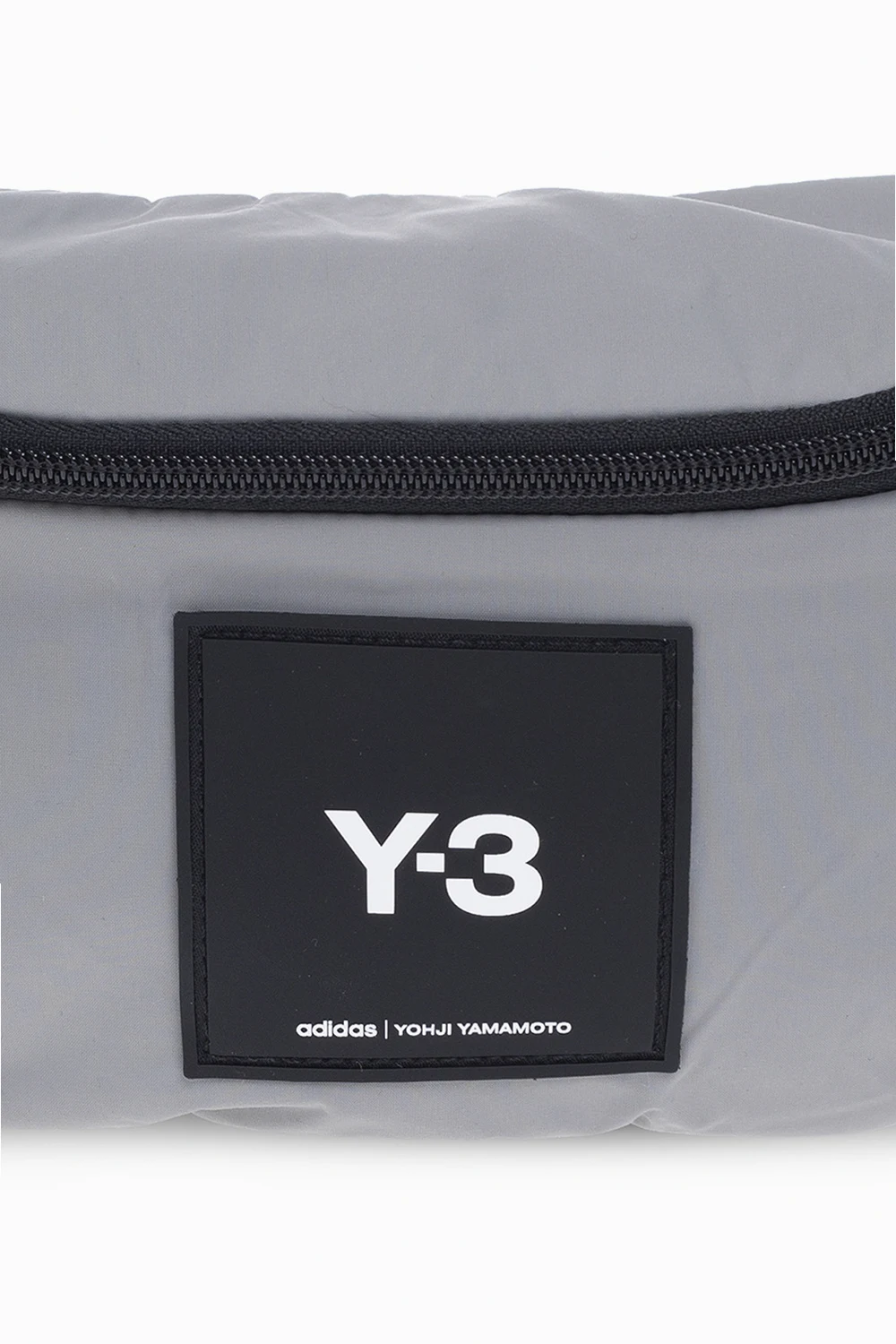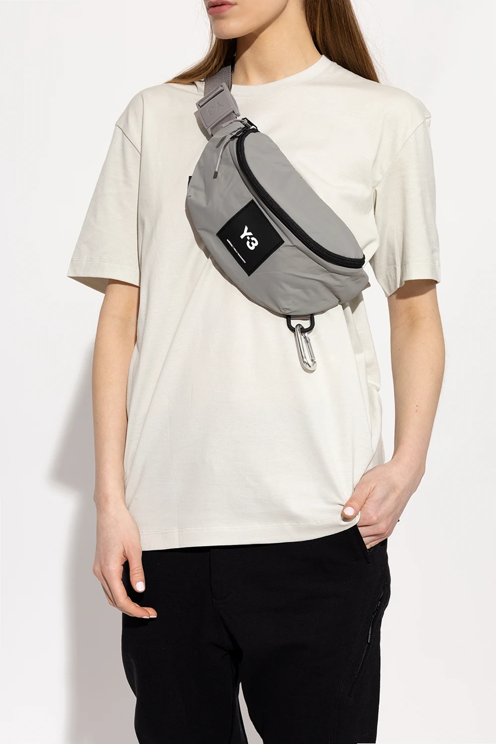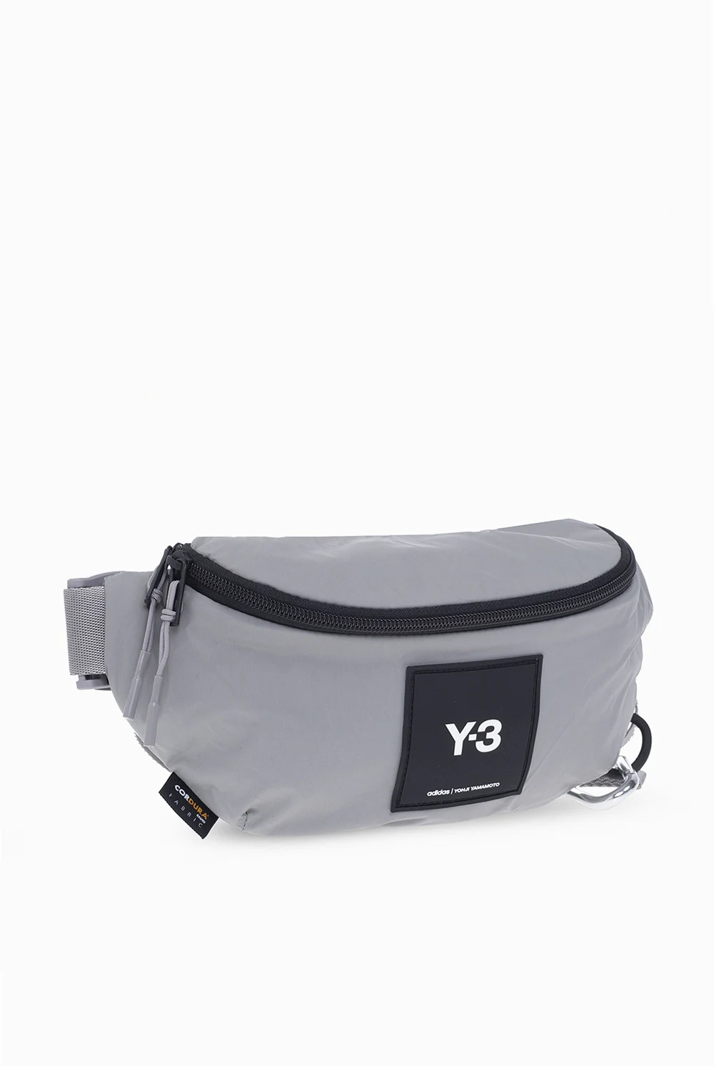 Grey and black belt bag from Y-3 Yohji Yamamoto. Crafted from durable CORDURA® nylon, this design fastens via a two-way zip and showcases a silicone logo patch on the front, an adjustable strap with a branded fidlock buckle, a back zip pocket, an attached metal lobster clip, and one internal compartment with a zip pouch.