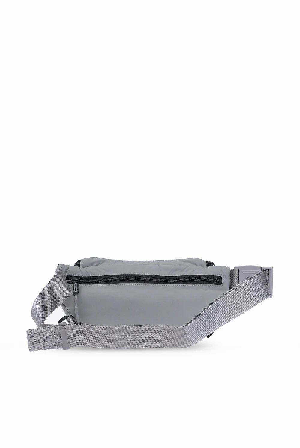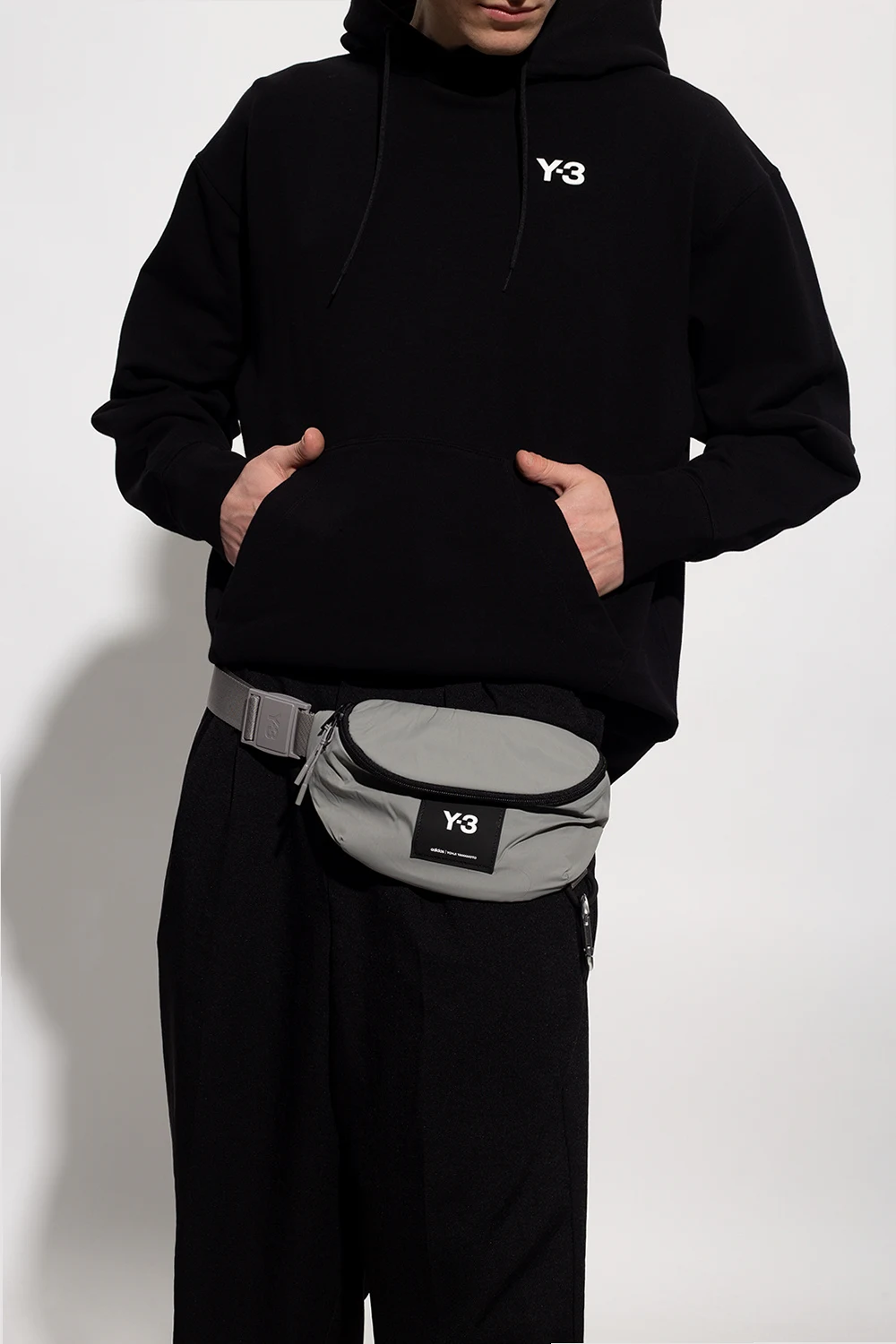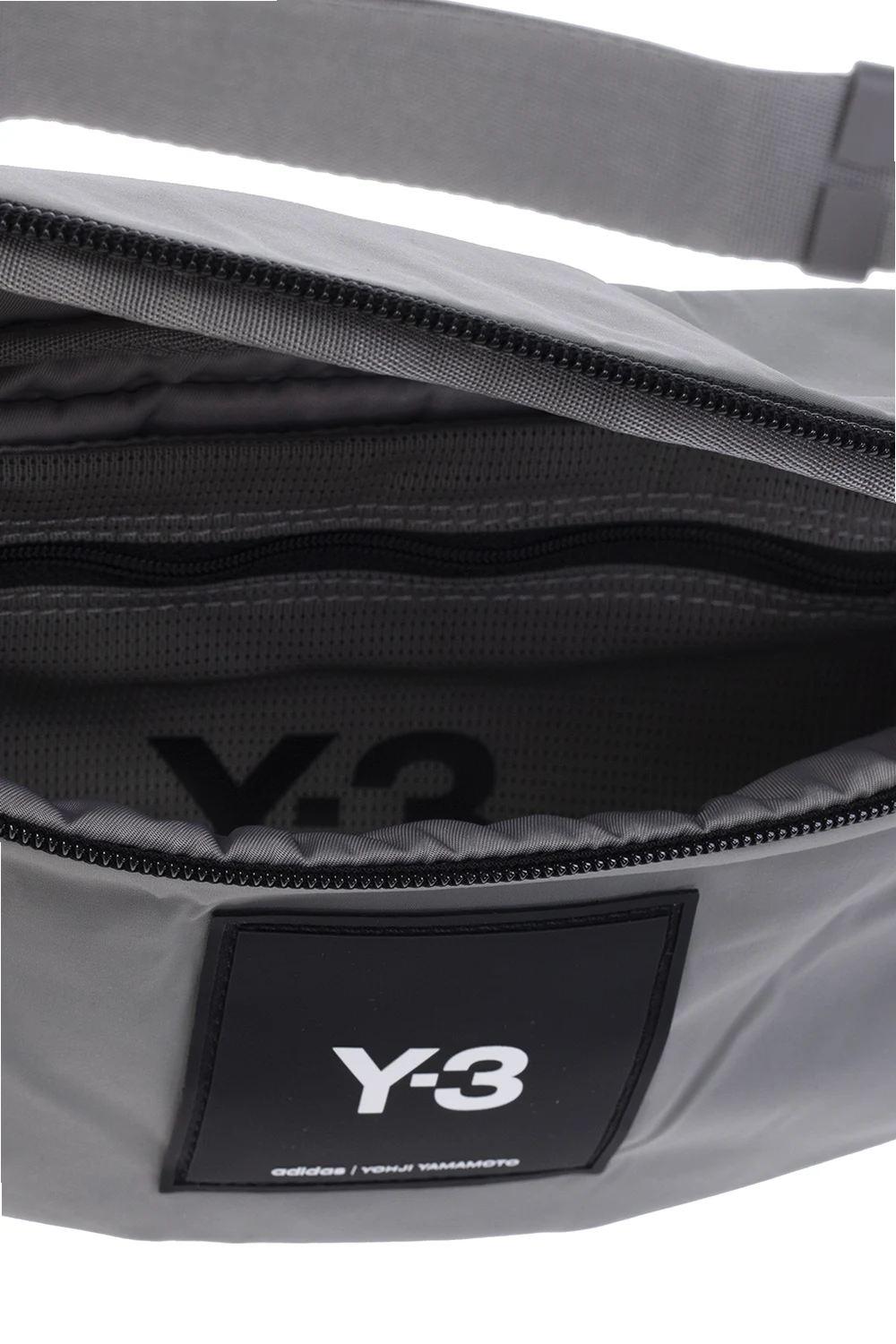 Grey and black belt bag from Y-3 Yohji Yamamoto. Crafted from durable CORDURA® nylon, this design fastens via a two-way zip and showcases a silicone logo patch on the front, an adjustable strap with a branded fidlock buckle, a back zip pocket, an attached metal lobster clip, and one internal compartment with a zip pouch.