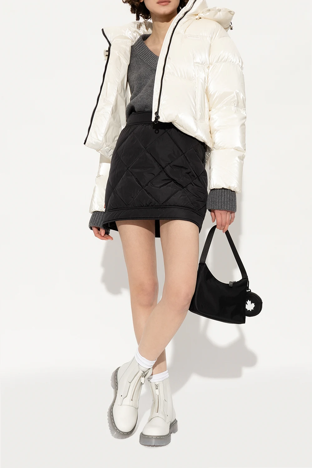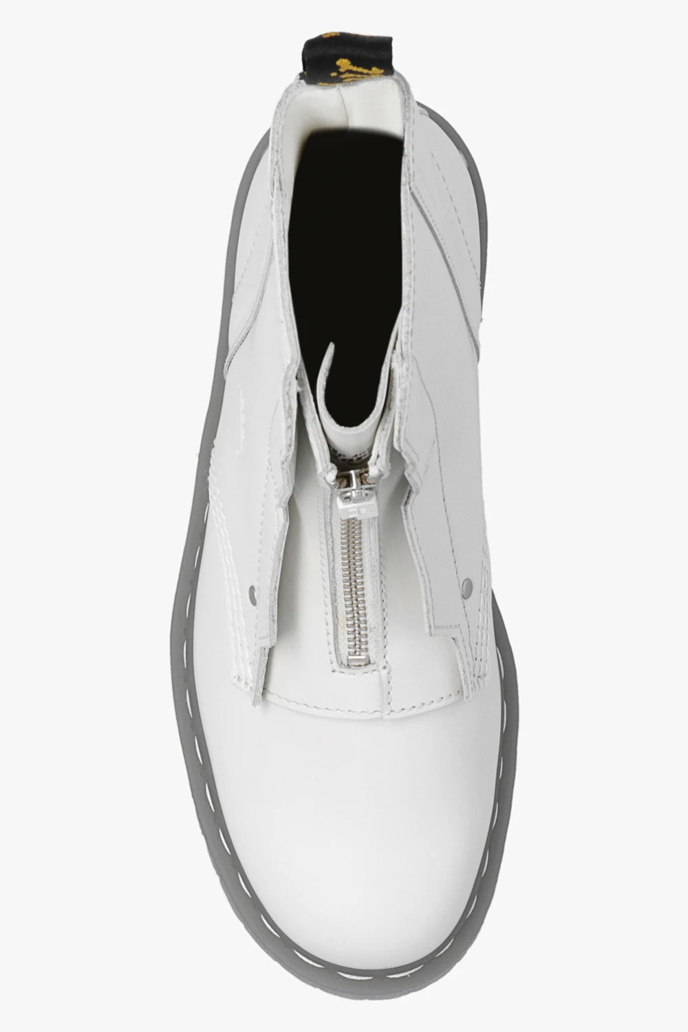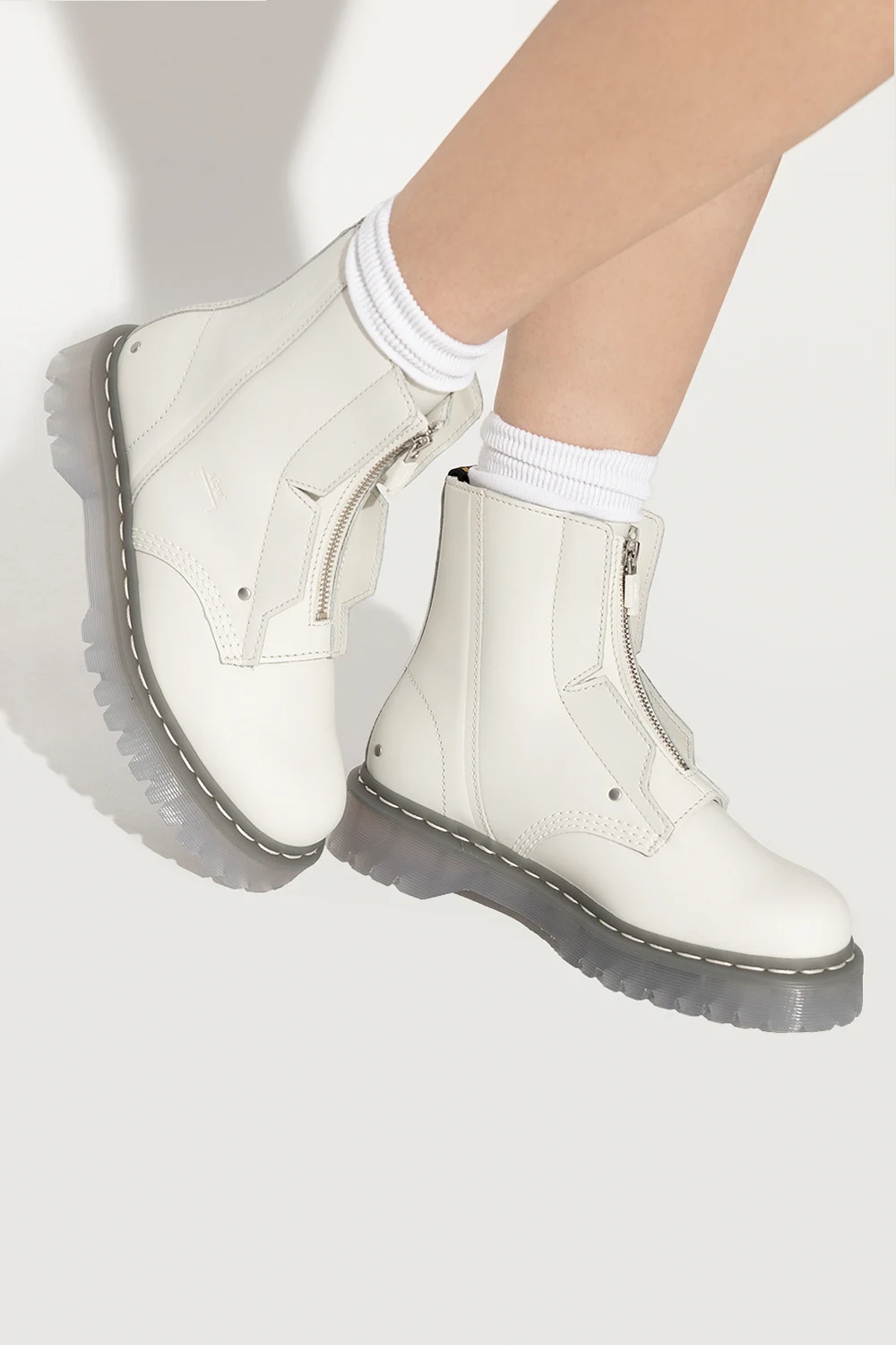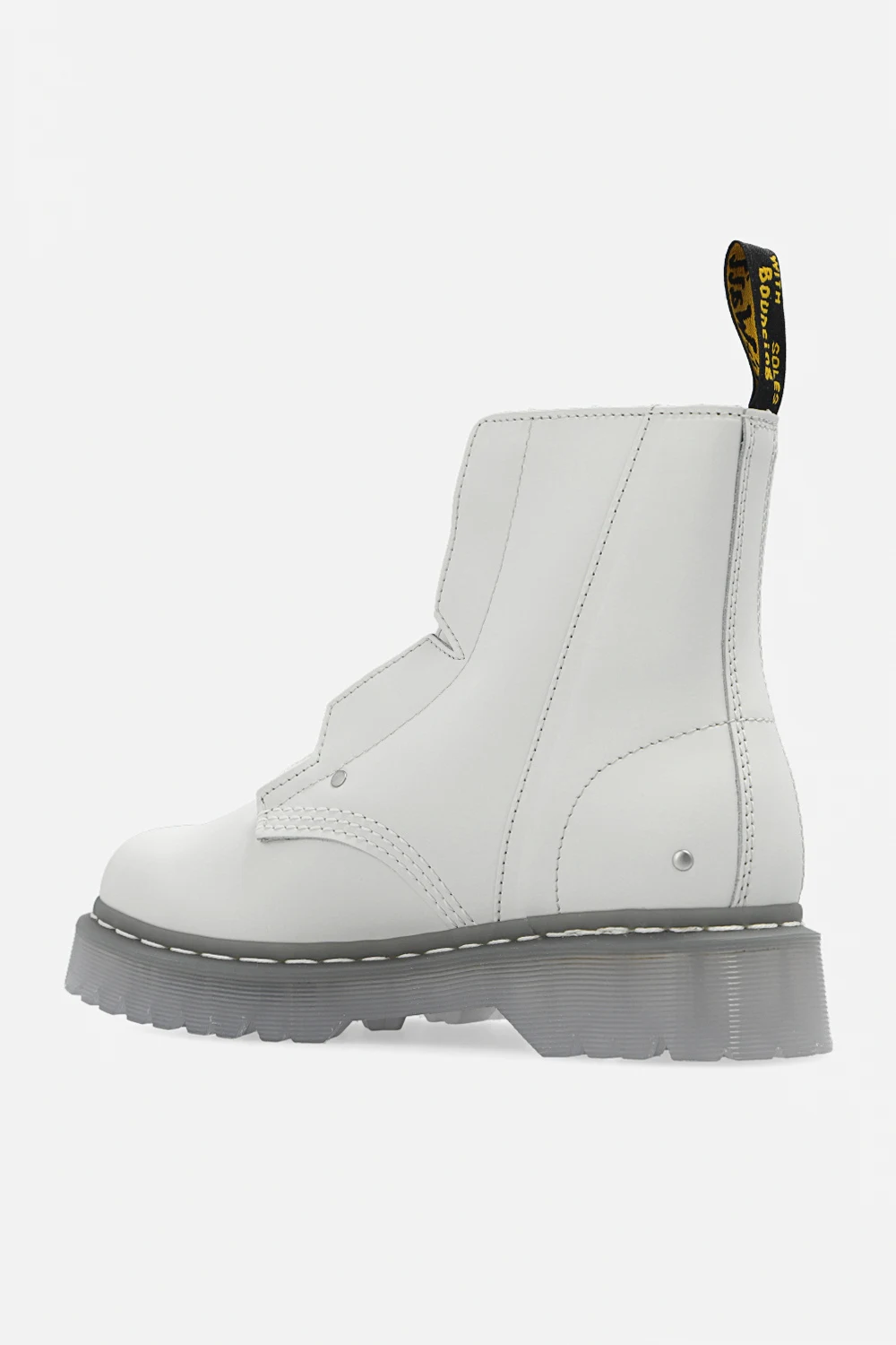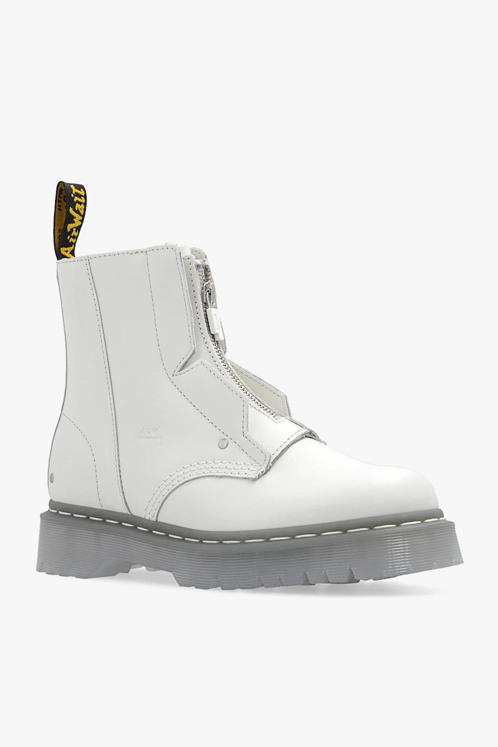 White ‘Bex’ boots from A-COLD-WALL* x DR MARTENS. Crafted from leather, this pair features a zip, embossed logo, yellow and black pull strap and transparent rubber sole.