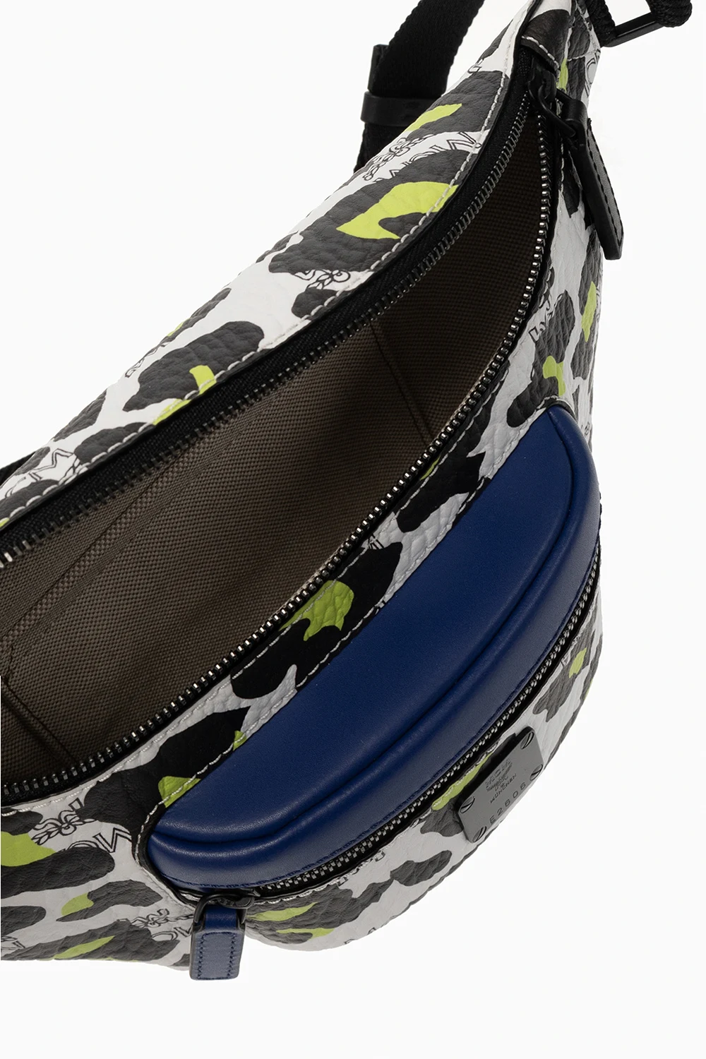 White, black and green belt bag from MCM. Crafted from the brand's signature ‘Visetos’ canvas, this design fastens with a zip and showcases a decorative graphic print and monogram motif. It is complete an adjustable strap, one internal compartment and a logo application accompanied with a zip pocket on the front.
