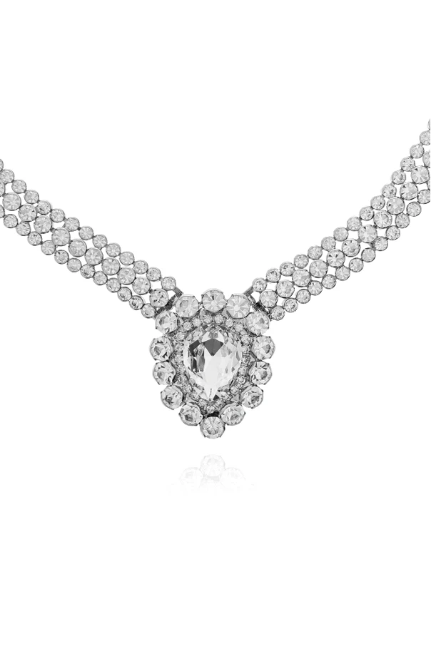 Discover the epitome of modern refinement with this silver-tone crystal choker necklace by Alessandra Rich. Meticulously crafted from lustrous glass and polished brass, this captivating piece features two parallel rows of radiant crystals , creating a mesmerizing interplay of light and elegance.