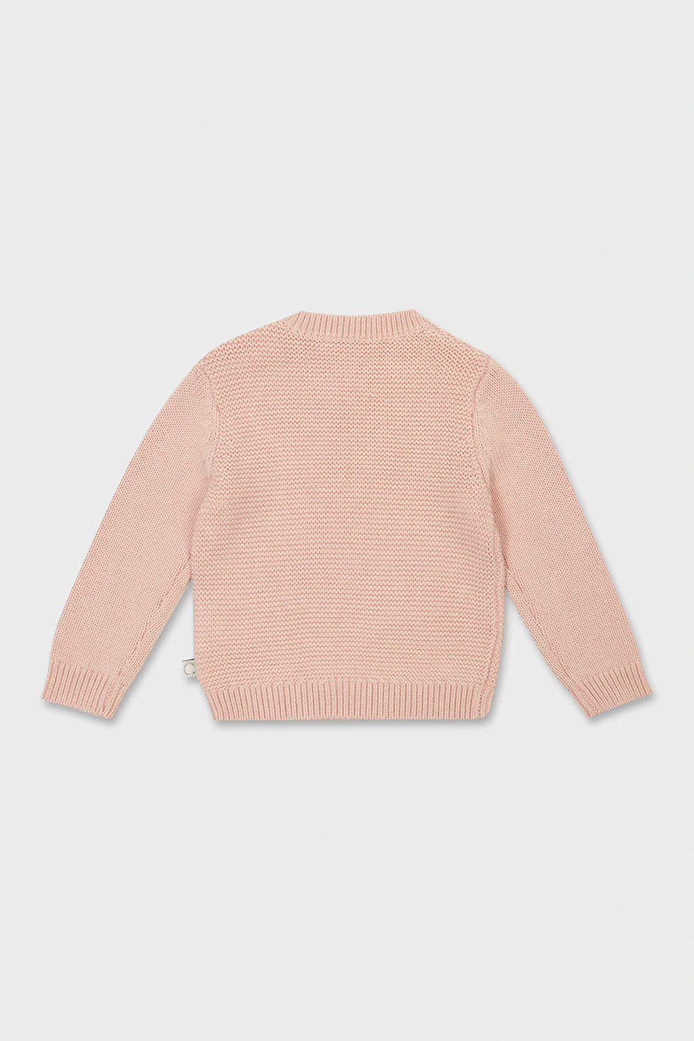 Light pink crewneck sweater from Stella McCartney Kids. Crafted from a blend of wool and organic cotton, this style features button fastenings, long sleeves, ribbed trims and red and white toadstool embroidery on the front.