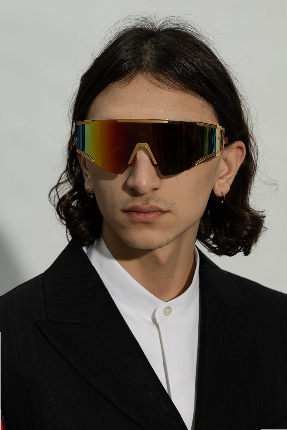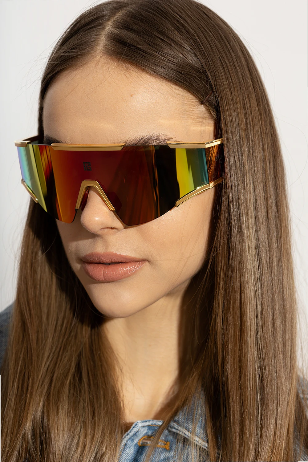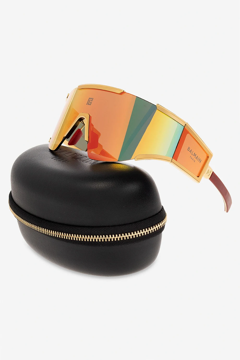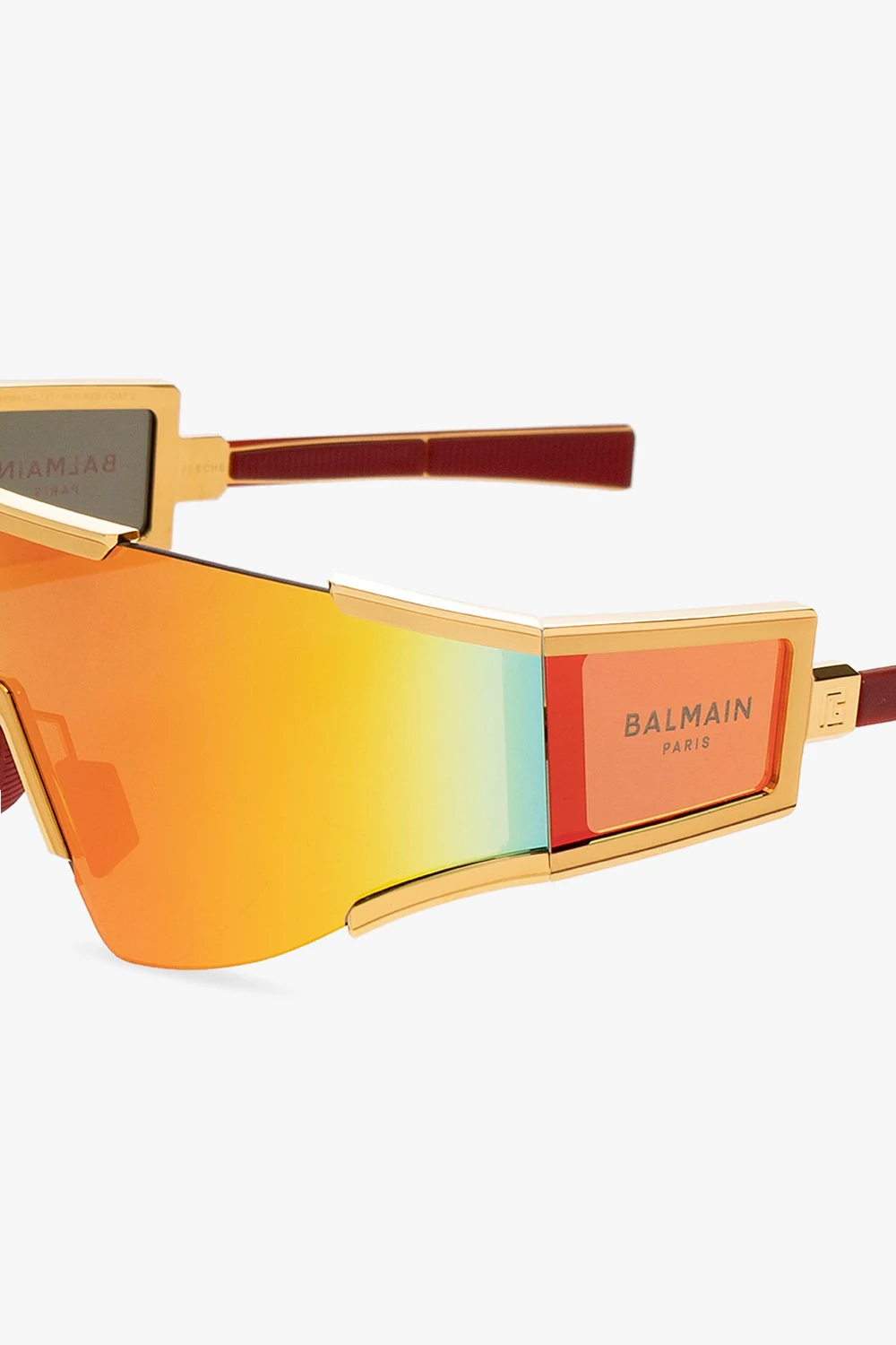 Multicolored ‘Fleche’ sunglasses from Balmain. This pair has full rectangular anti-reflective mask lenses with 100% UV protection, single bridge with rubber-trimmed nose pads, logo detail, titanium details in gold-tone as well as temples with a logo engraved with a monogram. Case included.