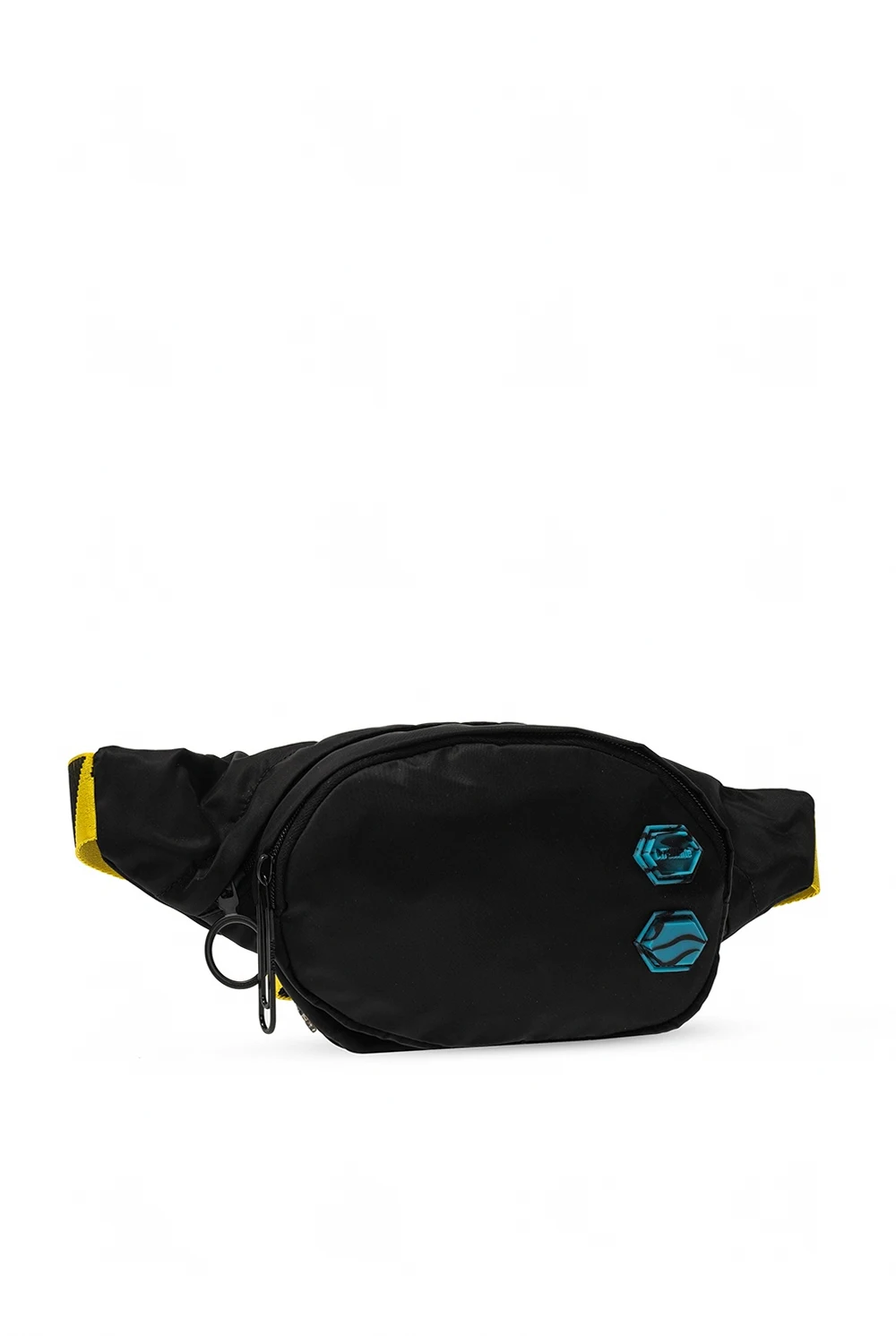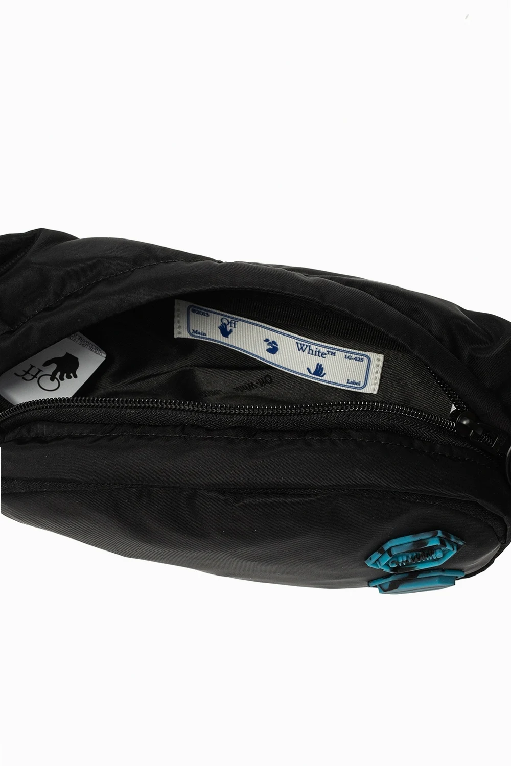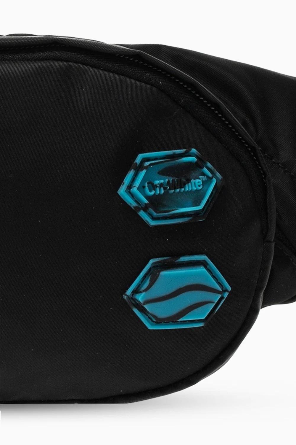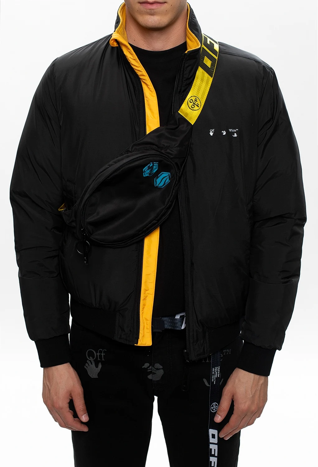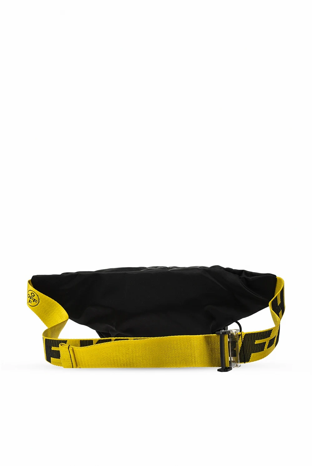 Black and yellow belt bag from Off-White. Boosted with distinctive blue and black rubberised details on the front, this item fastens via zip and employs one internal compartment and an adjustable strap with buckle closure and jacquard logo of the label.