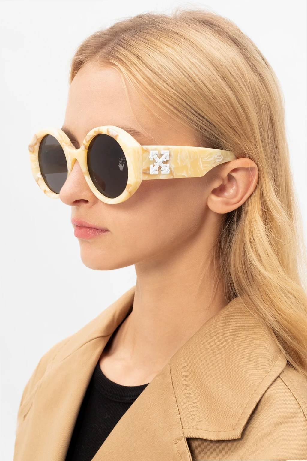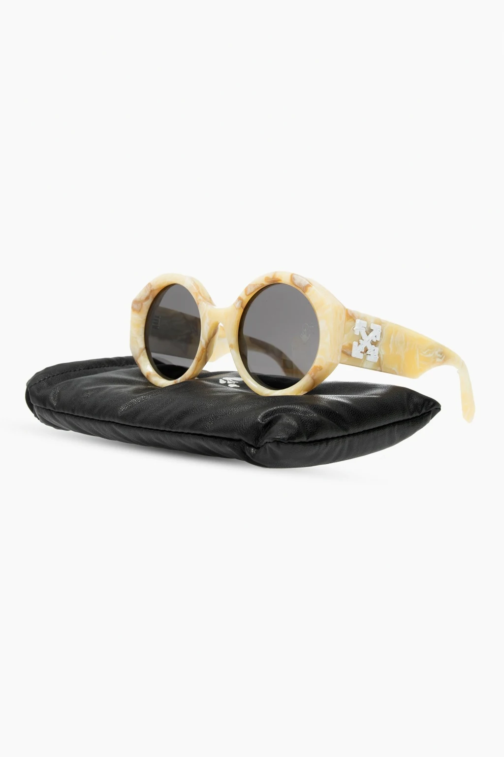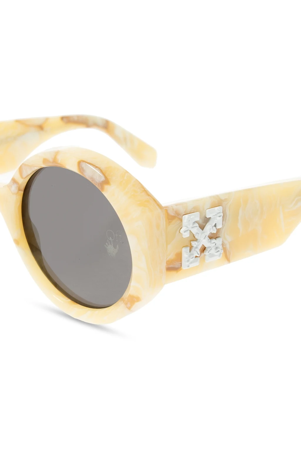 Brown and cream sunglasses from Off-White. Crafted from acetate, this pair showcases white logo gusset and grey, certificated lenses with UVA/UVB protection and etched logo. This item comes with a black strapped protective case, printed with the silver-tone logo.