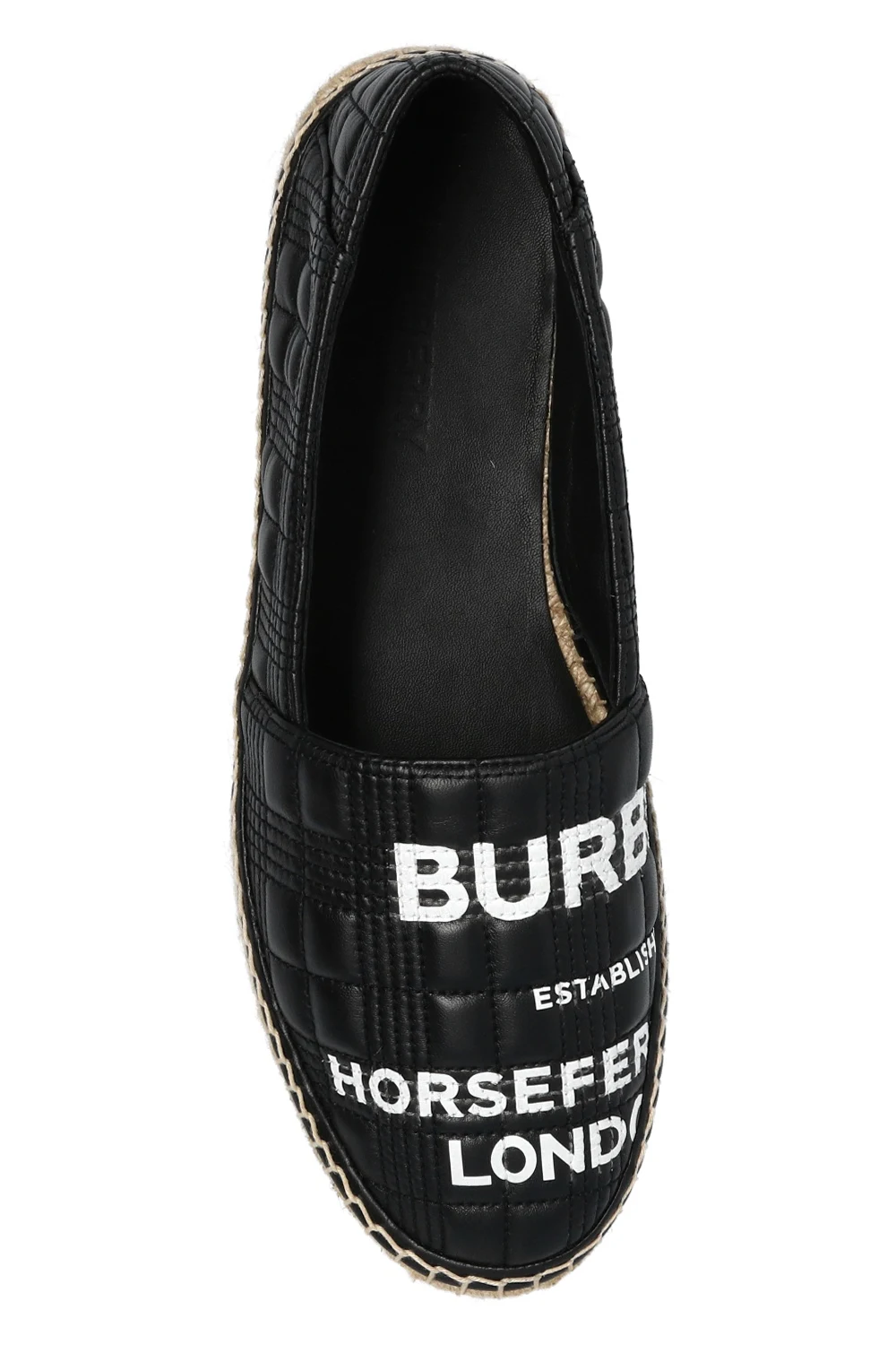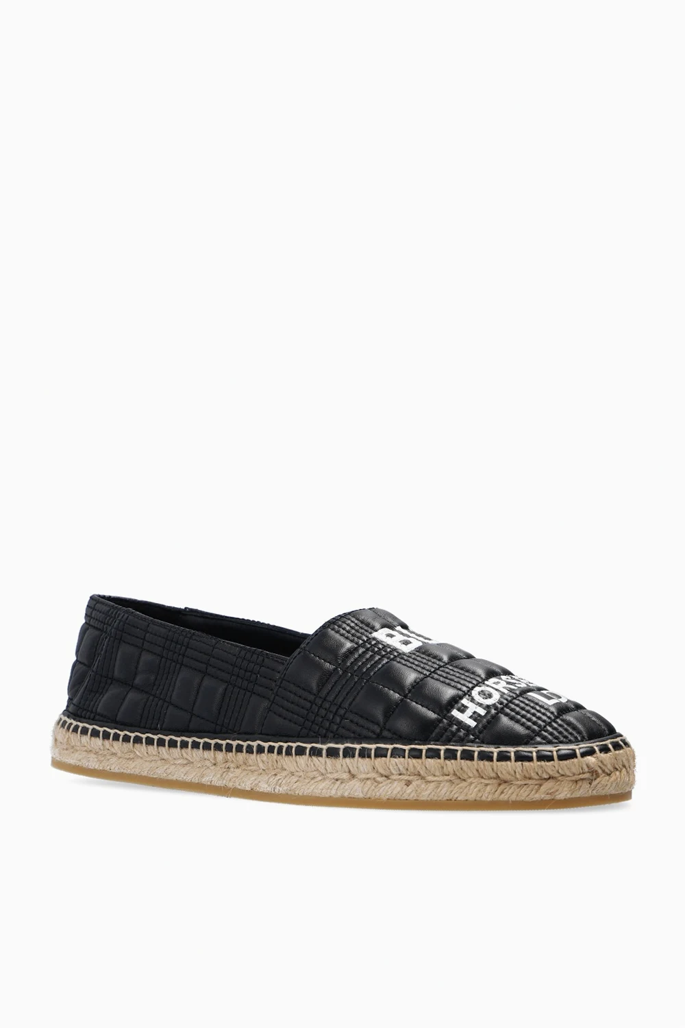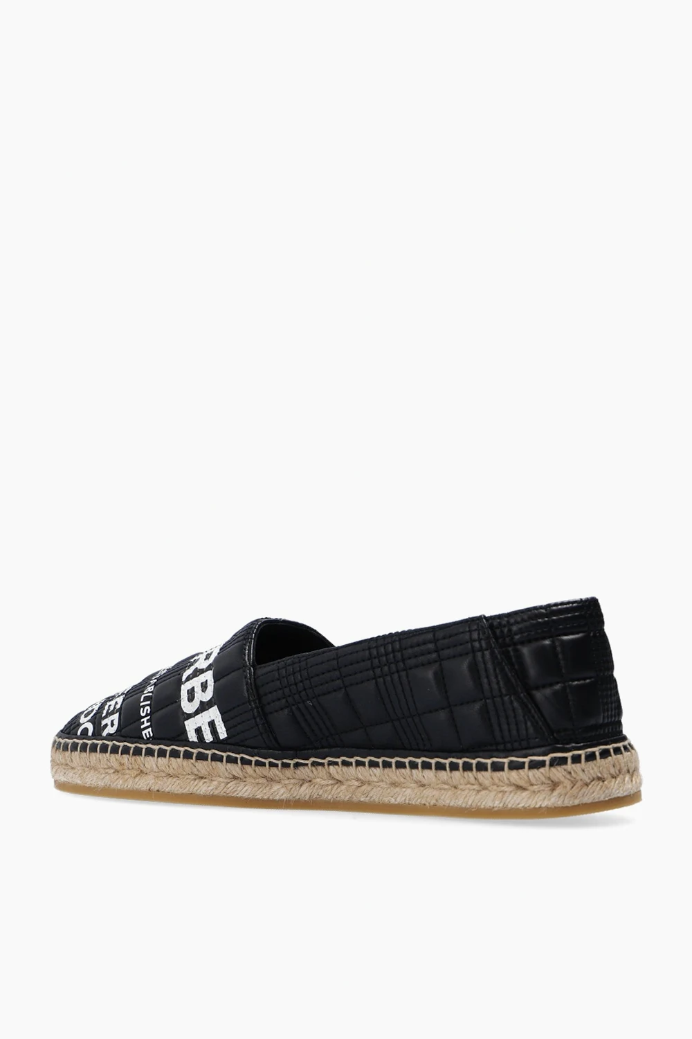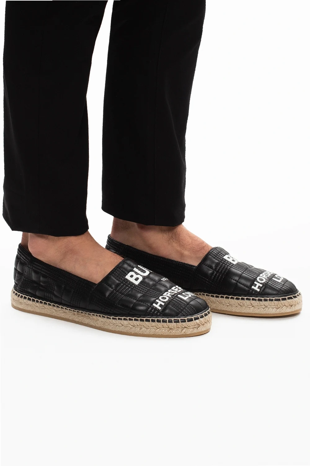 Black espadrilles from Burberry. Crafted from quilted leather, this pair sits on a beige rubber sole and showcases the brand's logo printed in white.