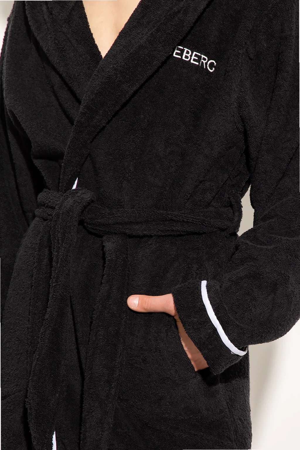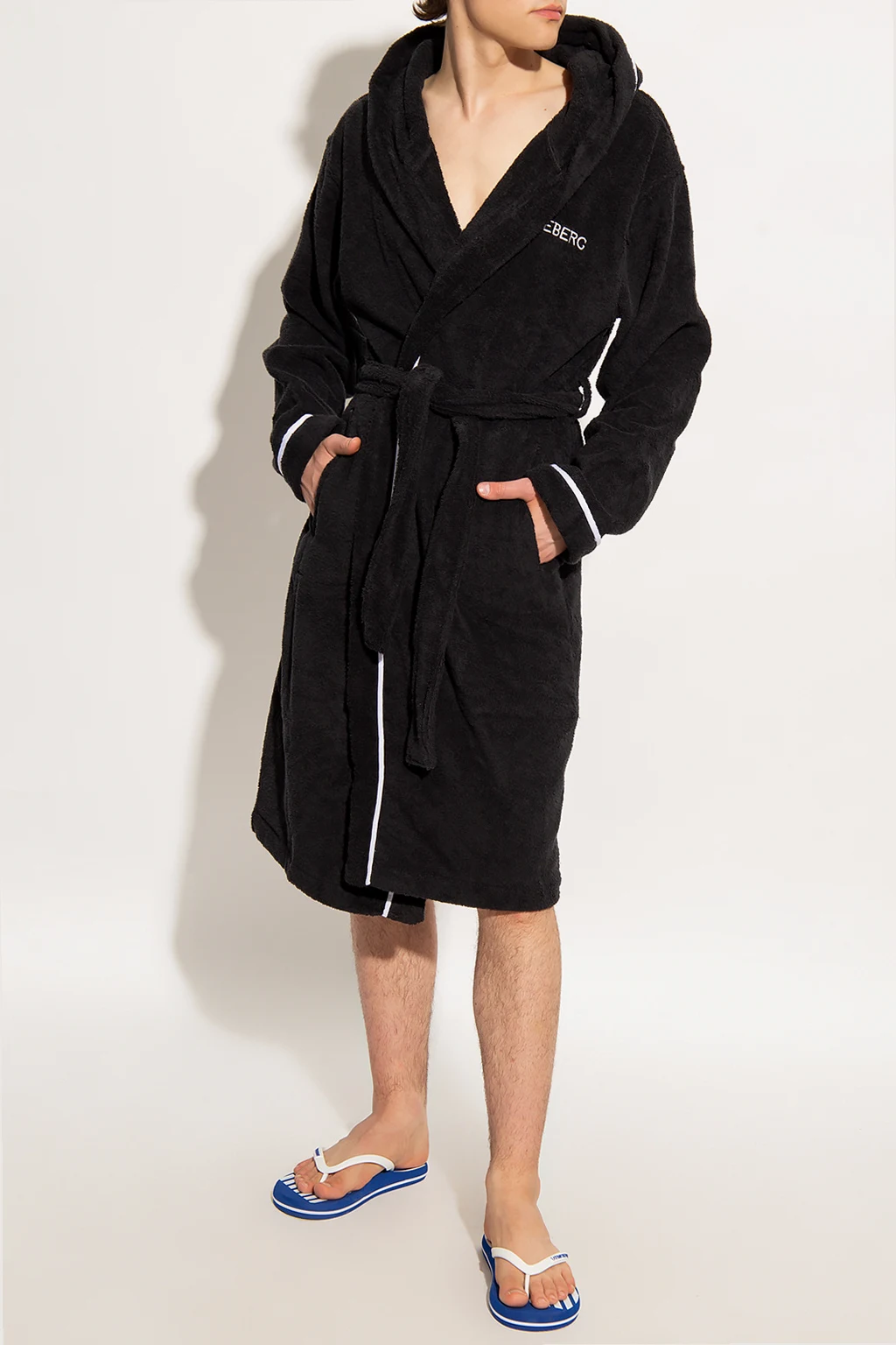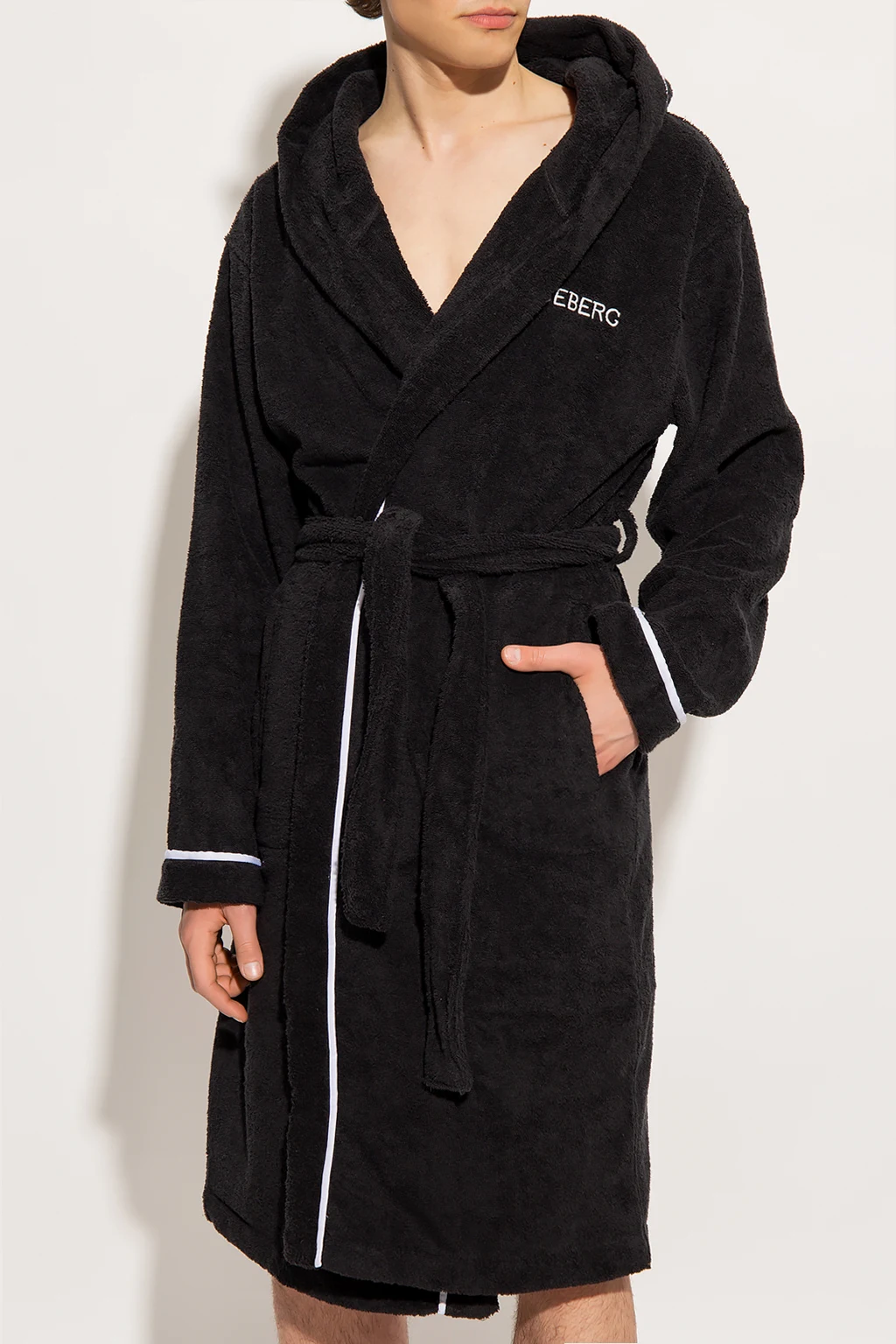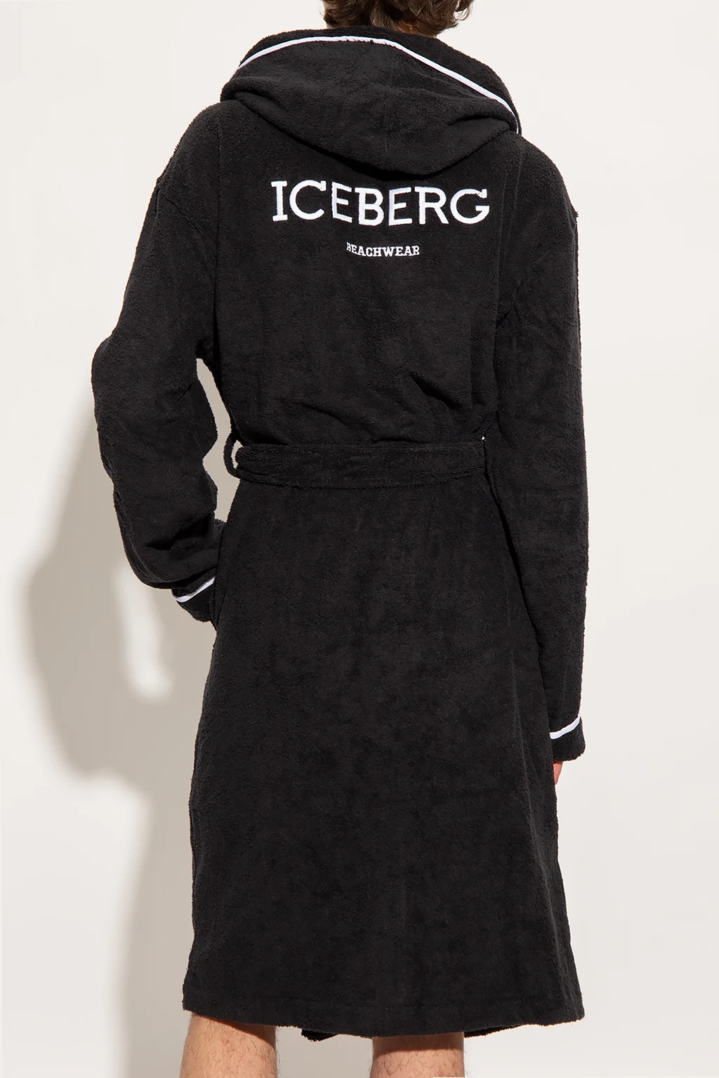 Black hooded bathrobe from Iceberg. Made of cotton, this design features a tie waist, embroidered logo pattern in white and two slip pockets.