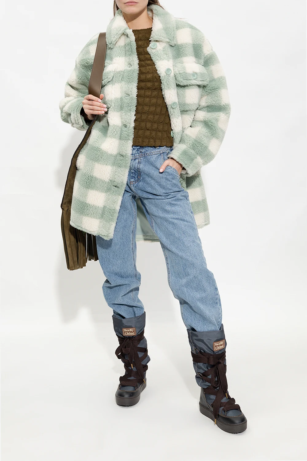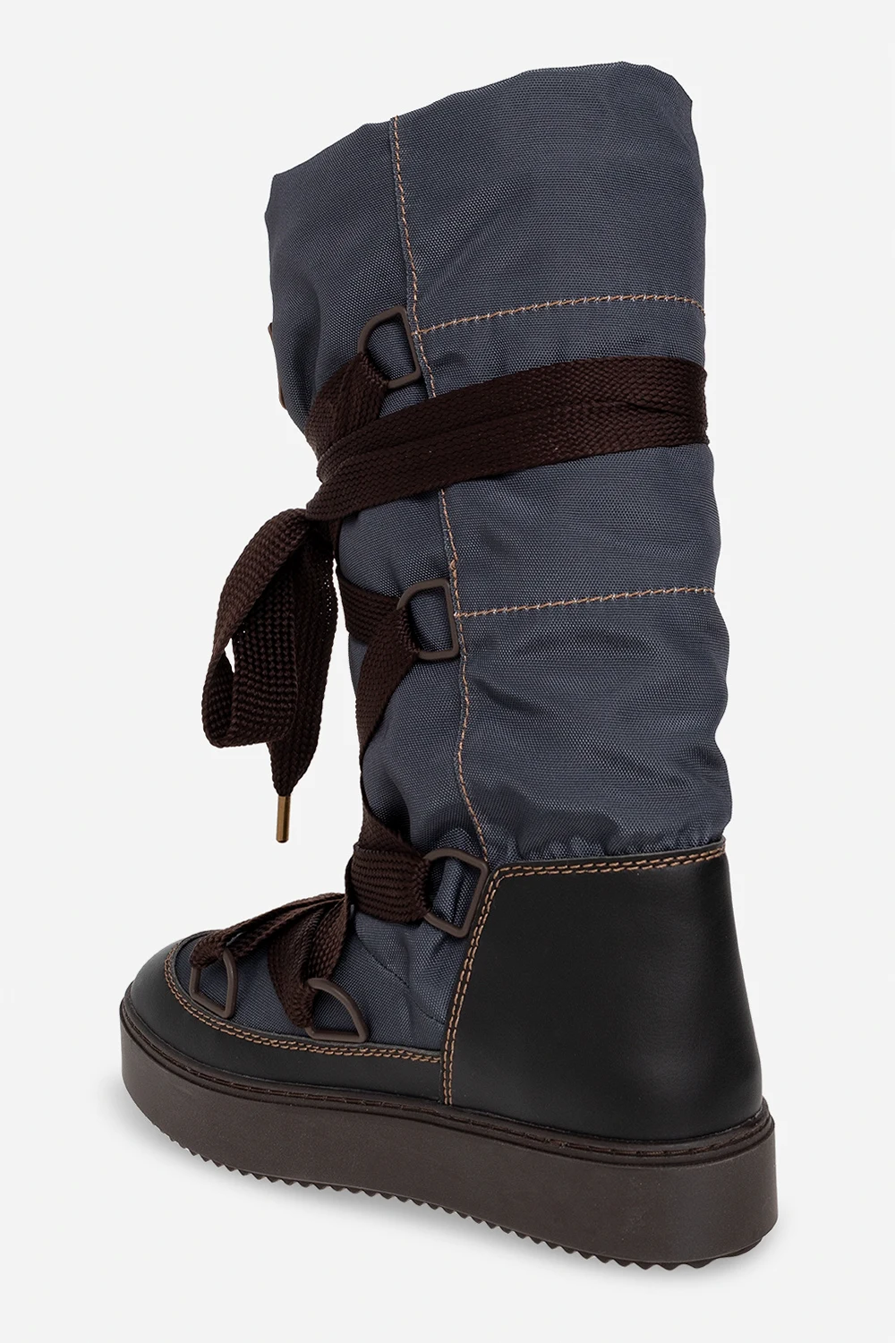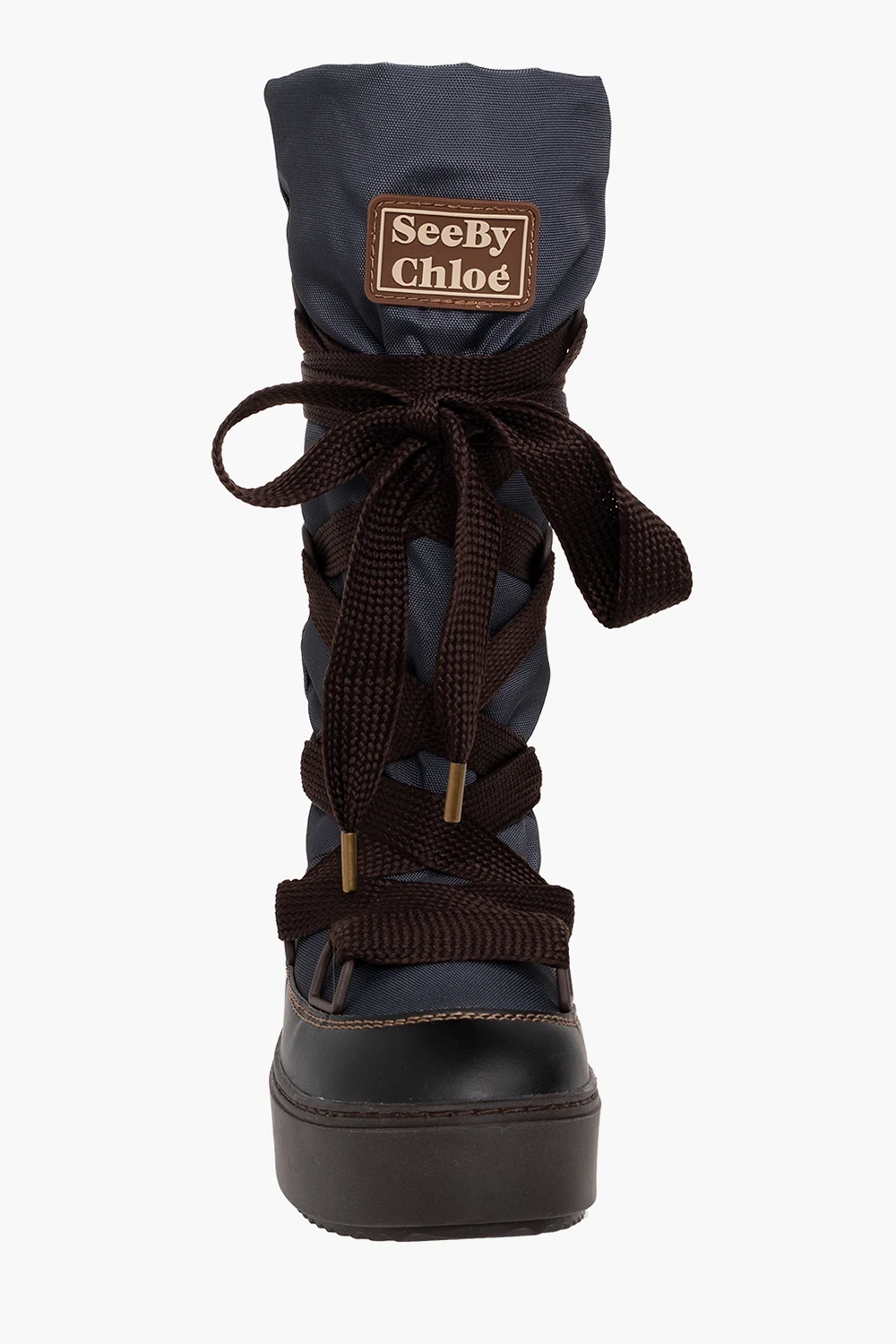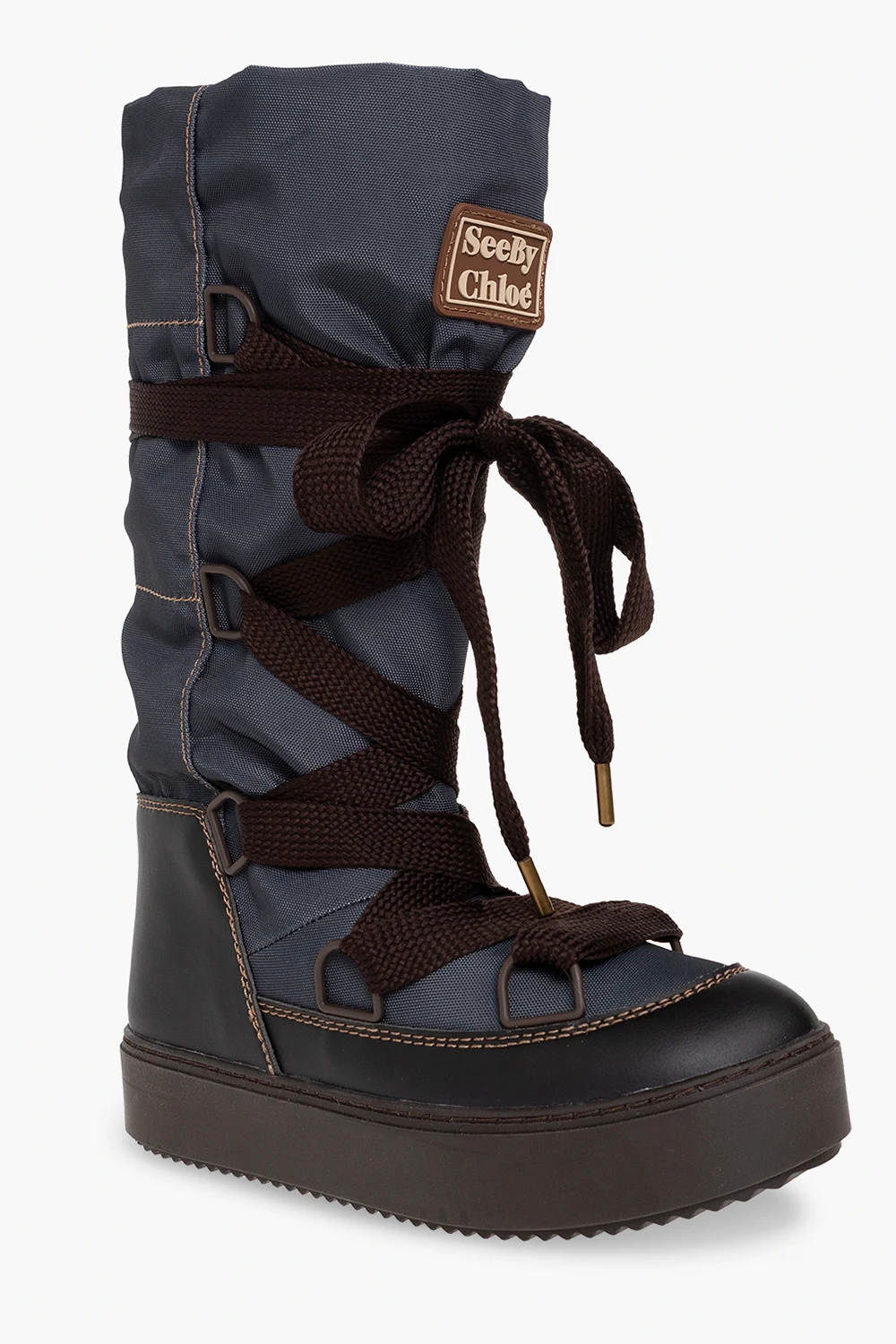 Dark grey and dark brown ‘Naina’ snow boots from See By Chloe. Crafted from recycled polyester, this lace-up model sits on a brown rubber sole and features faux leather trimming, a faux fur lining and a logo patch on the front.
