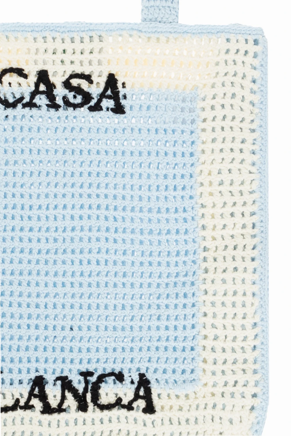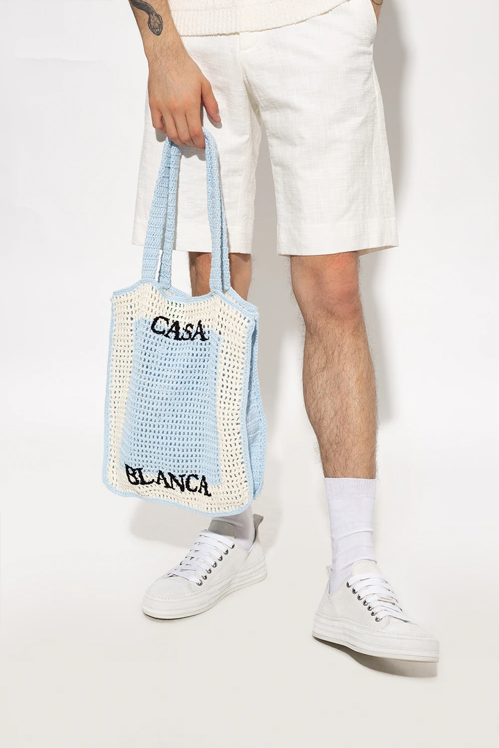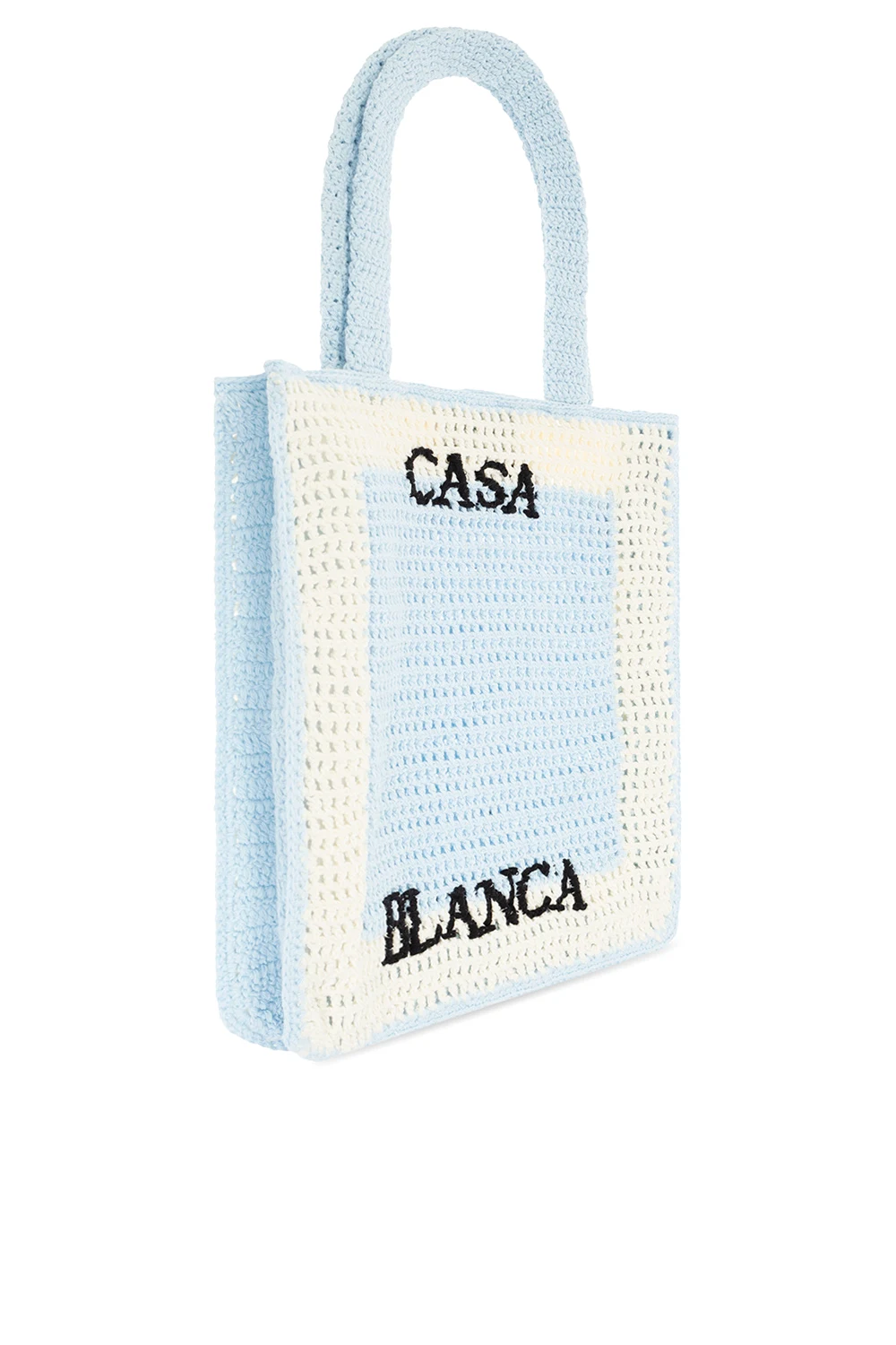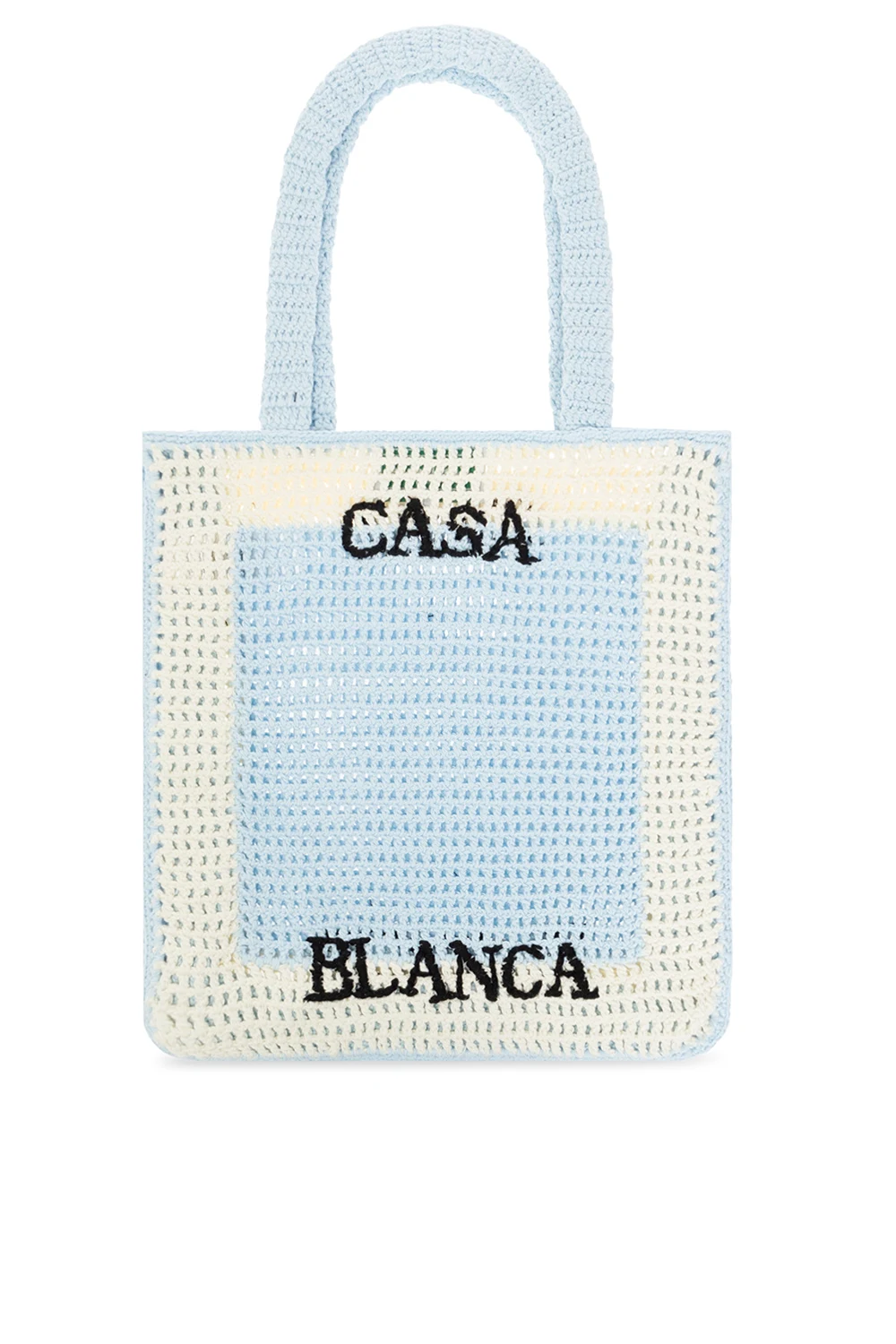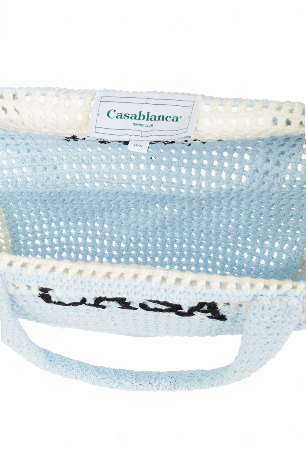 Blue and cream shopper bag from Casablanca. Crafted from cotton with a crochet finish, this design features two half-round handles and an embroidered black logo.