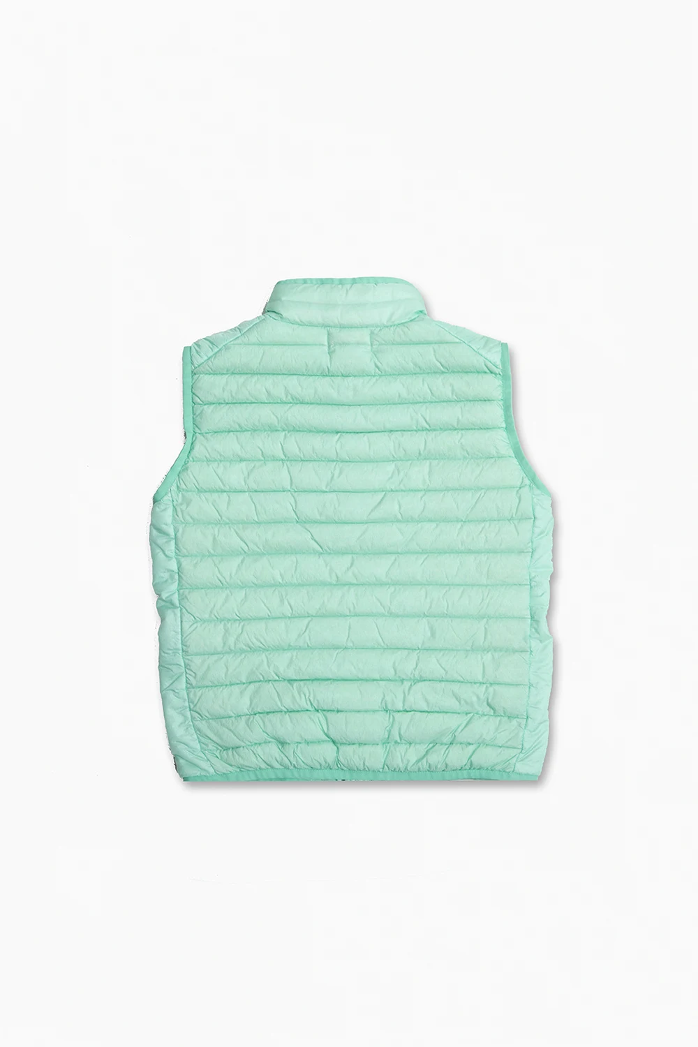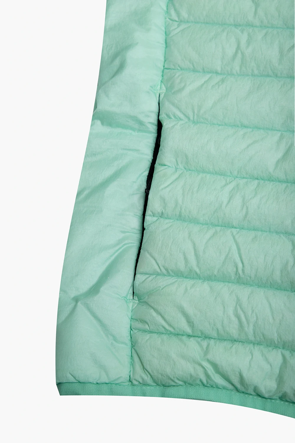 Green quilted jacket from Stone Island Kids. Emblazoned with a white and black logo patch, this style features a zip fastening, two zip pockets and an elasticated trim.