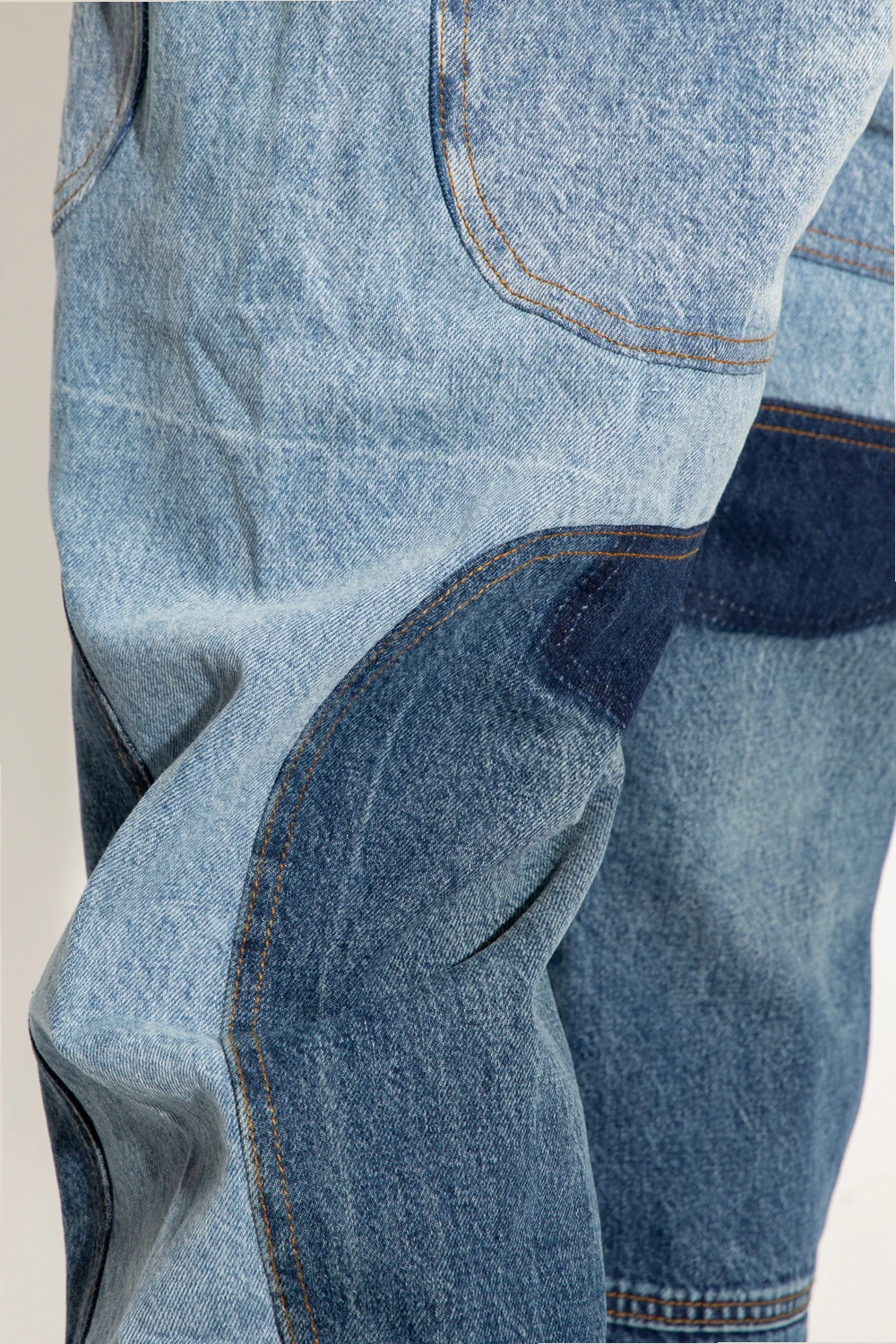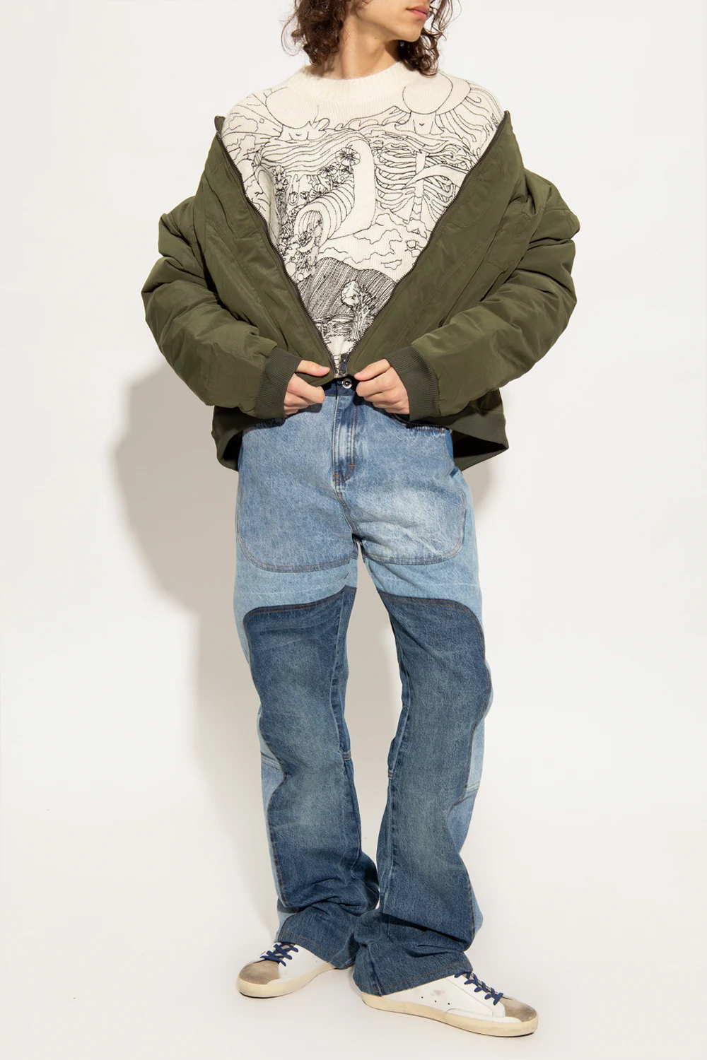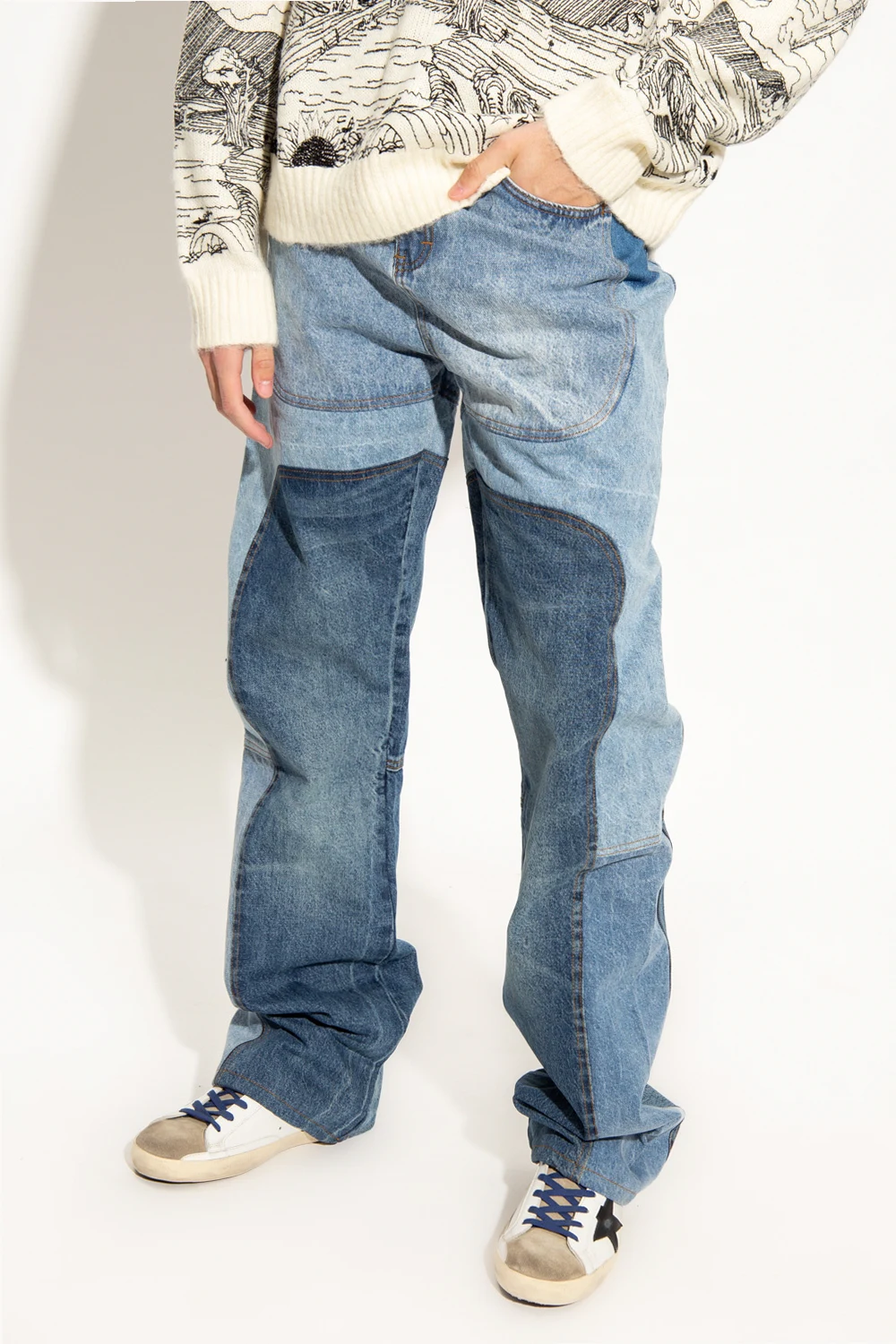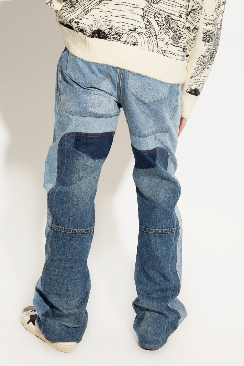 Blue ‘WDW Signature’ jeans from Who Decides War. Constructed from recycled denim panels, this pair features a relaxed silhouette with flared legs, a zip fly with a button, classic five pockets and a white and black logo patch at the back.