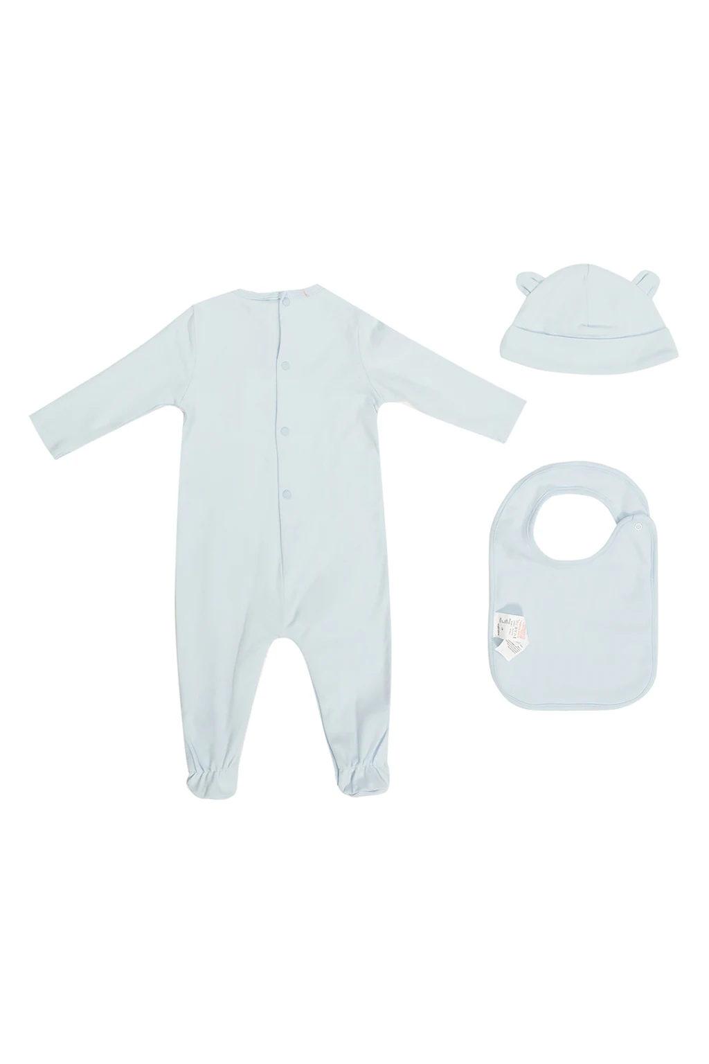Light blue romper suit, hat & bib set from Kenzo. Made of cotton, this set is decorated with a logo print. The romper suit features snap fastenings, a round neck and long sleeves.