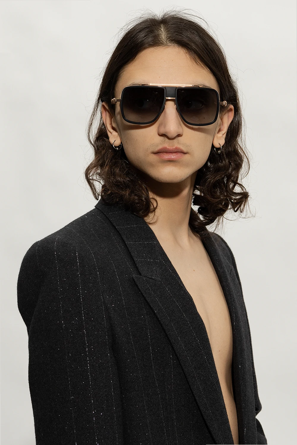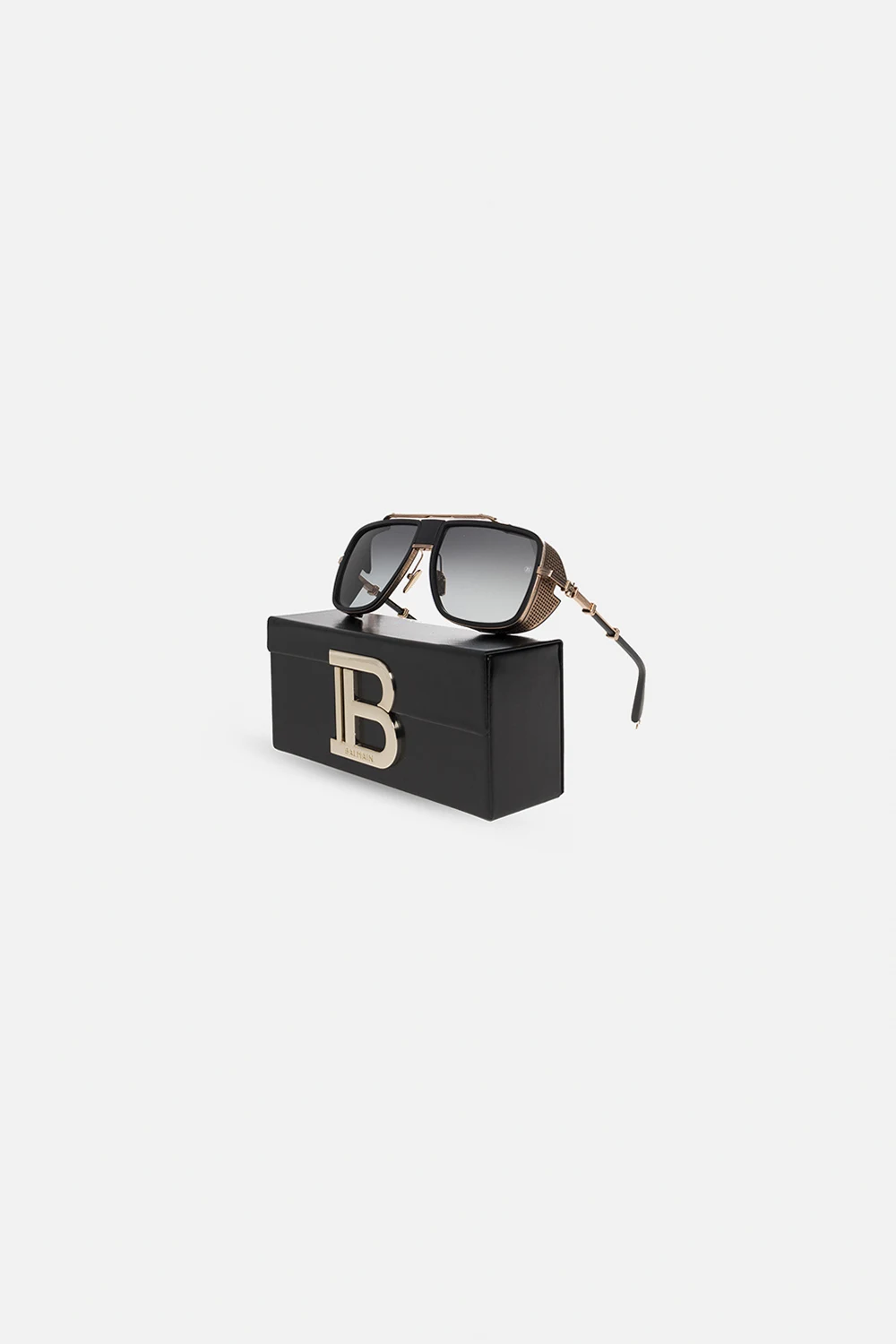 Black and brass-tone ‘O.R.’ sunglasses from Balmain. This aviator pair is made of matte materials and features vintage style elements with black titanium side shields, double bridge with a logo, adjustable nose pads, logo-shaped tips and grey gradient lenses with 100% UV protection. Comes with a case.