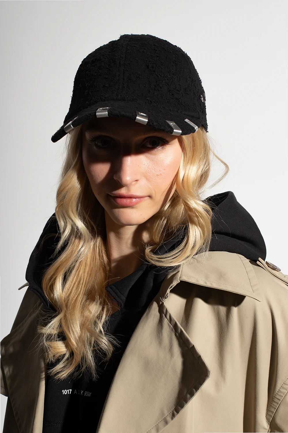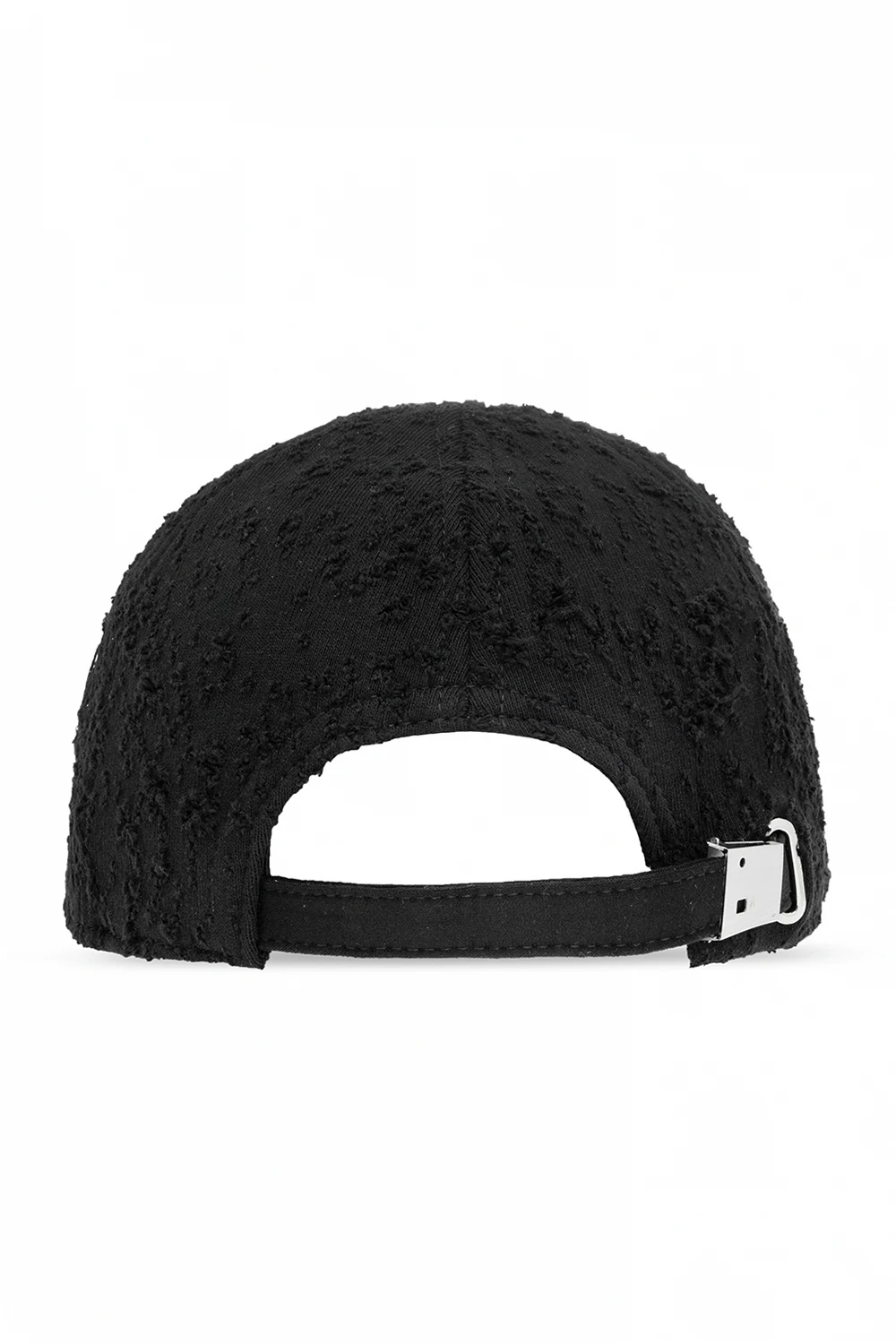 Black distressed baseball cap from 1017 ALYX 9SM. Crafted from cotton, this item features an adjustable strap with a metal buckle and visor with the label’s signature metal Lightercap appliqué in silver-tone.