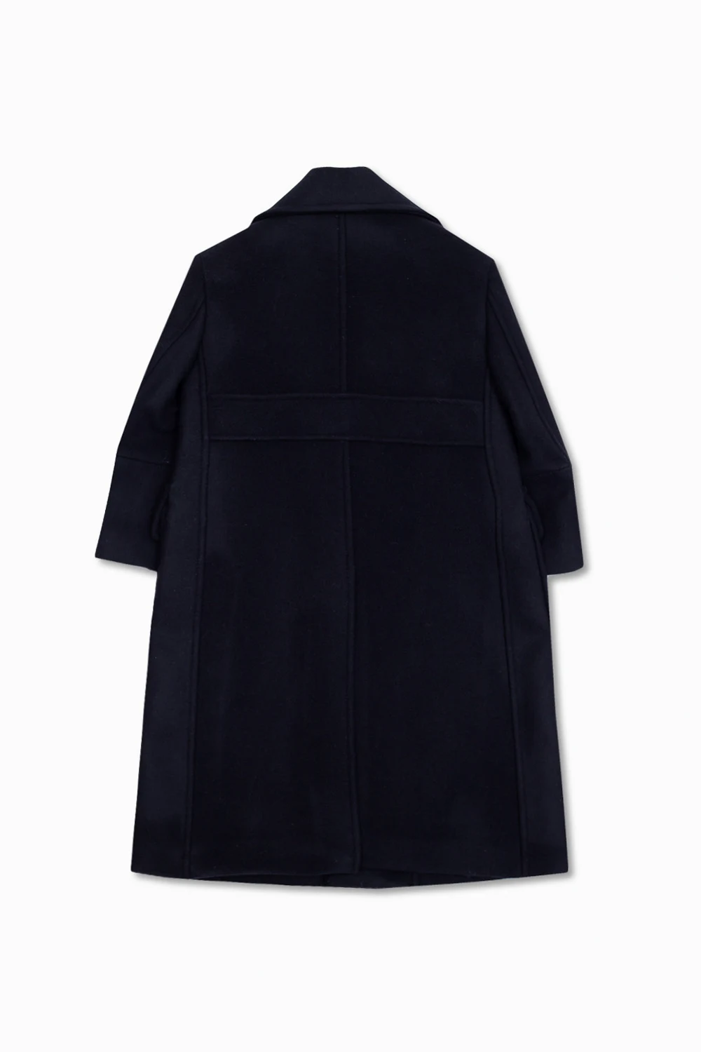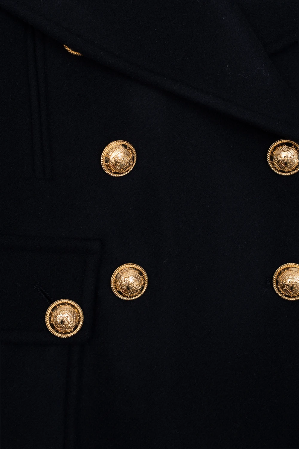 Black coat from Balmain Kids. Made of wool with a double-breasted silhouette, this style features decorative gold-tone buttons, two slip pockets, two flapped pockets with buttons, long sleeves and a single back vent.