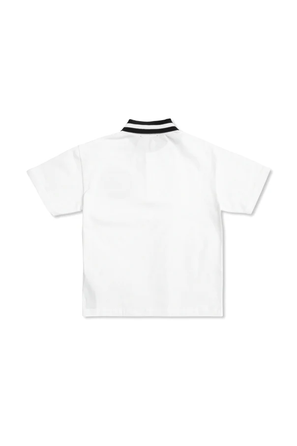 This Balmain Kids white polo epitomizes refined youthfulness and sophisticated style. Crafted from premium textured knit cotton, it presents a timeless straight silhouette with short sleeves for ultimate comfort. The crisp white foundation is dramatically contrasted by a structured black collar, adorned with elegant dual white stripes, imbuing the shirt with a distinctly modern and luxurious appeal.