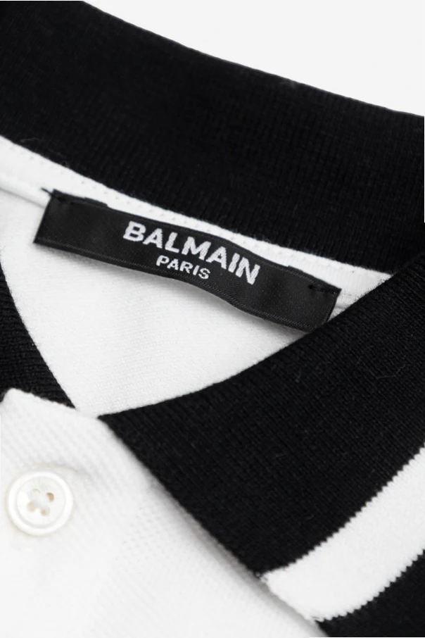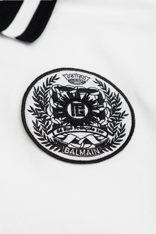 A prominent, exquisitely embroidered circular patch graces the left chest, featuring the signature BALMAIN PARIS crest, detailed with ornate laurel leaves and a regal crown. Inside the collar, a discreet black BALMAIN PARIS label asserts the garment’s prestigious designer heritage. This polo’s immaculate design and subtle detailing transform a classic staple into an exceptional statement piece.