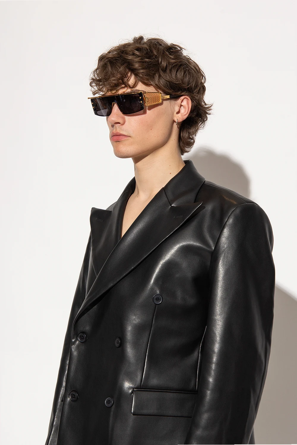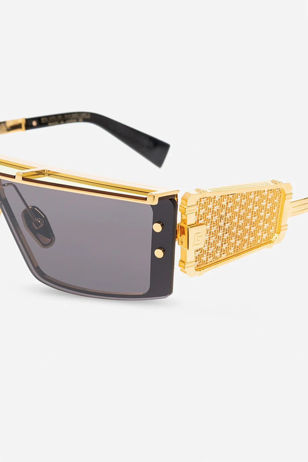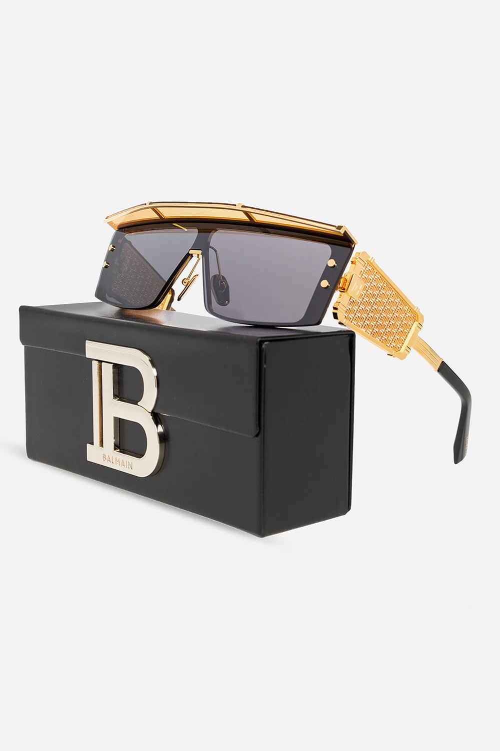 Gold-tone and black ‘Wonder Boy III’ sunglasses from Balmain. Made of titanium, this pair features a metal gold-tone visor with yellow glass, monogram pattern on the temples and grey lenses with anti-reflective coating and 100% UV protection. Comes with a case.