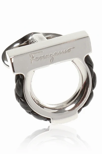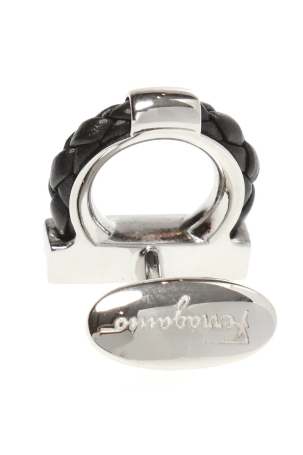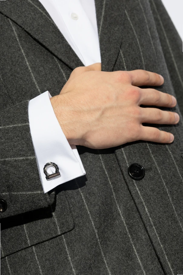 Silver-tone cuff links with ‘Gancini’ motif from Salvatore Ferragamo. They feature black braided calf leather accent and an embossed logo.