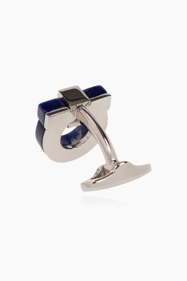 Silver-tone cuff links from Salvatore Ferragamo. Made of brass, they showcase engraved logos and Gancini appliqués encrusted with navy blue semi-precious stones.