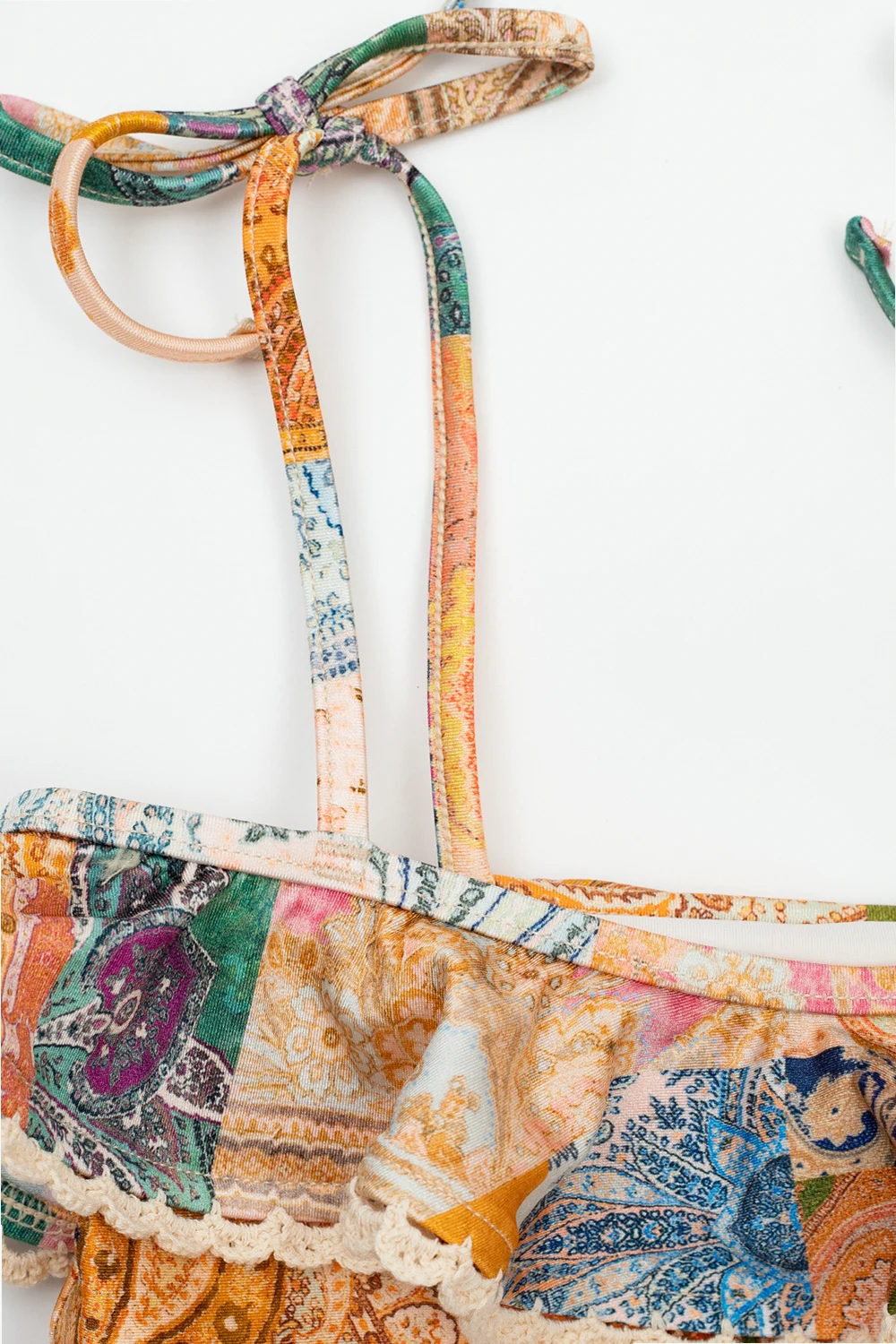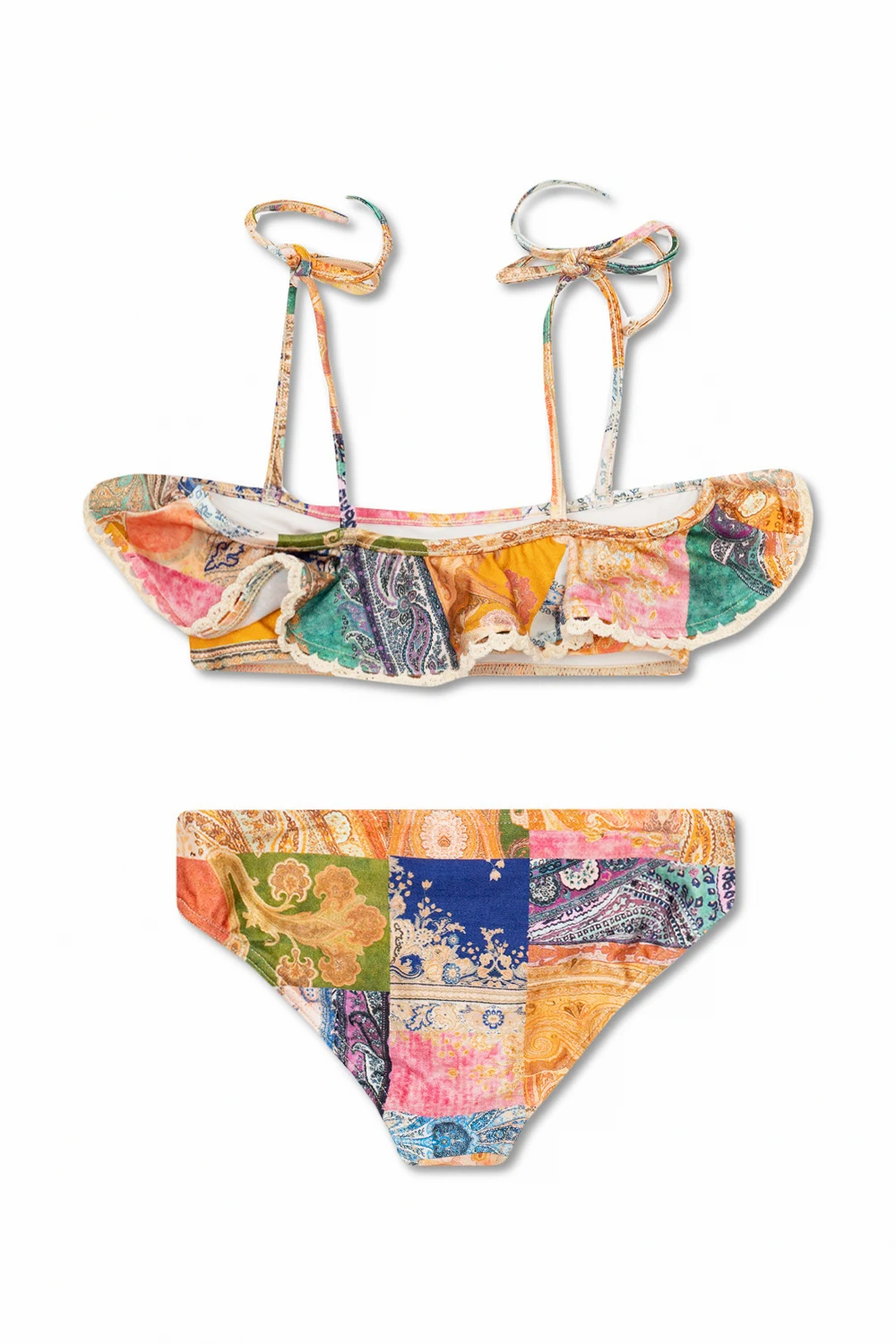 Multicolored patterned bikini with shoulder straps and a lace-trimmed ruffle from Zimmermann Kids.