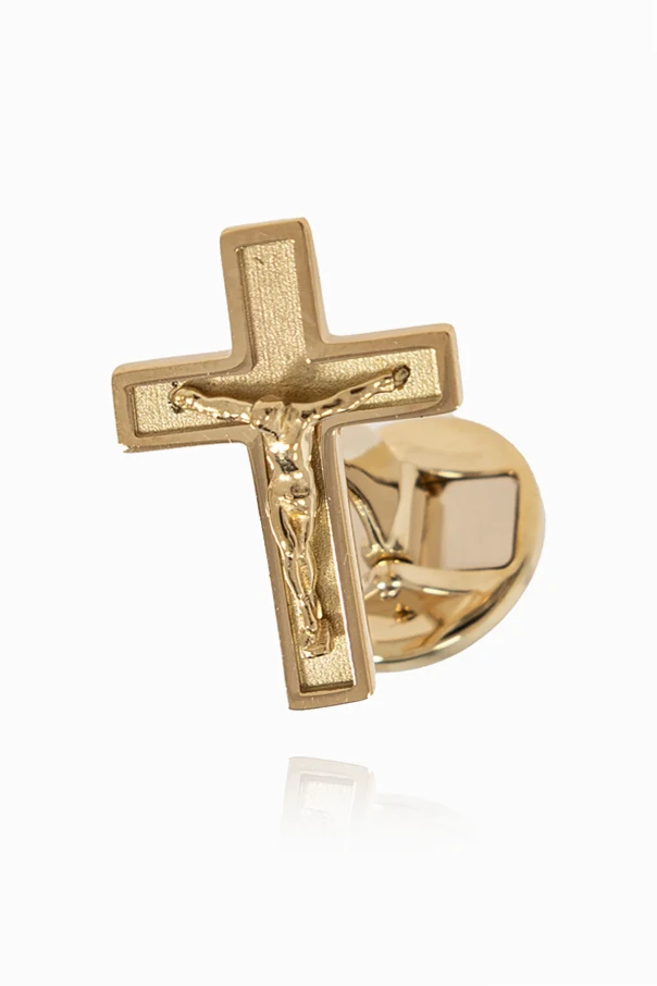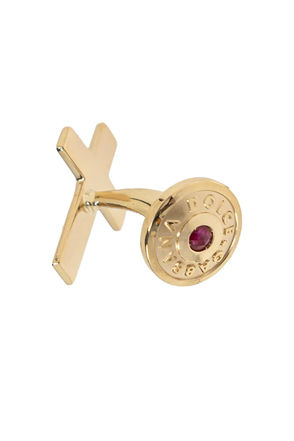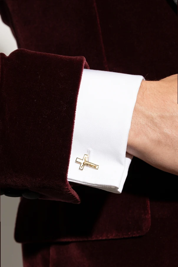 The cufflinks are exquisitely shaped into crosses , embodying a timeless and symbolic design. Subtly engraved with intricate details, the crosses exhibit a harmonious blend of polished and satin finishes, adorned with a depiction of Christ, making them a true work of art. The rear side of each cufflink is engraved with the illustrious Dolce & Gabbana name, accentuated by a delicate red ruby, further enhancing their exclusivity.