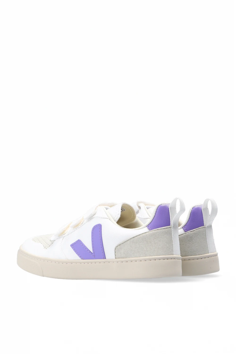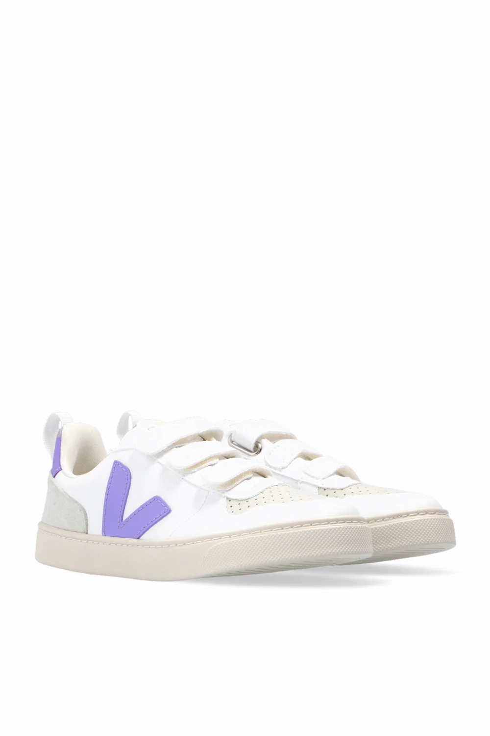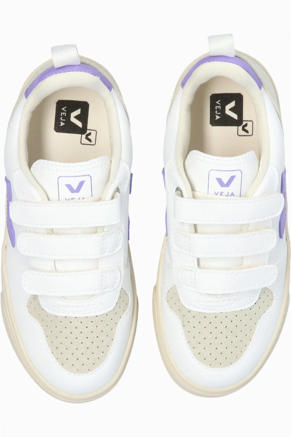 White and light grey ‘V-10 C.W.L.’ sneakers from Veja Kids. Crafted from textured organic cotton covered with resin from corn & castor oil – C.W.L. (Cotton Worked as Leather), and trimmed with vegan suede, this pair features velcro fastening, a purple logo printed on the tongue, perforations and the label’s signature V logo in purple made of rubber and rice waste. The mesh inner lining made from recycled materials was developed to acquire a better resistance to friction. The organic-sourced and recycled insole is made from sugar cane, Amazon rubber, organic cotton and recycled EVA foam. It is set on a cream rubber sole made of organic and recycled materials.