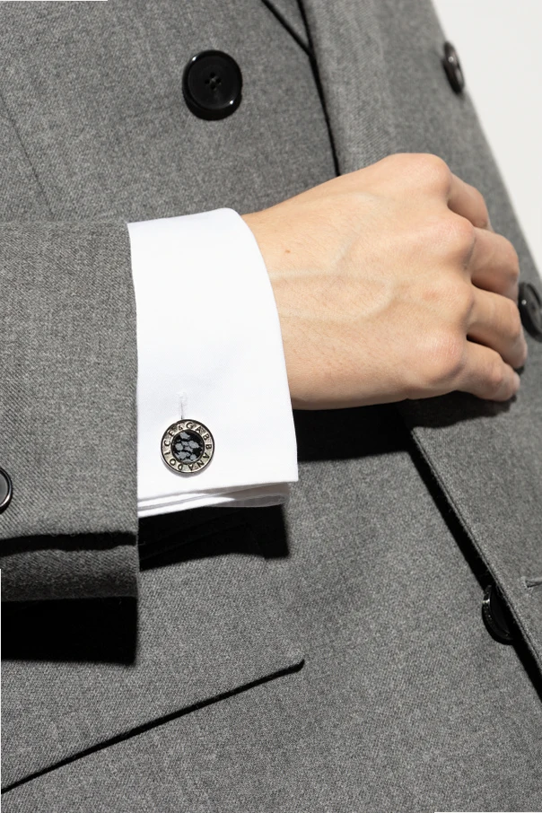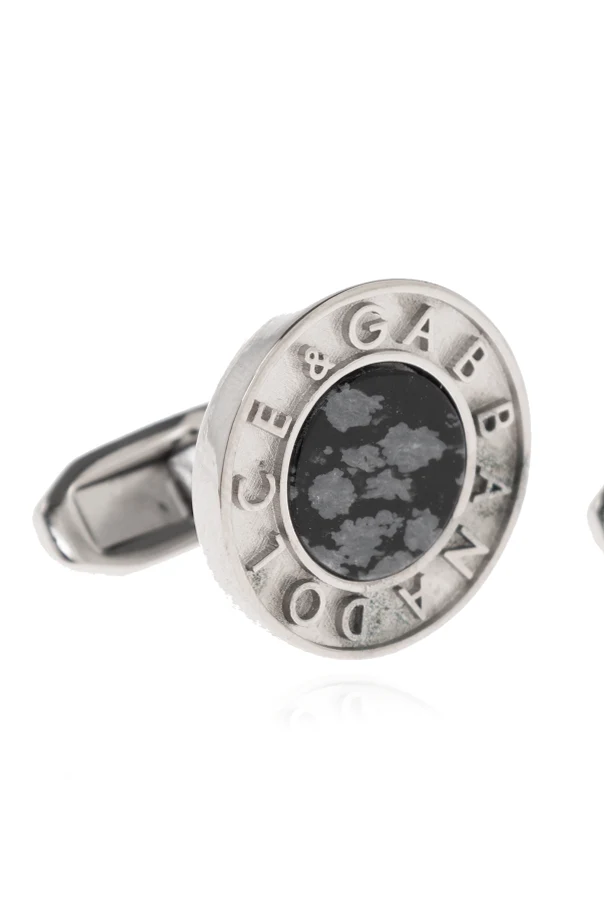 Exquisitely tailored for the discerning gentleman, these Dolce & Gabbana cufflinks epitomize refined sophistication. Meticulously crafted from lustrous silver-toned metal, their classic round silhouette is elevated by a distinguished, marbled centerpiece—evoking the allure of snow obsidian—set in subtle gray hues. The central inlay, composed of either natural stone or a premium imitation, is embraced by a wide polished bezel, intricately engraved with the unmistakable Dolce & Gabbana logo, a hallmark of true luxury.