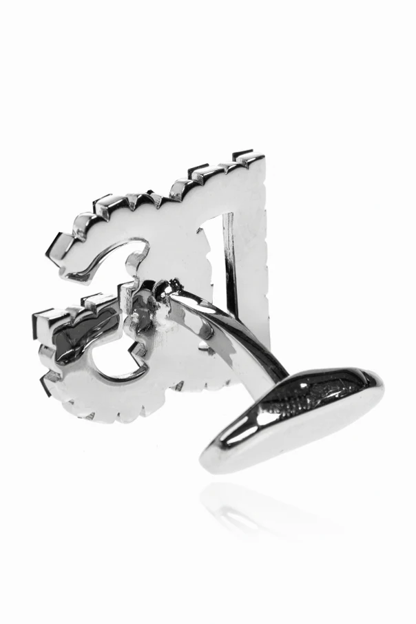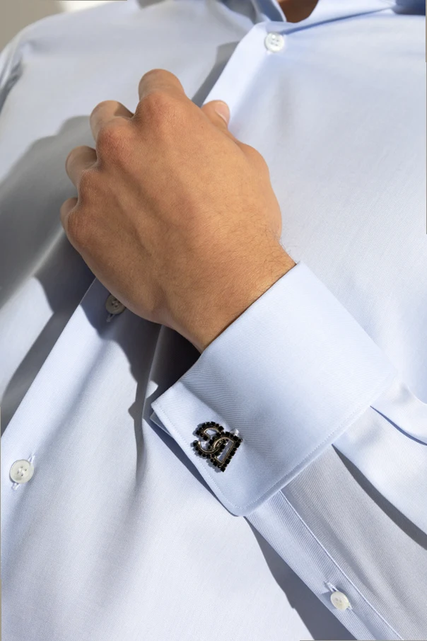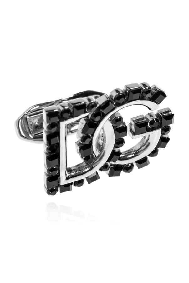 Elevate your formal attire with these Dolce & Gabbana cufflinks , exquisitely sculpted into the iconic “DG” monogram. The bold, geometric silhouette is defined by a luminous, silvery metal, meticulously adorned with sophisticated black accents—striking decorative stones precisely set along the contours to evoke refined opulence.