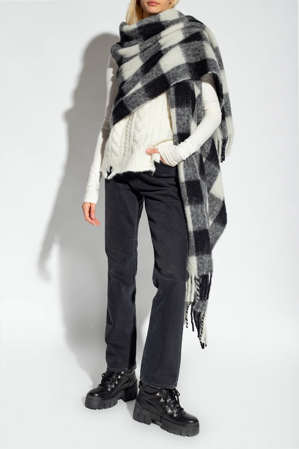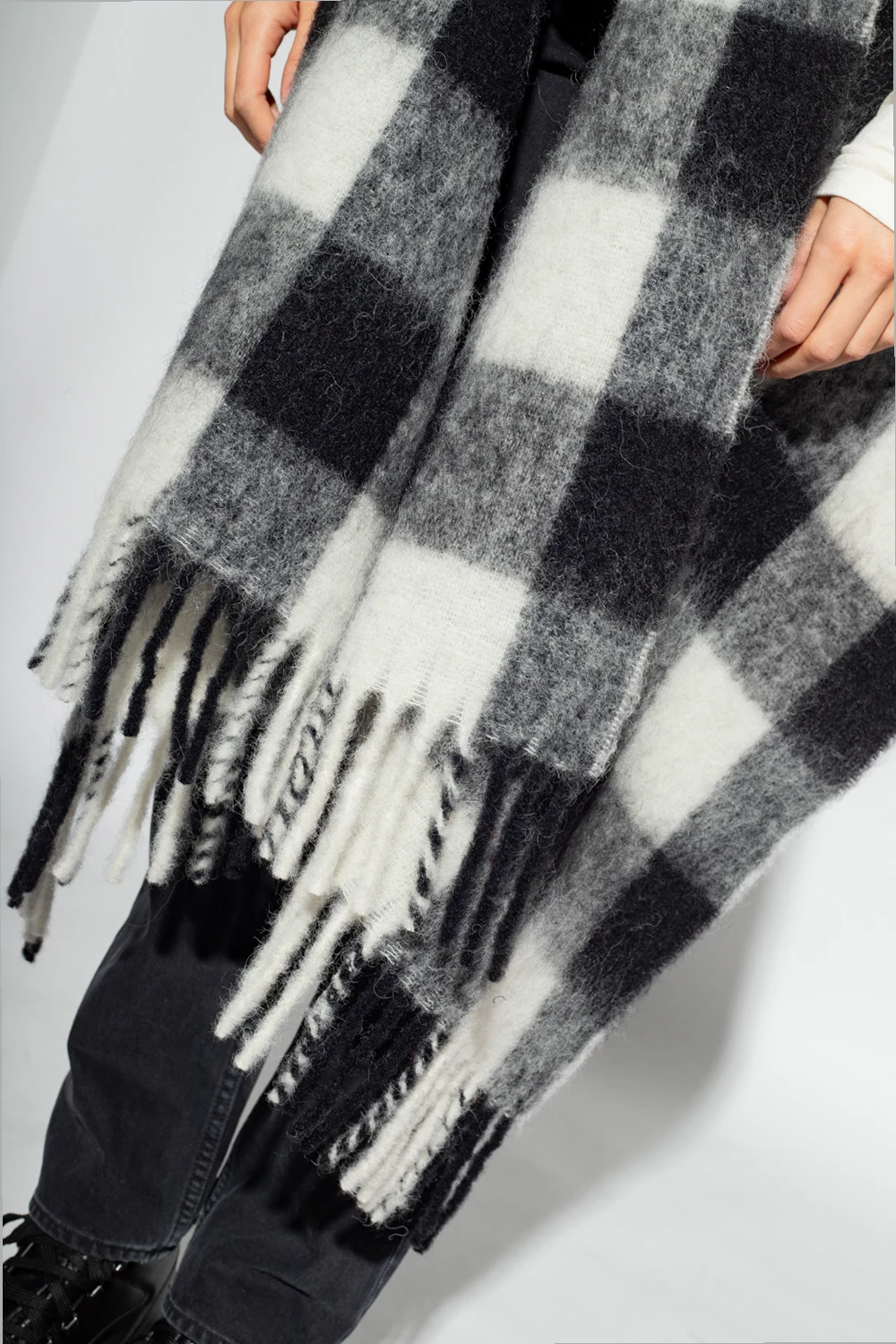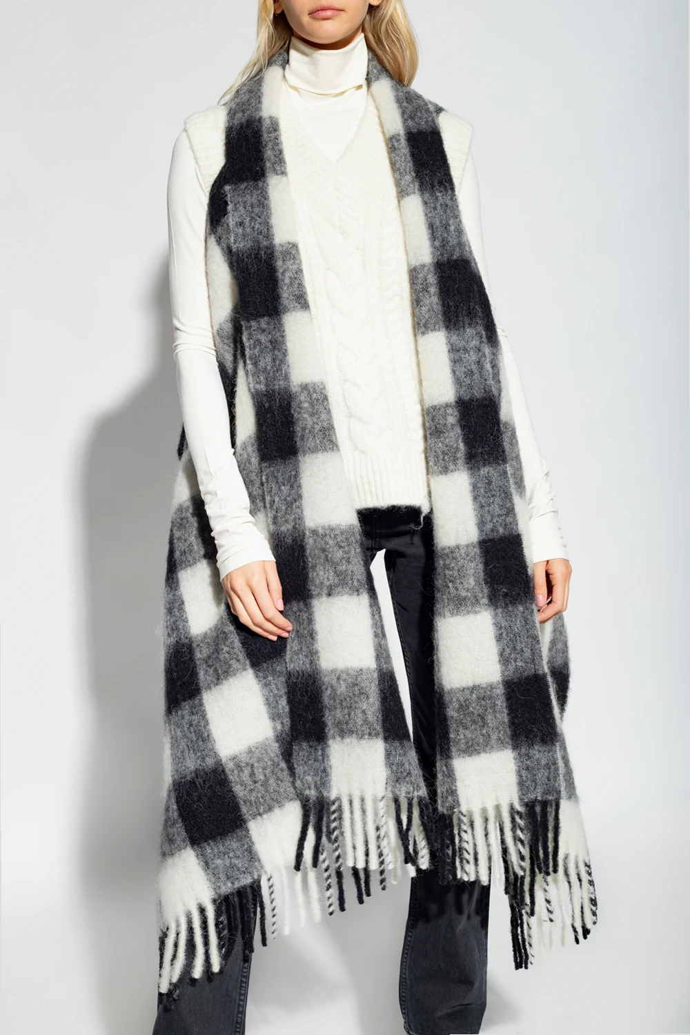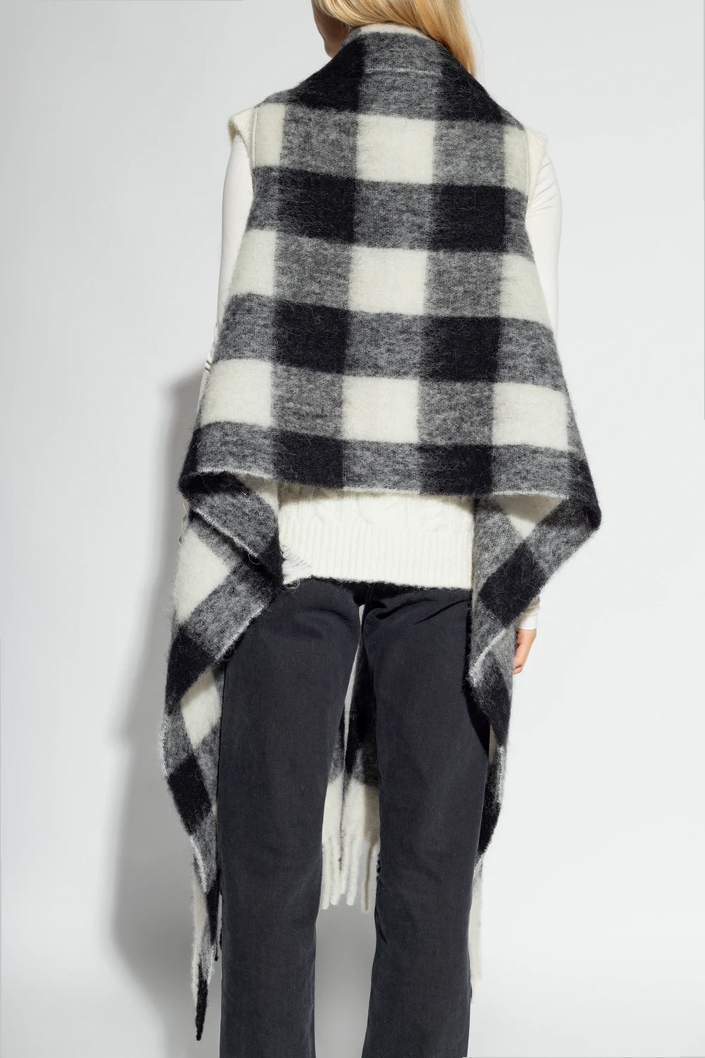 Black, grey and white vest from Woolrich. Crafted from an alpaca, mohair and wool blend, this item is enriched, by a check pattern and fringed scarf.
