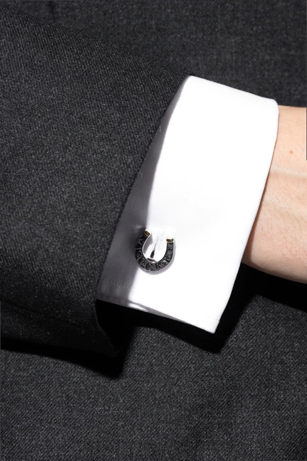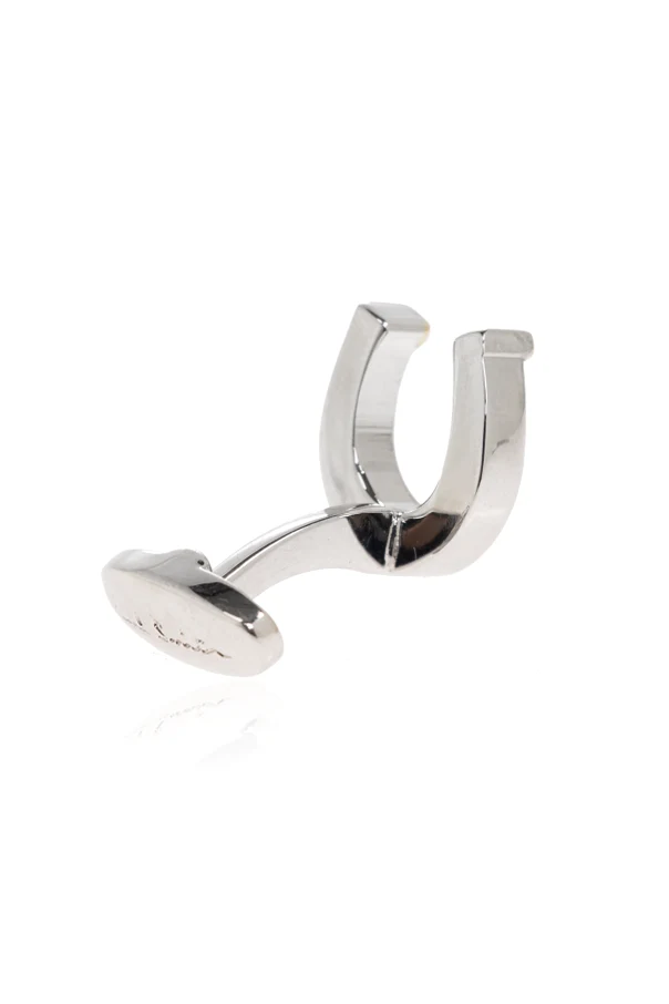Impeccably crafted by Paul Smith , these horseshoe motif cufflinks epitomize refined sophistication and distinctive British charm. Their recognizable silhouette, symbolizing fortune and elegance, is elevated by a high-gloss silver-toned finish, meticulously sculpted from polished brass. The design is accentuated with gold-toned tips , offering a subtle dual-tone allure that sets them apart in discerning wardrobes.