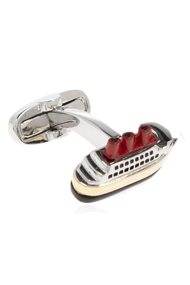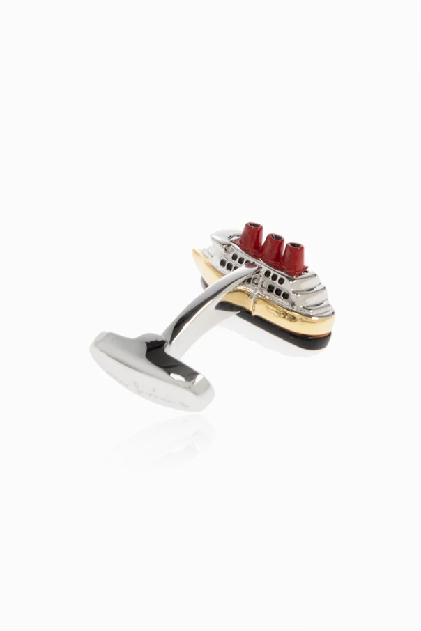 Discover a sophisticated maritime accent with these Paul Smith Ship Motif Cufflinks , exquisitely crafted for the discerning gentleman. The timeless silhouette, reminiscent of a grand passenger ship, is meticulously rendered in highly polished silver-tone metal, enhanced by bold black and vivid red enamel chimneys. A refined gold band elegantly lines the waterline, complementing the intricate round portholes and detailed superstructure.