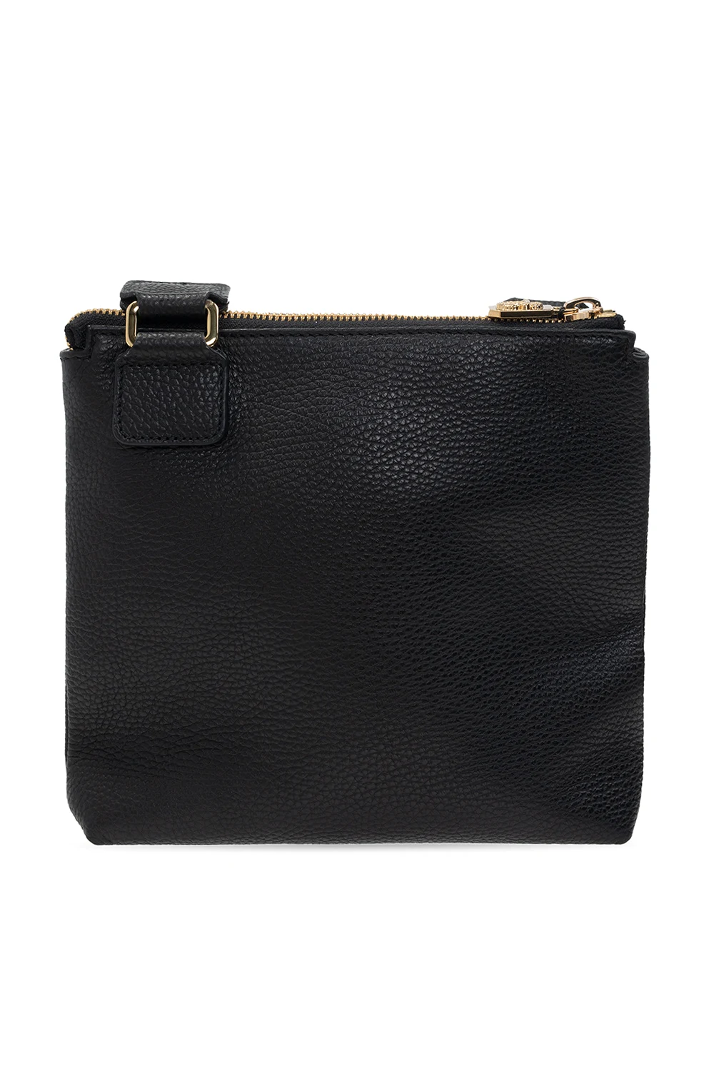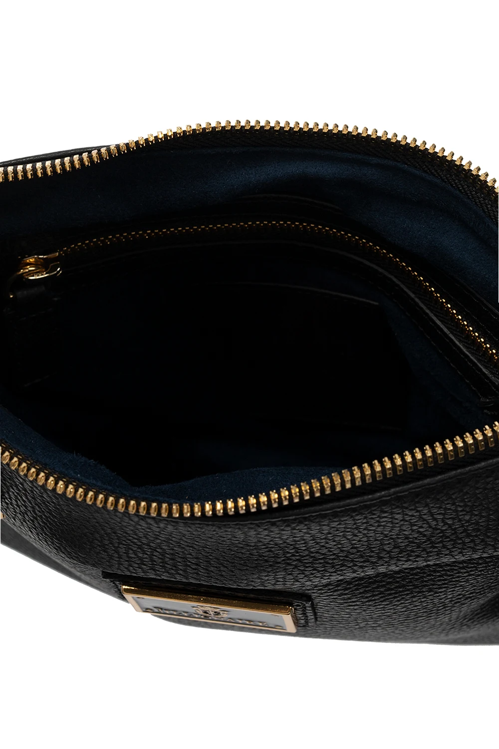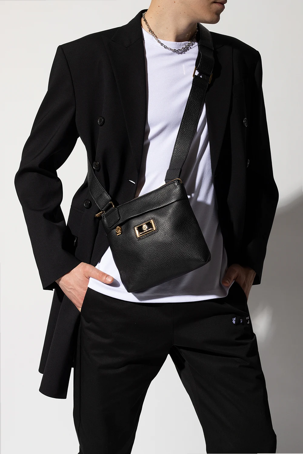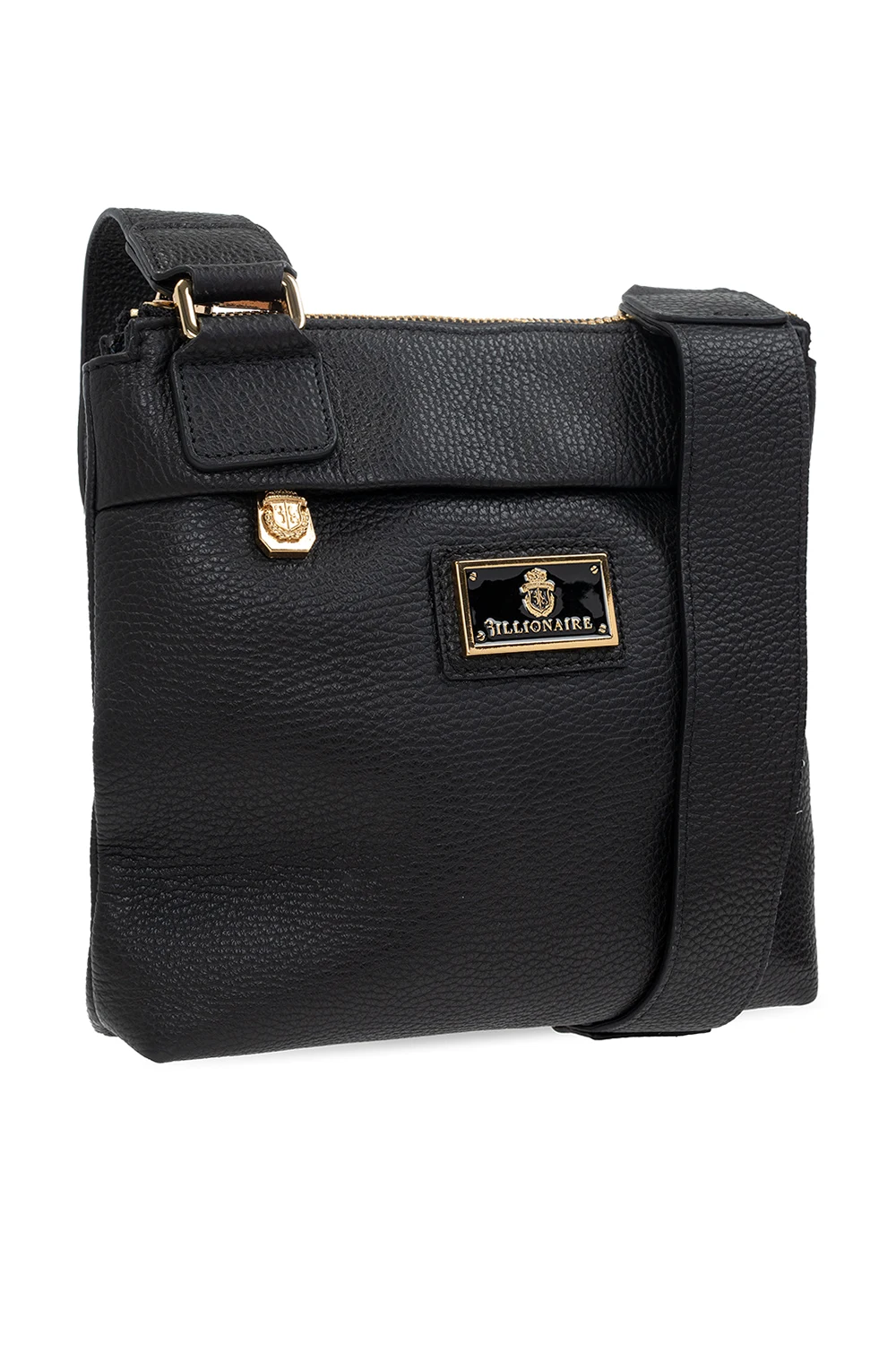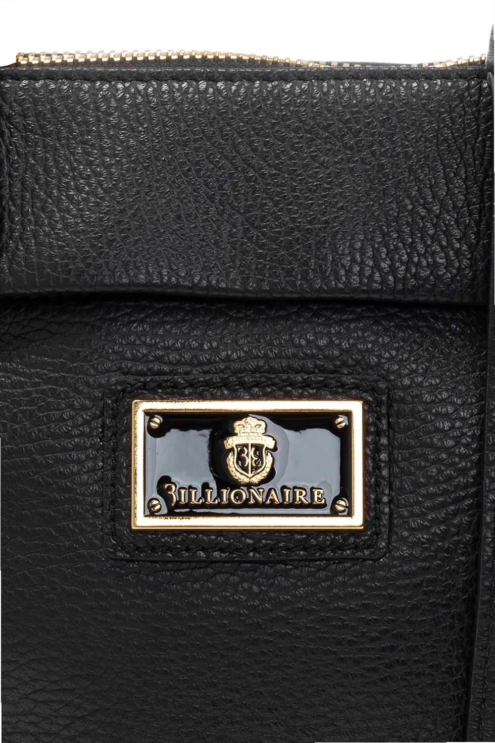 Black shoulder bag from Billionaire. Crafted from calf leather, this design fastens with a zip and is decorated with a logo detail. It is complete with a front zip pocket, adjustable shoulder strap, gold-tone metal hardware and one internal compartment with navy lining, one zip pocket and one slip pocket.