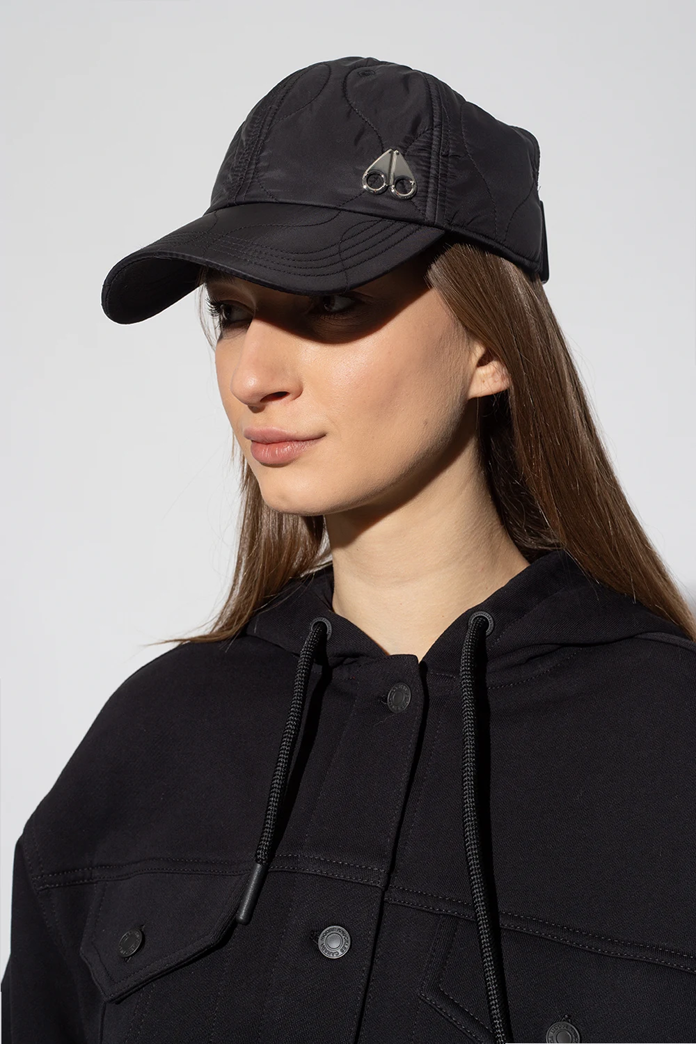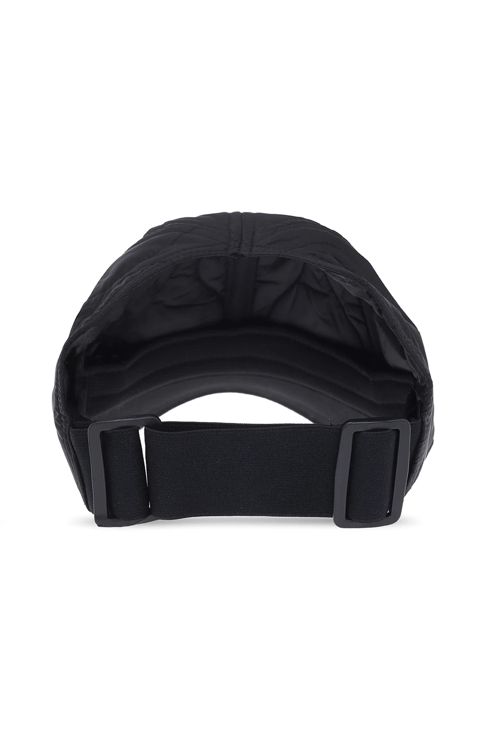 Black quilted baseball cap from Moose Knuckles. Made of recycled materials, this model features a silver-tone logo appliqué, elasticated strap with a snap closure at the back and decorative cut-outs.