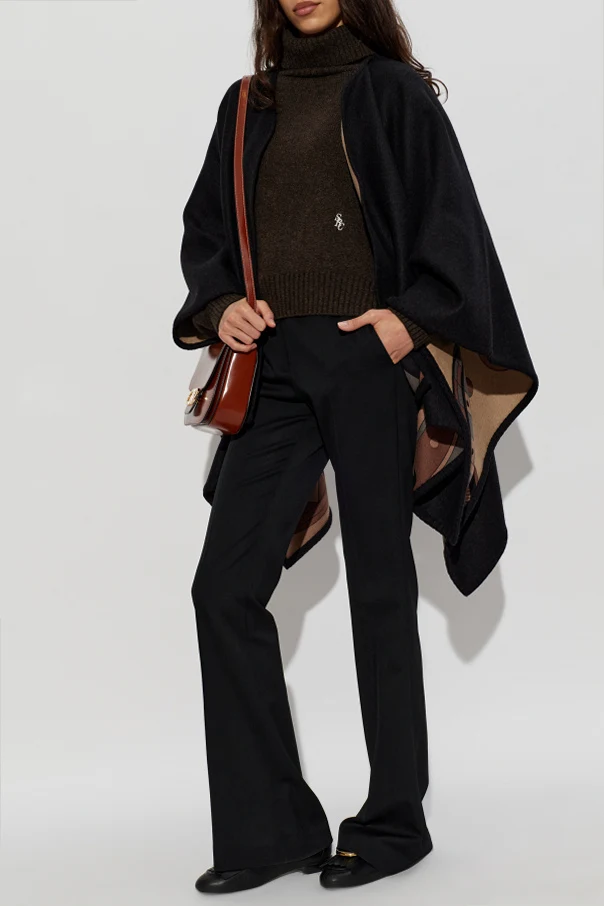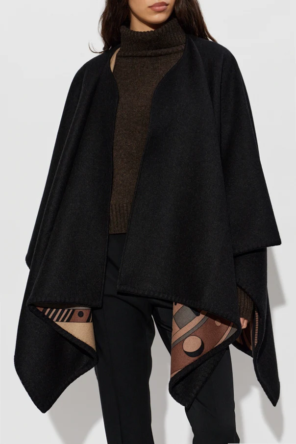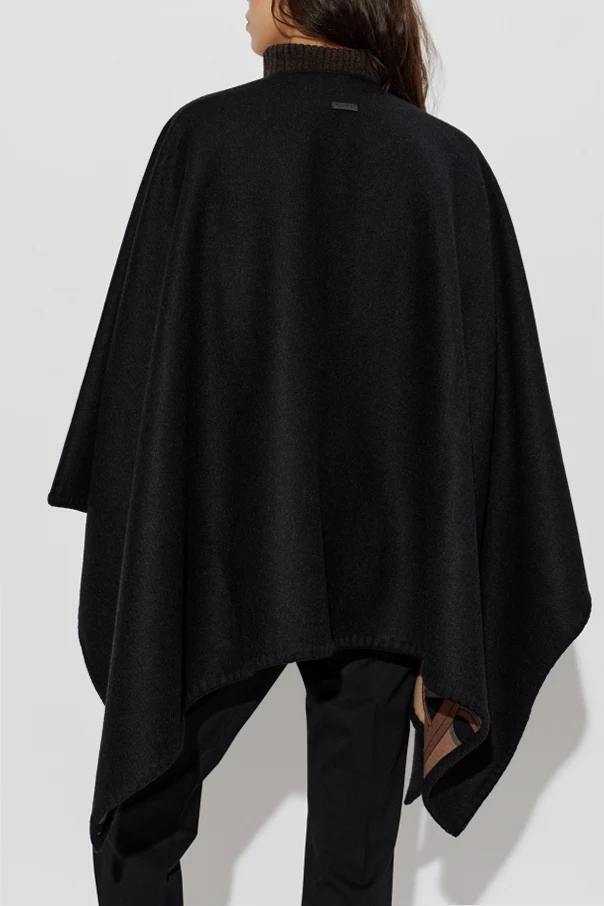 Envelop yourself in timeless elegance with this exquisite black turtleneck poncho by Ferragamo. Designed with a free-flowing, open silhouette, this refined layer drapes effortlessly over the shoulders, creating a subtly asymmetrical line for a modern sense of movement.