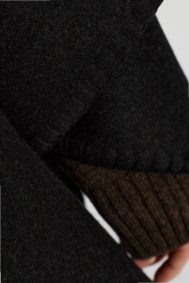 The exterior showcases a smooth, matte black surface, while the interior and borders are adorned with a striking geometric motif in shades of brown, beige, and black—an artful detail that distinguishes this piece as truly exclusive. Luxuriously crafted from a sumptuous blend of cashmere and fine wool, the material feels exceptionally soft and substantial against the skin, ensuring both warmth and sophisticated comfort.