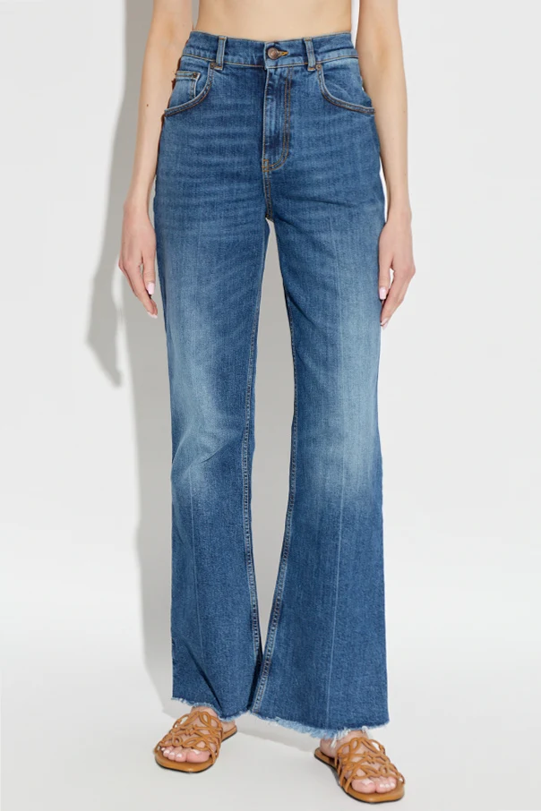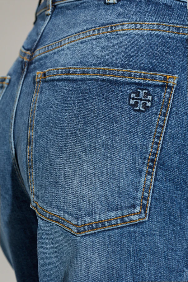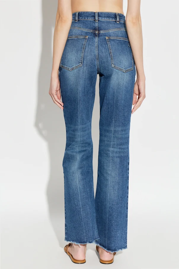 Experience timeless sophistication with these bootcut jeans by Tory Burch , exquisitely crafted for a refined, feminine silhouette. Rendered in a supple, stretch-infused denim, their medium blue hue is artfully distressed at the thighs and knees, lending a modern yet effortless allure. The high-rise waist accentuates the figure, while the leg elongates in a graceful flare from knee to hem, finished with a raw, unclipped edge for contemporary character.