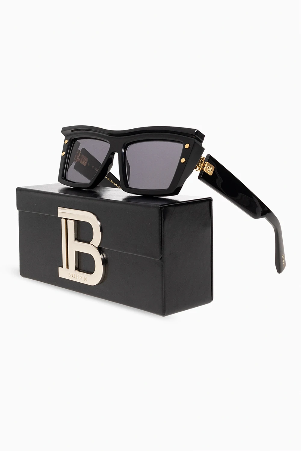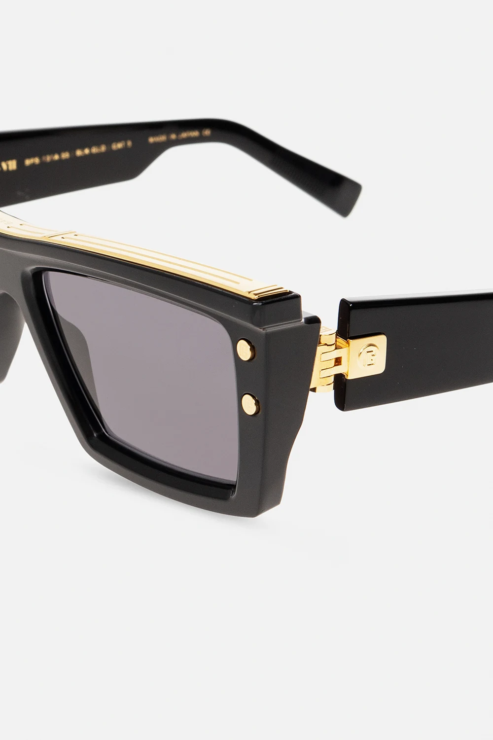 Black and gold-tone ‘B-VII’ sunglasses from Balmain. This pair has rectangular frames made of matte acetate, titan element with a logo, monogram studs on the front, wide temples with decorative hinges and dark grey gradient lenses with UV protection. Comes with a case.