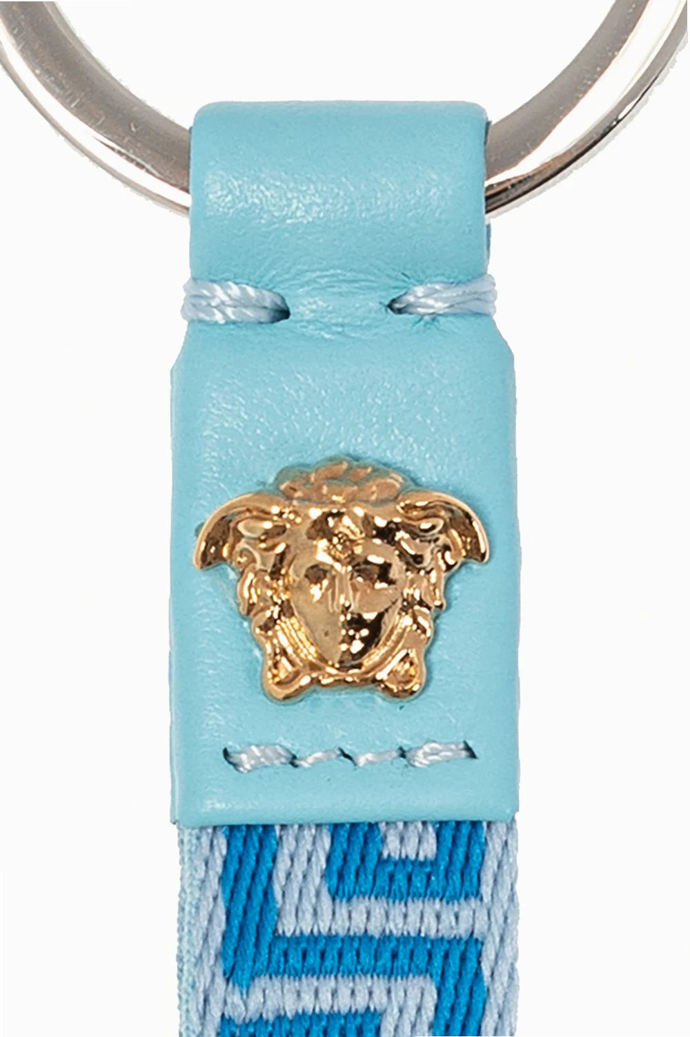 Blue keyring with a strap from Versace. This item features an embroidered pattern, silver-tone and gold-tone metal hardware and the iconic raised Medusa head appliqué.