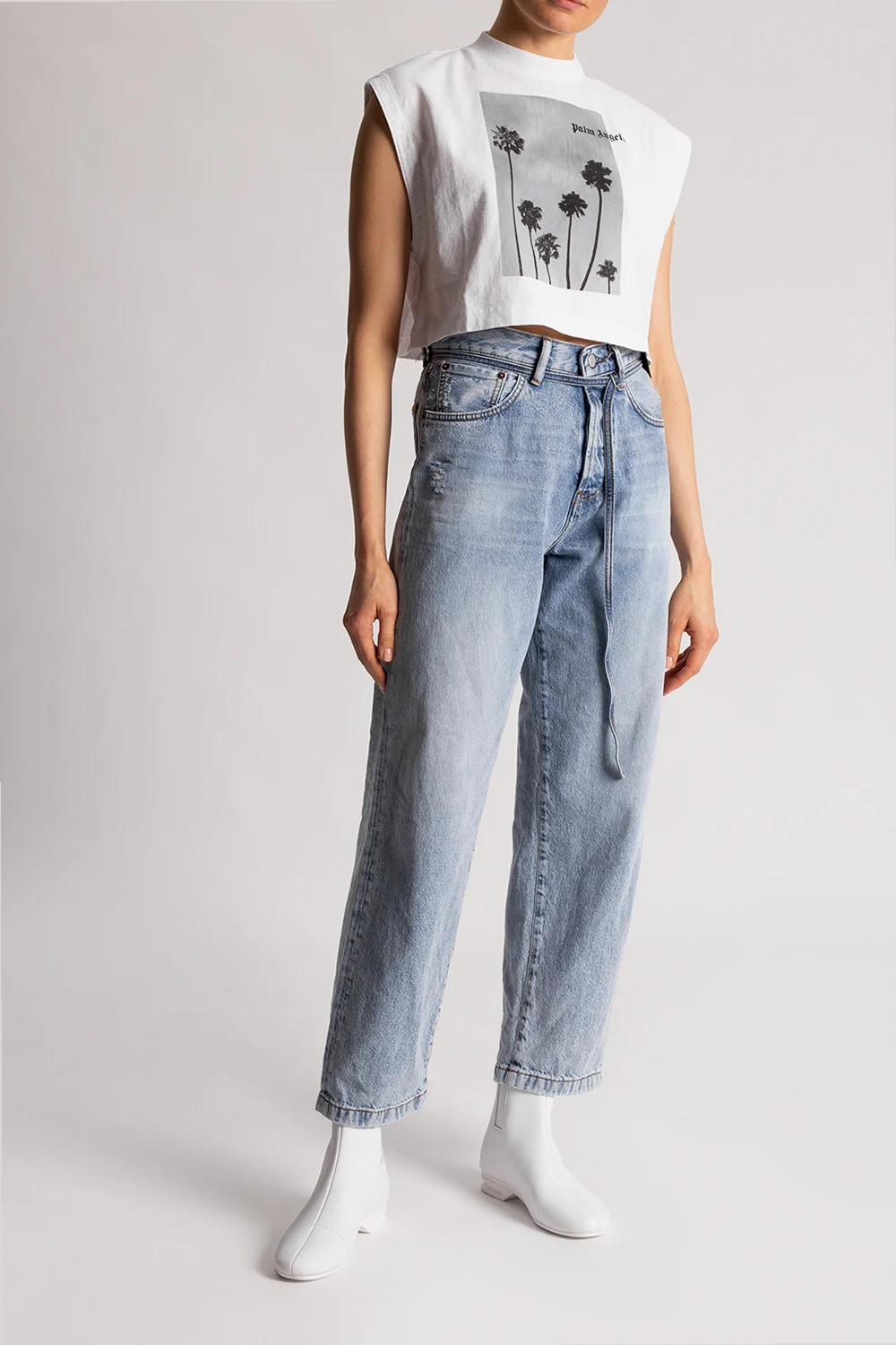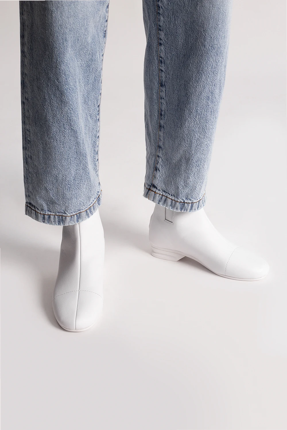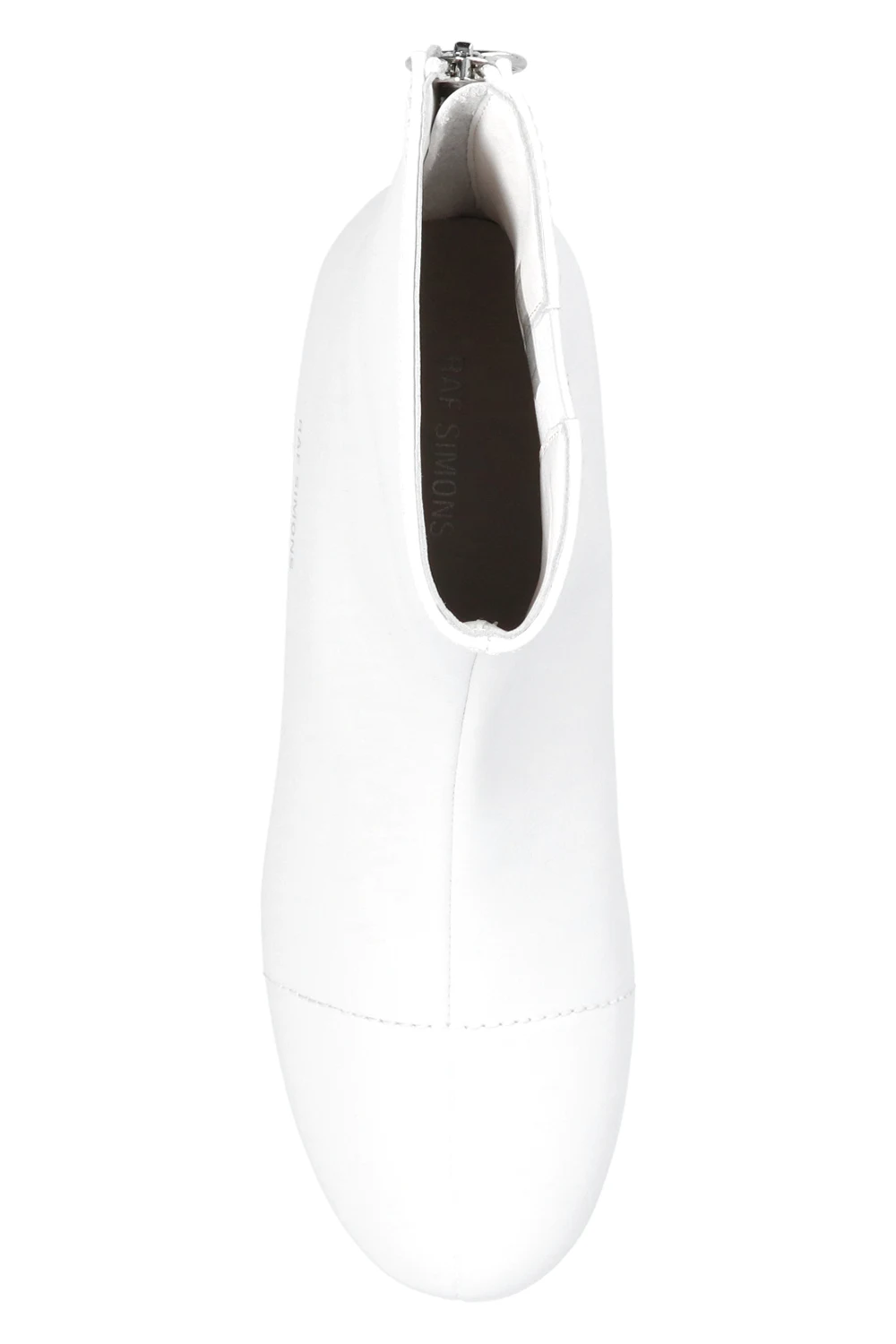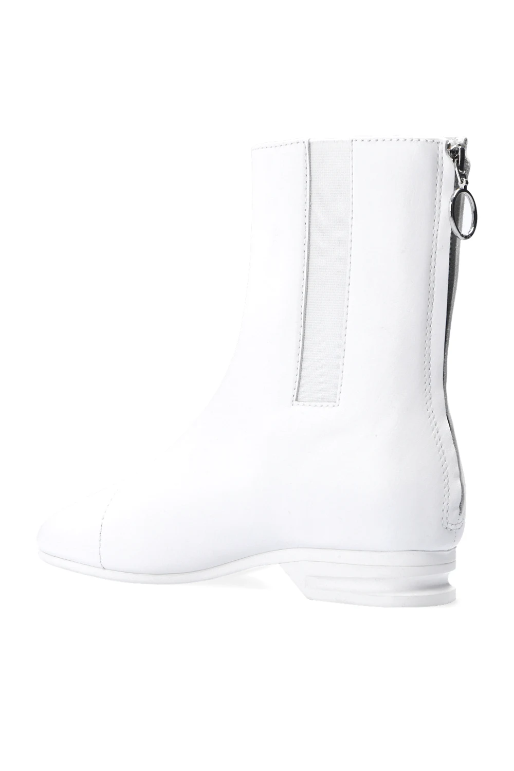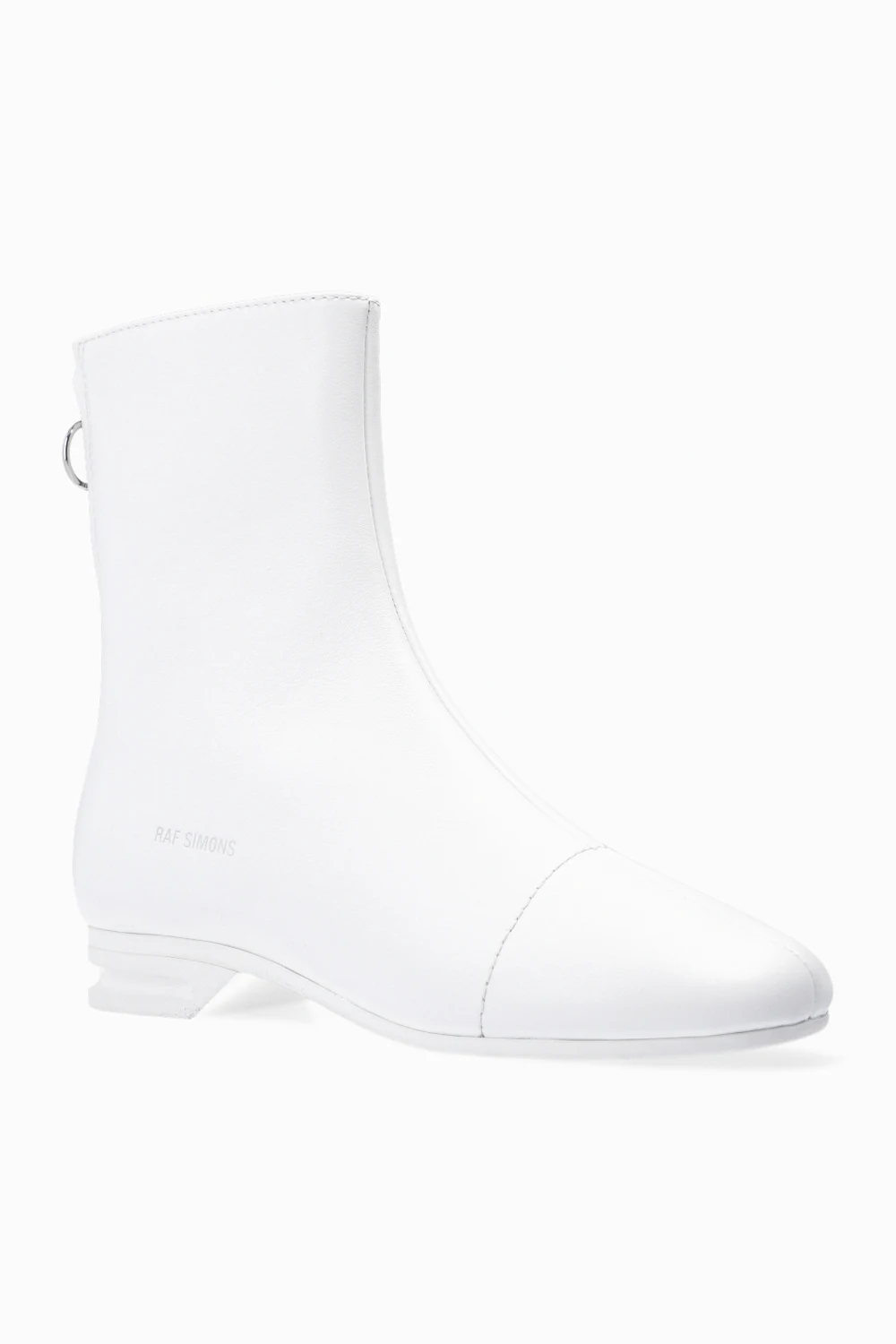 White ‘2001’ heeled ankle boots from Raf Simons. Made of leather, this pair features a back zip, elasticated side panels, silver-tone embossed logo and a white rubber sole.