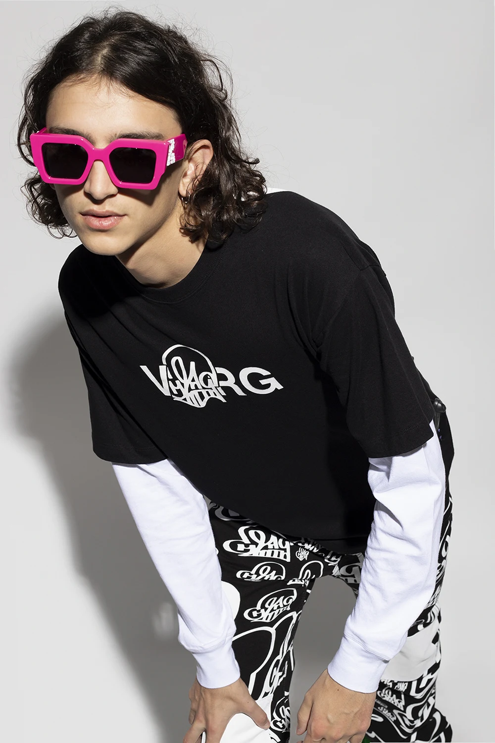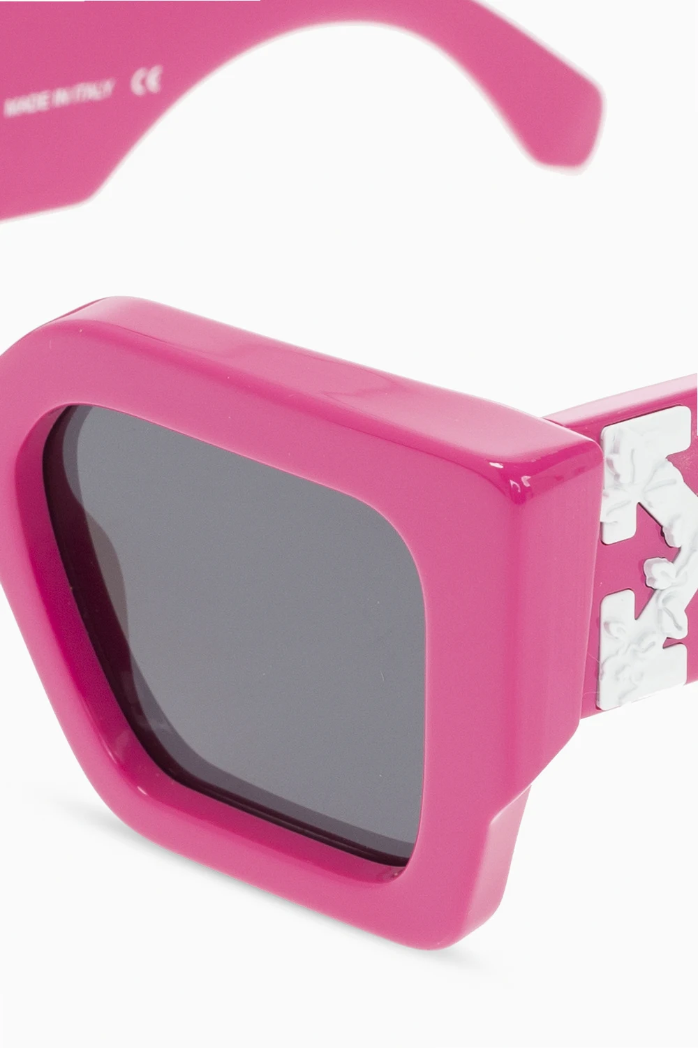 Pink sunglasses from Off-White. This model features a white logo appliqué and dark grey certified lenses with UVA/UVB protection and a logo. It comes with a black case with a silver-tone logo print and a strap.