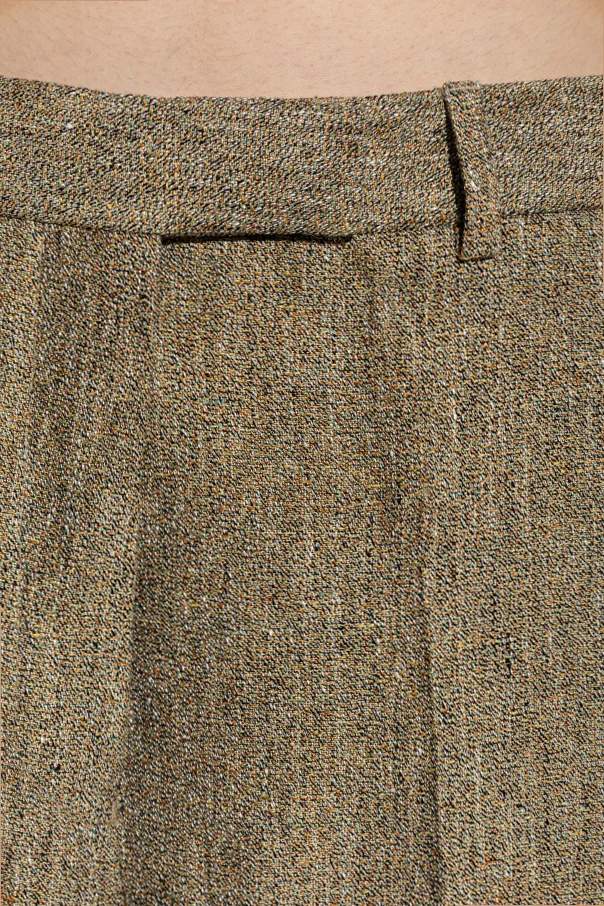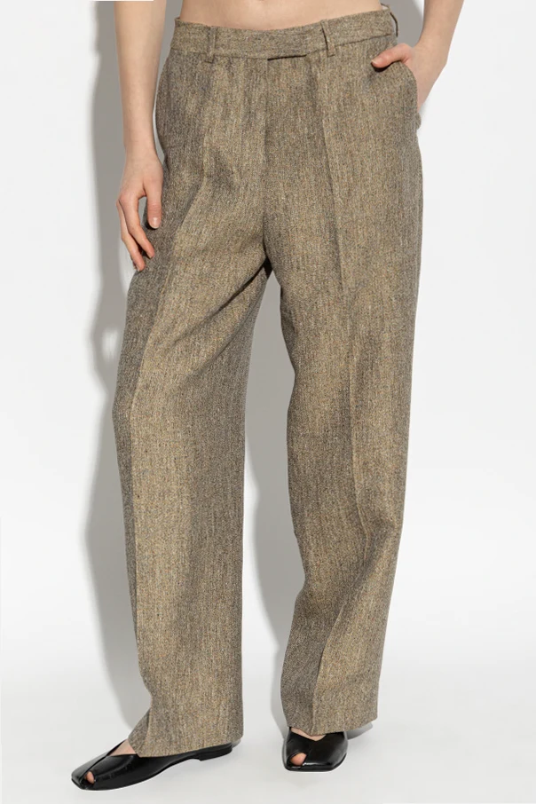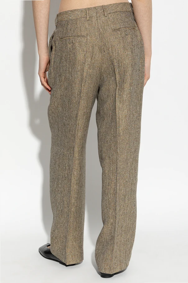 Discover refined sophistication with the Azora Linen Trousers by Officine Generale, meticulously crafted for the discerning woman. Rendered in a luxurious beige mélange, these formal trousers feature a subtly textured linen structure that radiates exclusivity and natural elegance. The high-rise silhouette, complete with a wide waistband and belt loops, elegantly accentuates the waist while offering a graceful drape through the legs.
