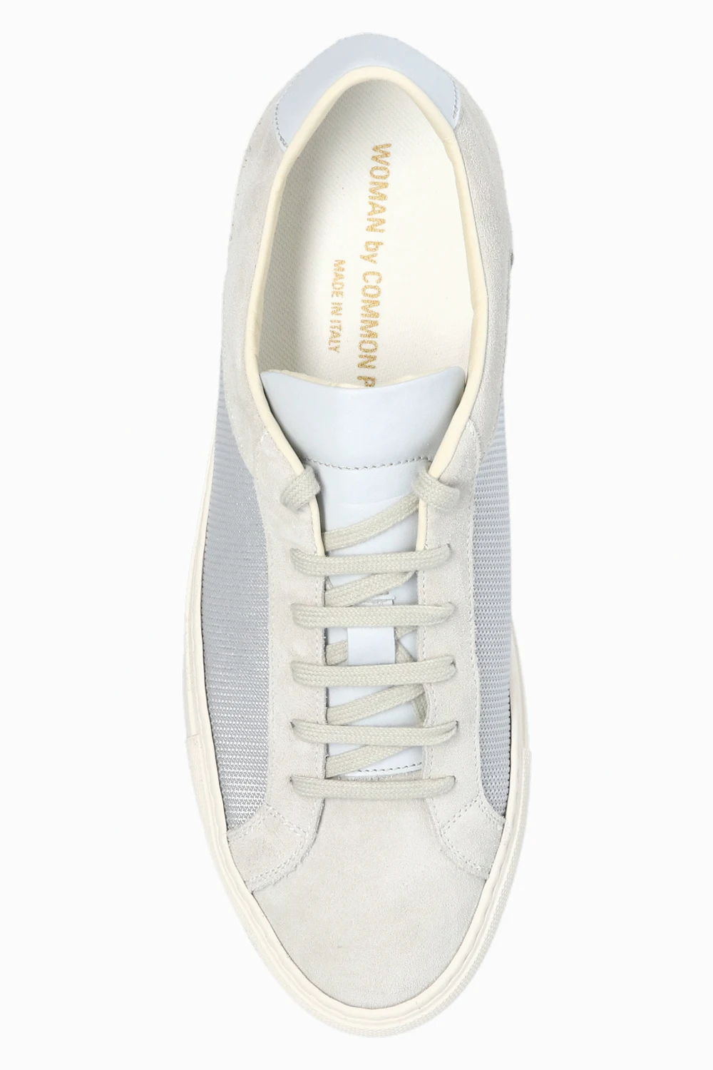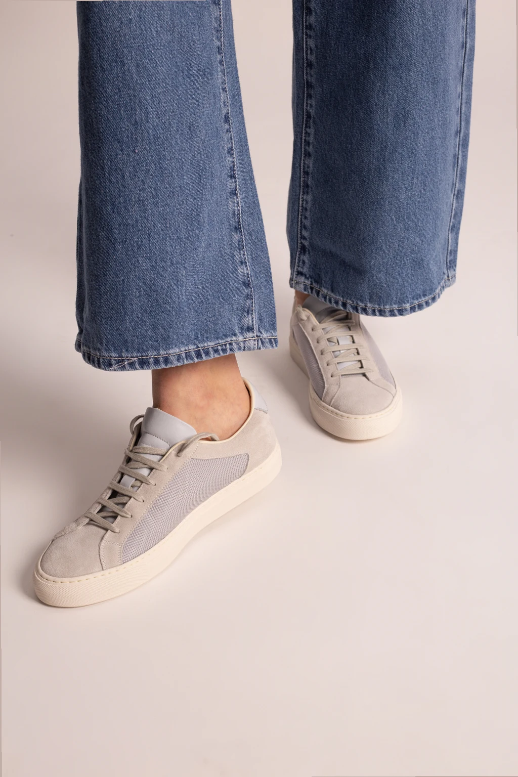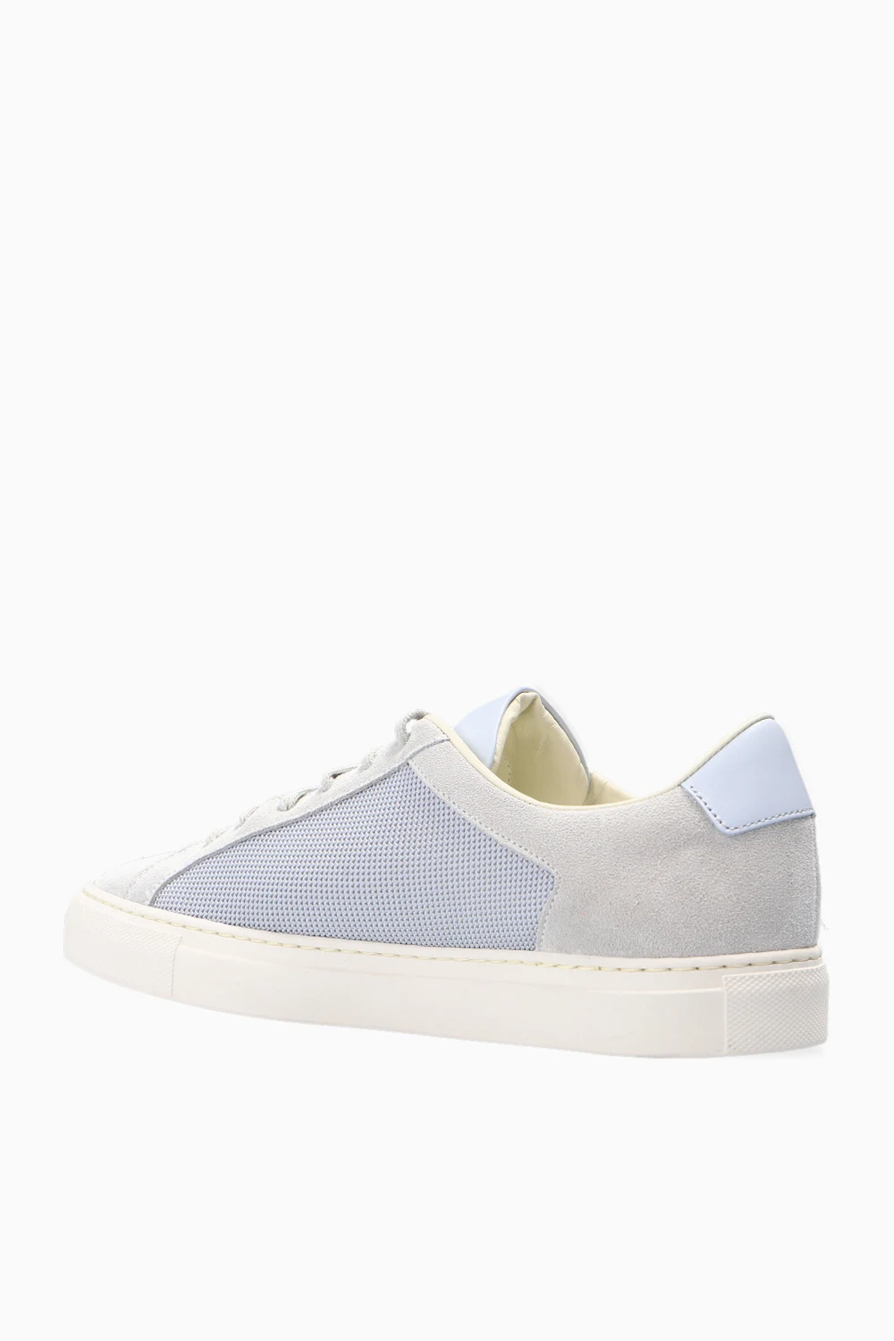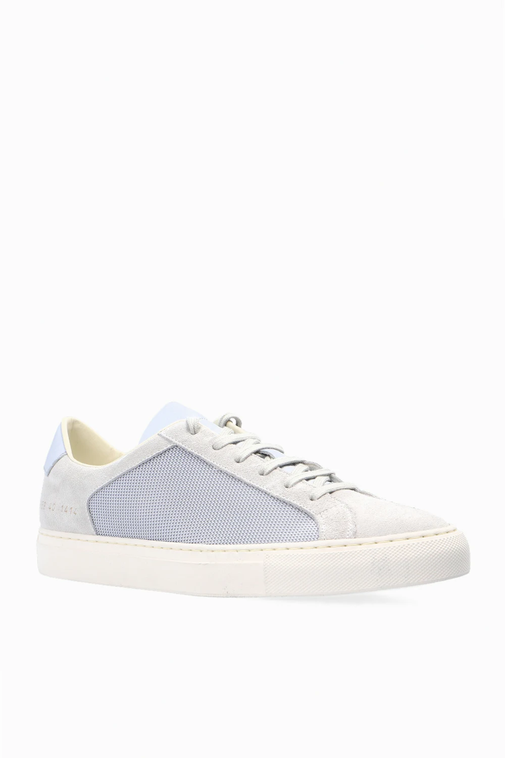Grey ‘Retro’ sneakers from Common Projects. Featuring a leather and fabric upper, this lace-up pair features a printed pattern in gold-tone, grey insert at the back and a white rubber sole.