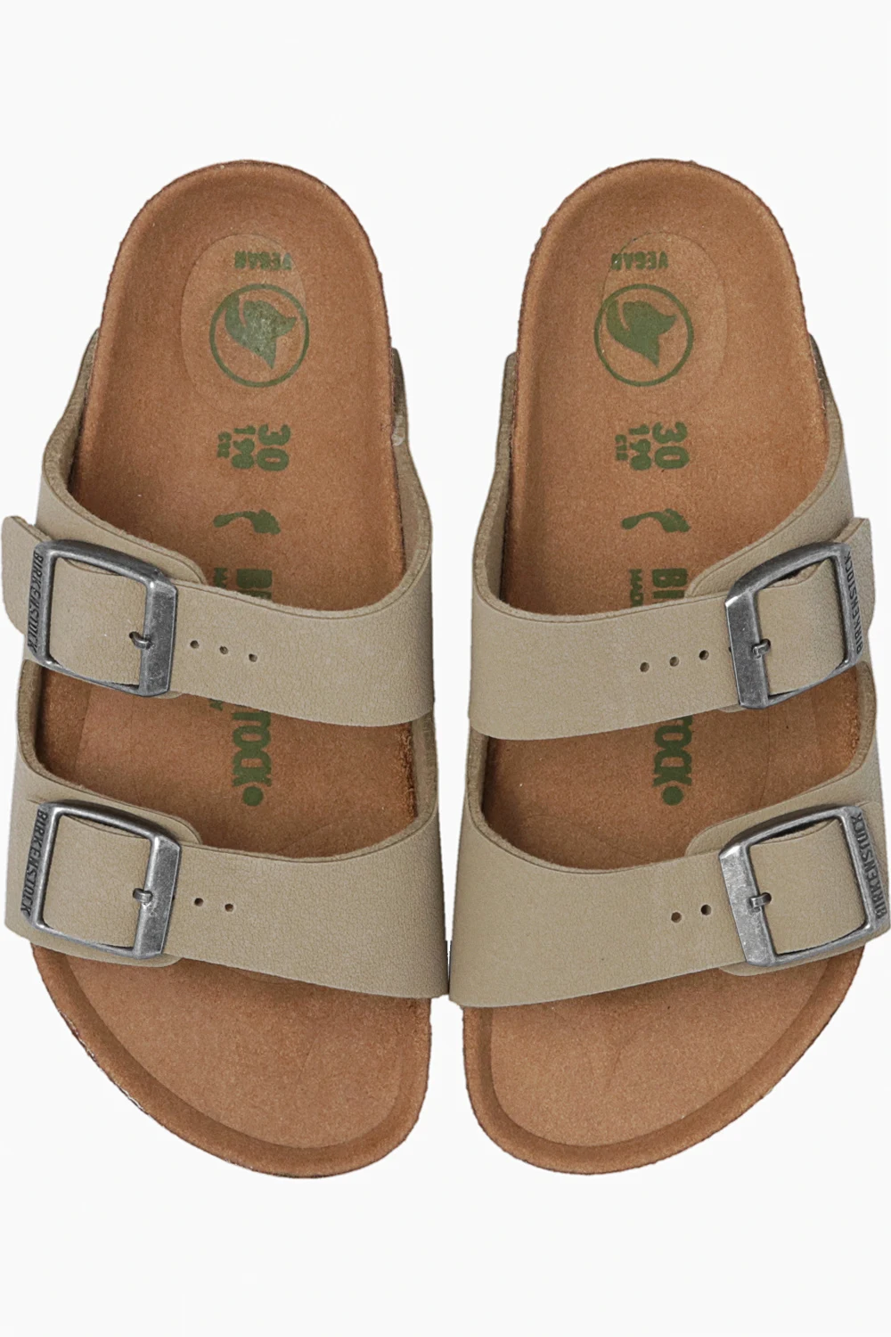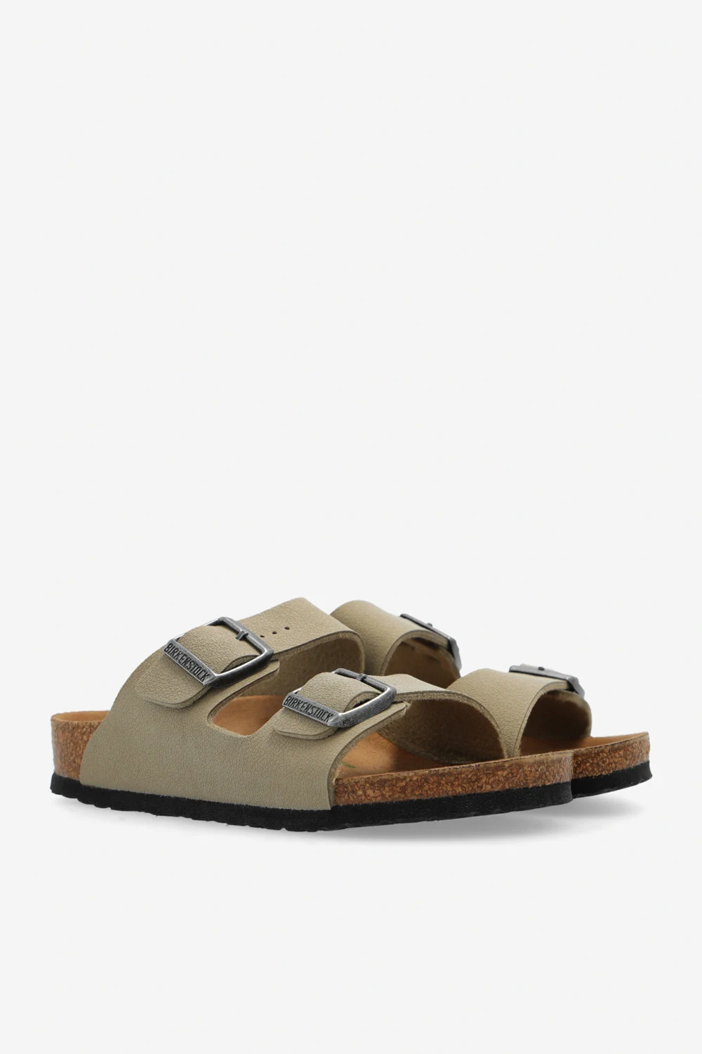 Grey ‘Arizona’ slides from Birkenstock. Made of Birko-Flor®, this pair is complete with straps, silver-tone logo-embossed buckles and black rubber sole with EVA foam and cork footbed.