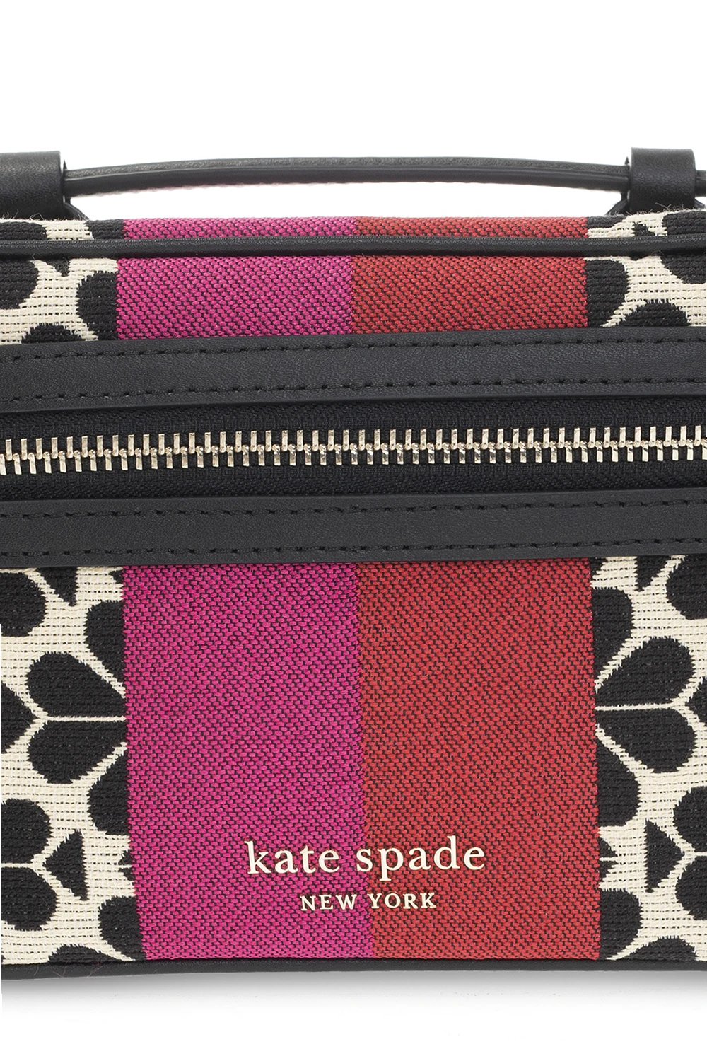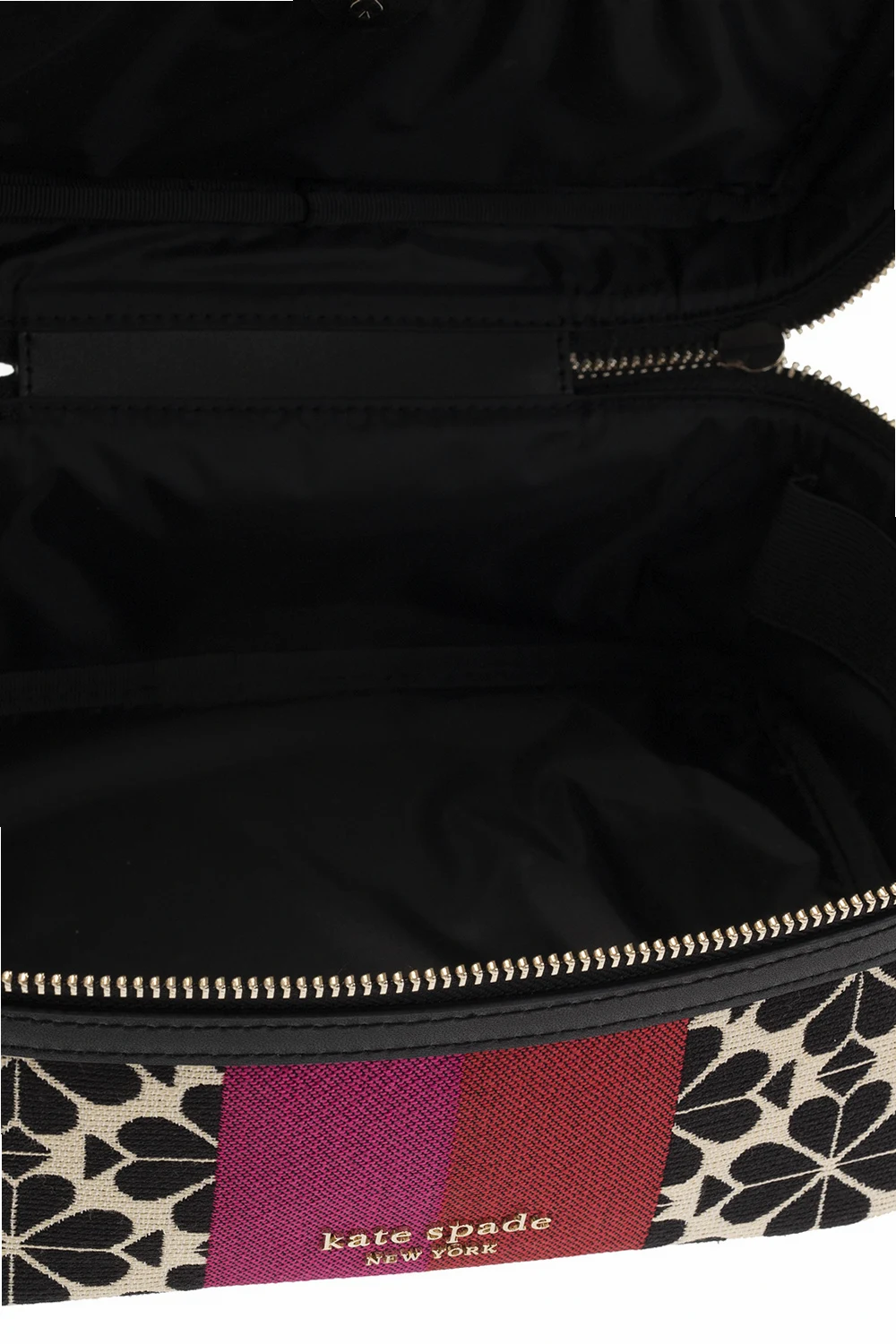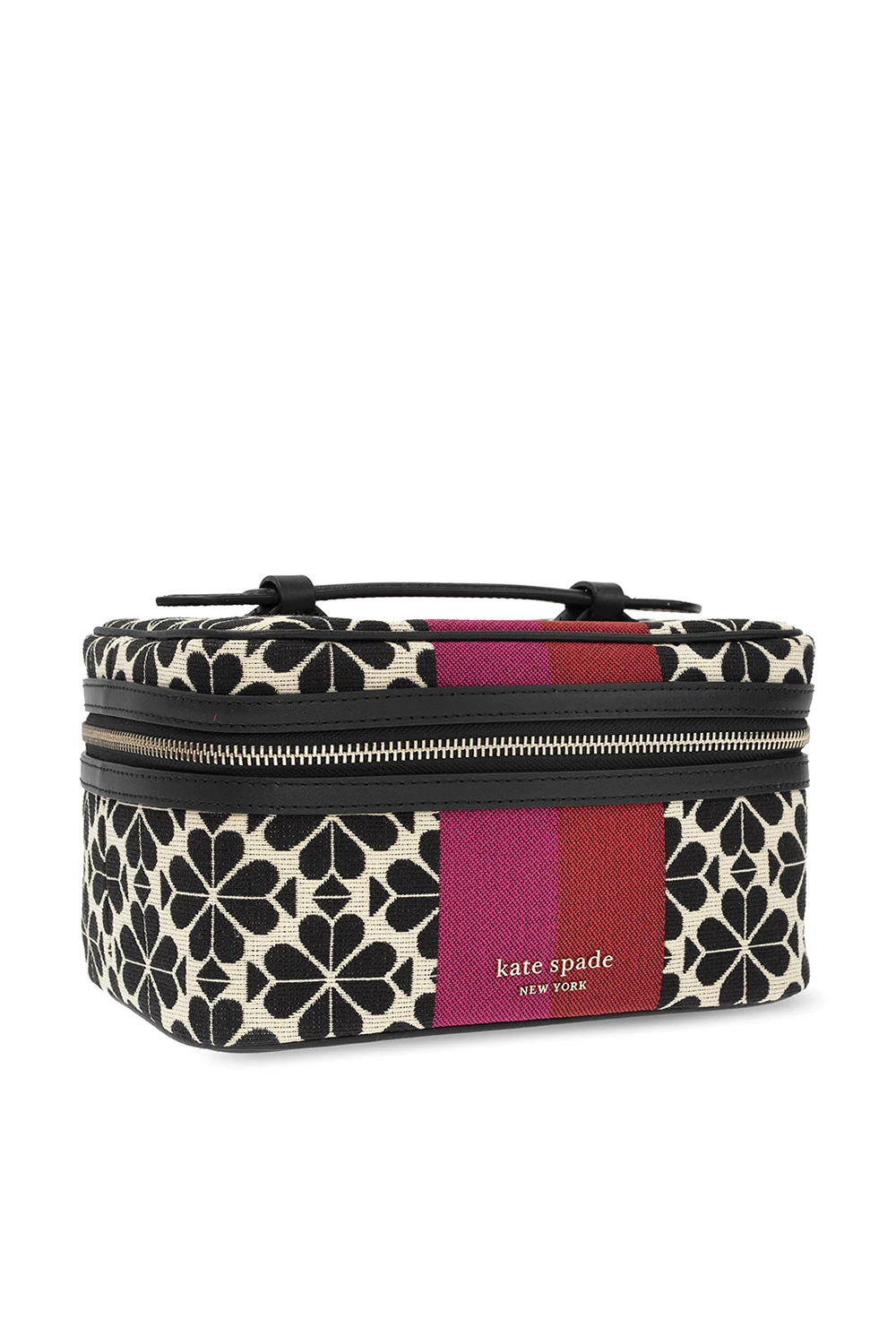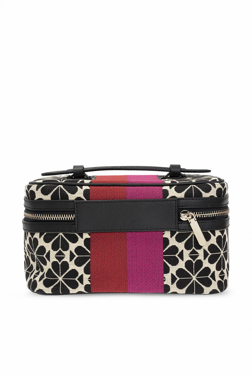 Black and cream wash bag from Kate Spade. Finished with black cow leather, this design showcases a floral jacquard pattern and a red and pink stripe. It is complete with a zip fastening, a gold-tone plaque on the front, a half-round handle and one internal compartment with one slip pocket and one zipped pocket.
