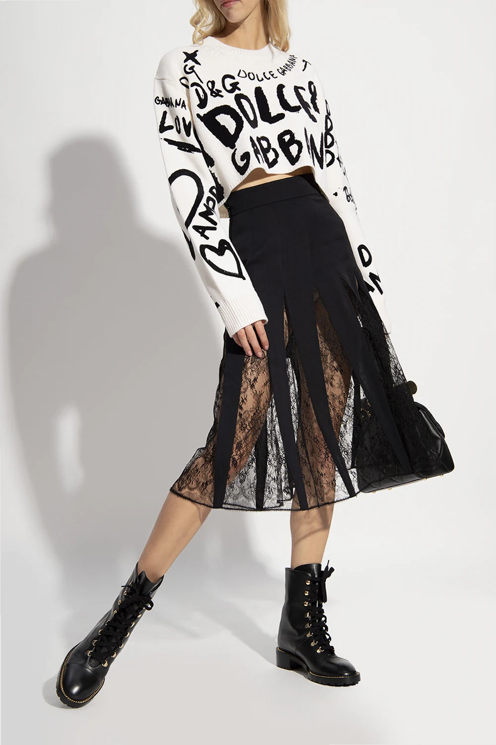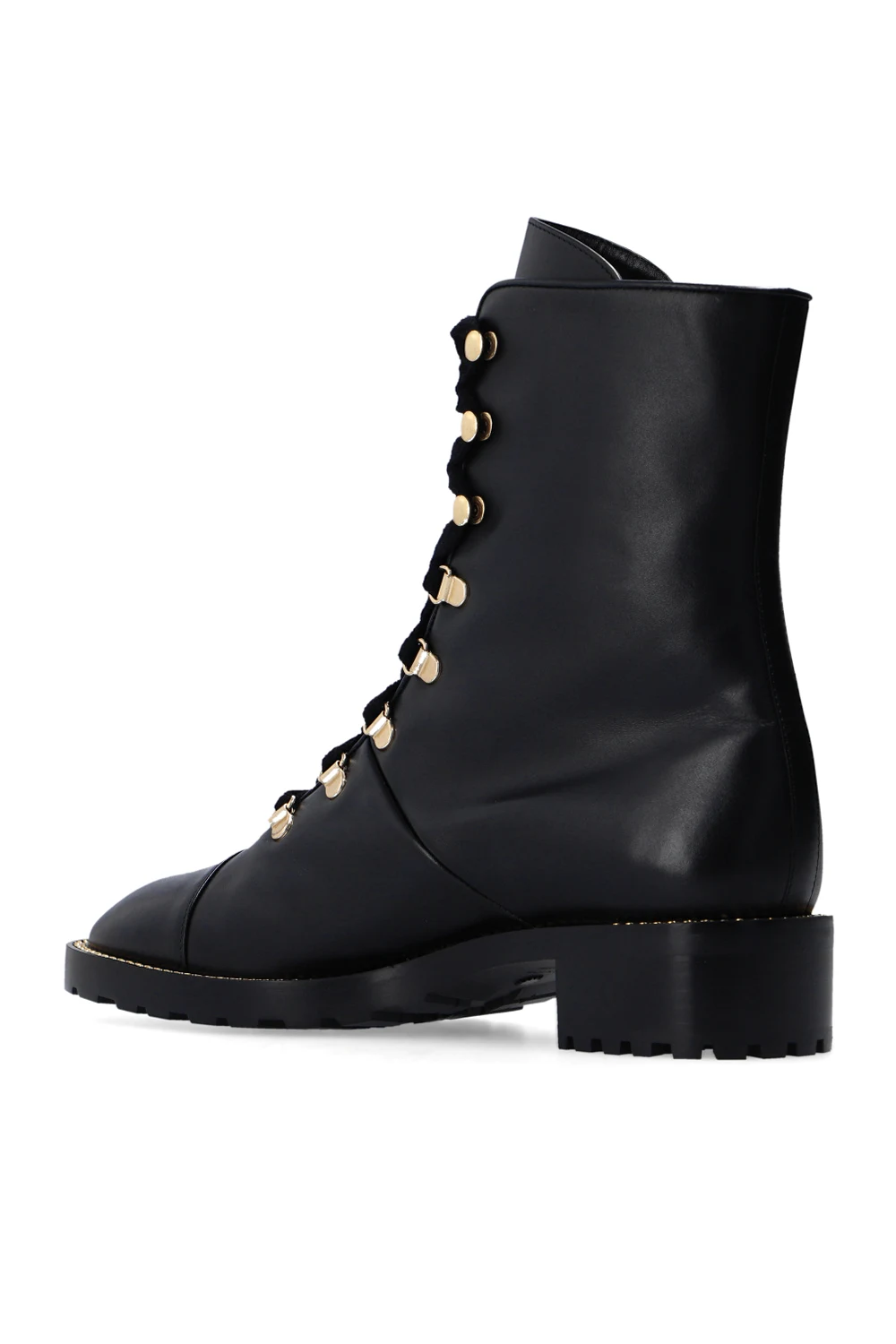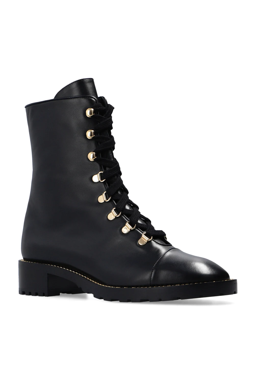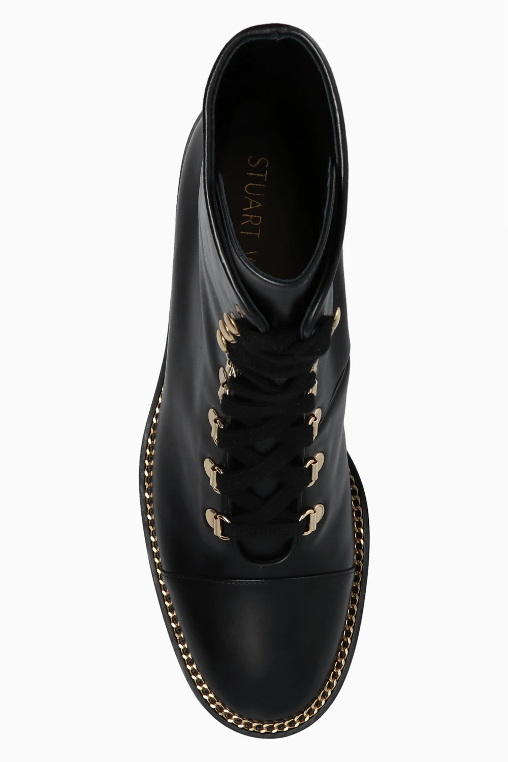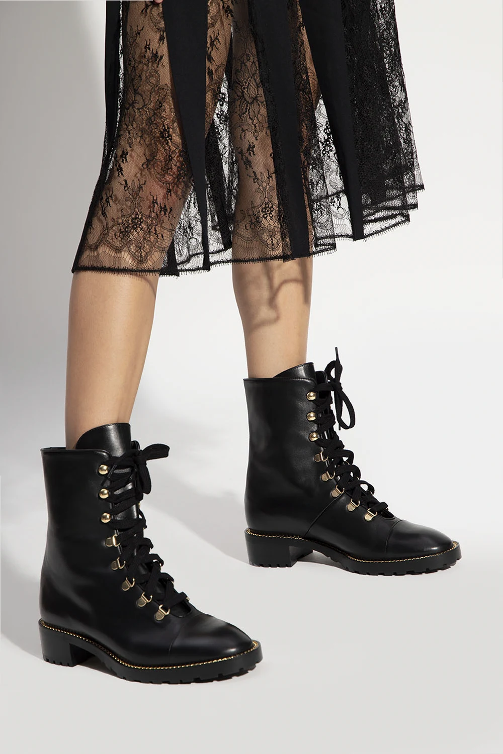 Black ‘Kolbie’ ankle boots from Stuart Weitzman. Made of leather, this lace-up pair features a gold-tone appliqué and black rubber sole.