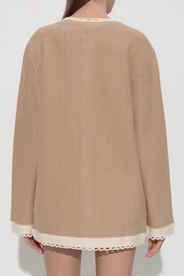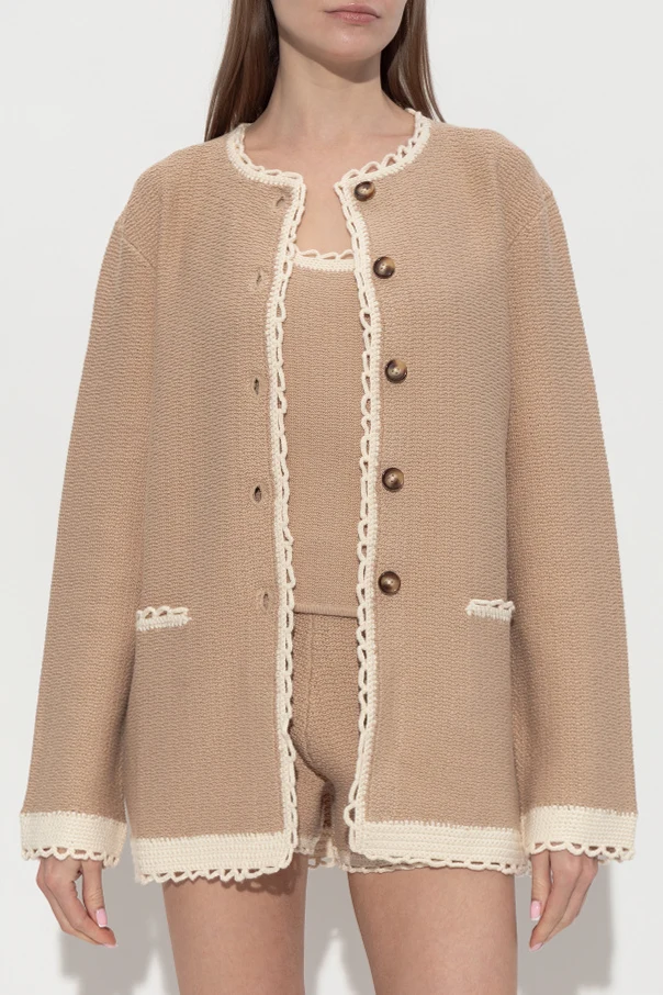 The “Willow” cardigan by Posse exemplifies understated luxury within contemporary knitwear. Its classic, slightly oversized silhouette, designed to graze mid-thigh, elegantly flatters the feminine form while offering effortless versatility. Crafted from opulent, finely textured knit, the fabric’s substantial yet exquisitely soft hand reveals an uncompromising commitment to comfort and quality. Distinctive finishing touches define this cardigan: a rounded neckline without a collar sets a modern tone, while wide, intricate lace trim in a creamy contrast gracefully highlights the edges, from the neckline and front opening to cuffs, hem, and pockets. Four natural, marbled buttons add a sophisticated accent, complementing the cardigan’s subtle refinement. Twin front pockets provide both functionality and a nod to timeless design. Why choose this product? Exquisite, tactile materials for luxurious comfort Signature statement lace trim for an exclusive touch Effortlessly chic, versatile silhouette Elegant, naturally marbled button accents Functional pockets elevate practicality and style