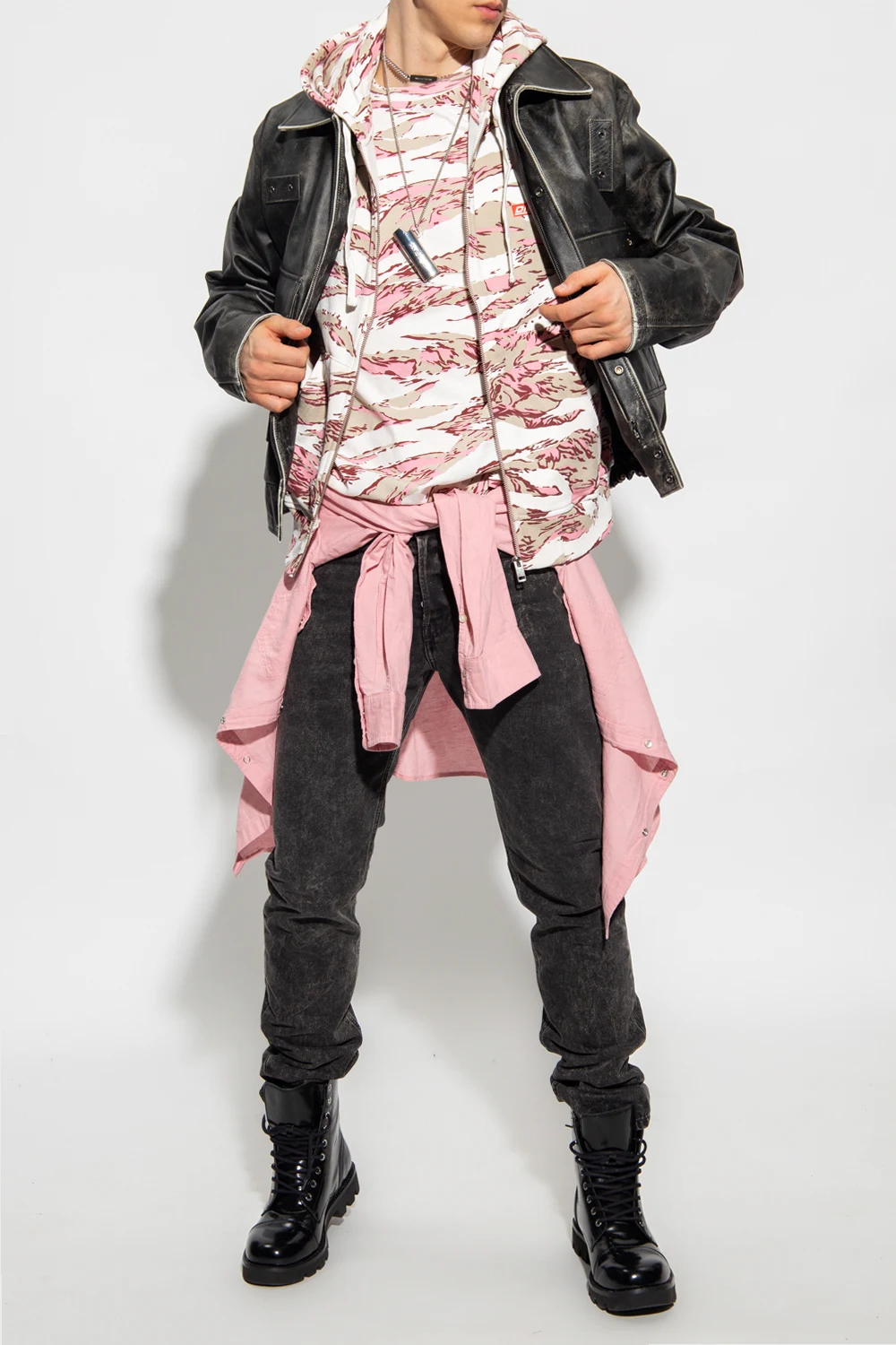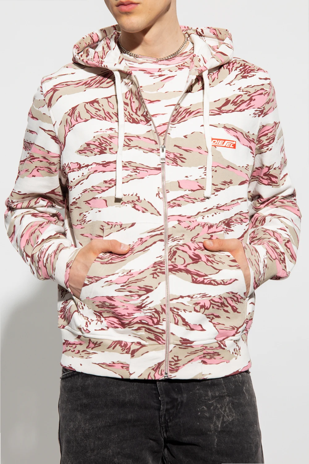 Multicolored 'S-GINN-HOOD-ZIP-HS1' patterned hoodie from Diesel. Made of cotton, this garment features a zip fastening, drawstring hood, pattern, red and white logo print, two slip pockets and ribbed trims at the hem and cuffs.