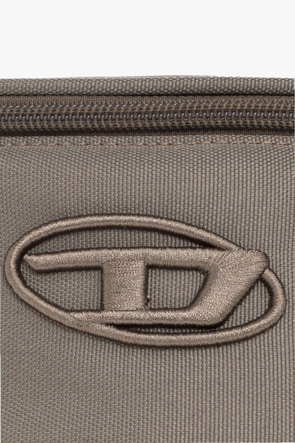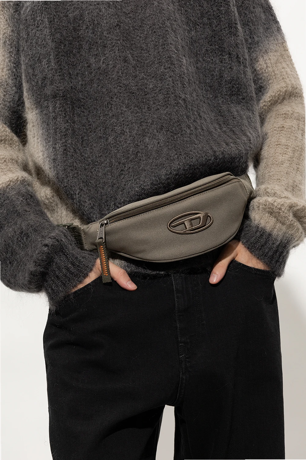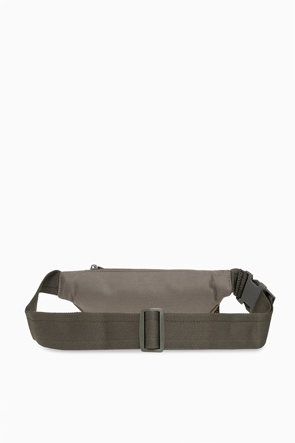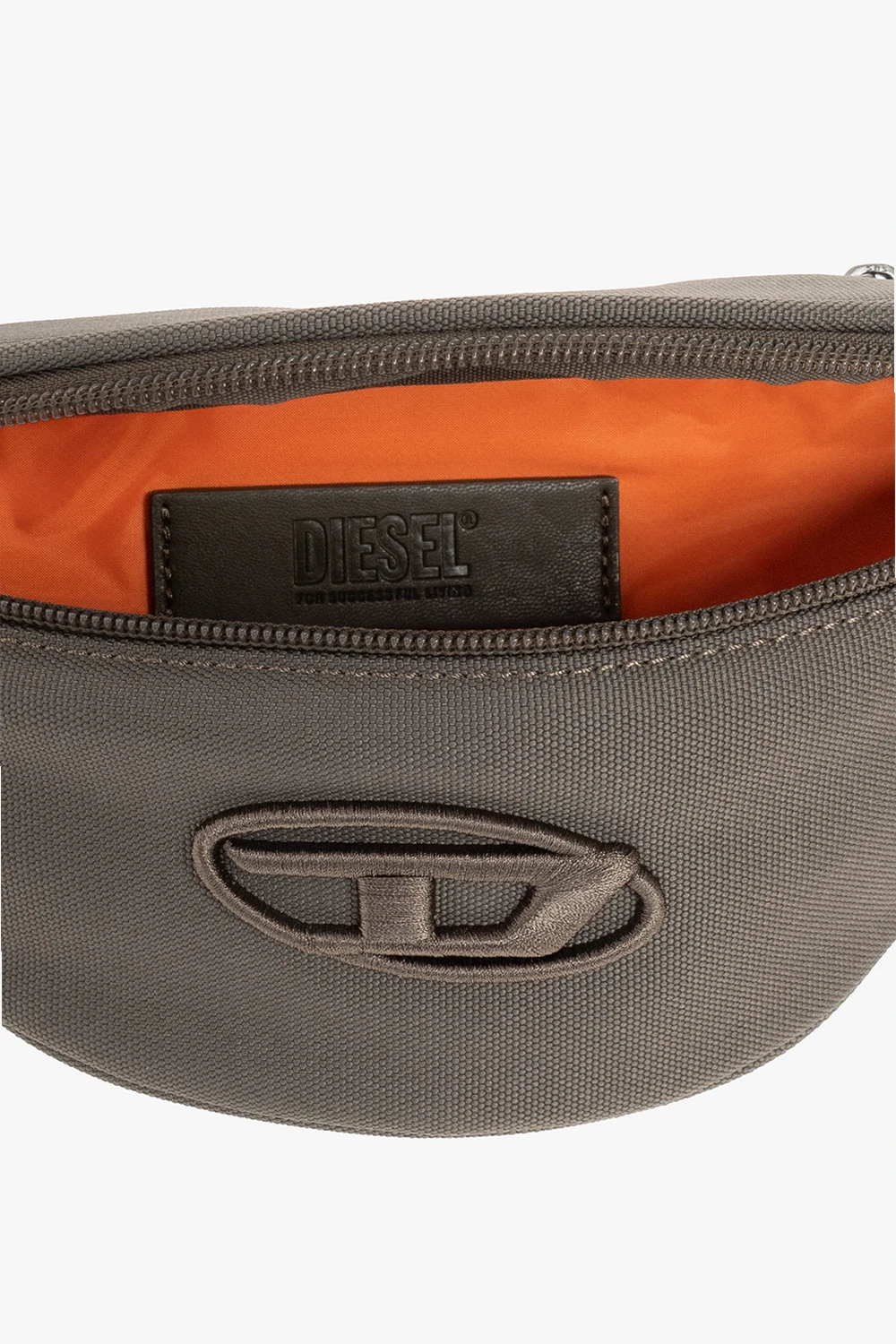 Khaki ‘D. 90’ belt bag from Diesel. Crafted from faux leather, this design features a zip fastening, an embossed logo, a back zip pocket, an adjustable strap and an orange-clad interior with one compartment.