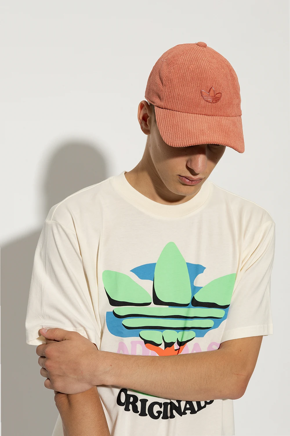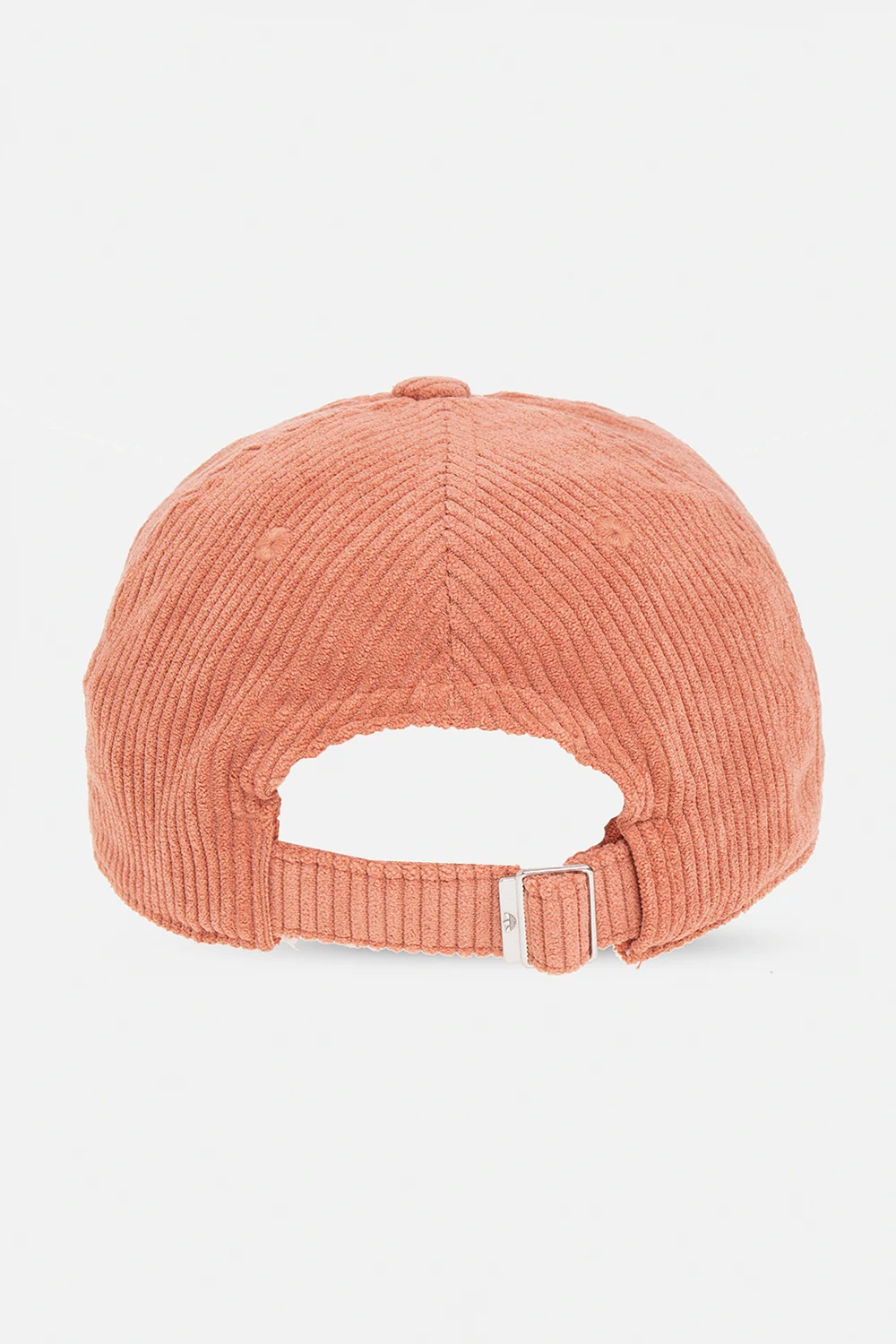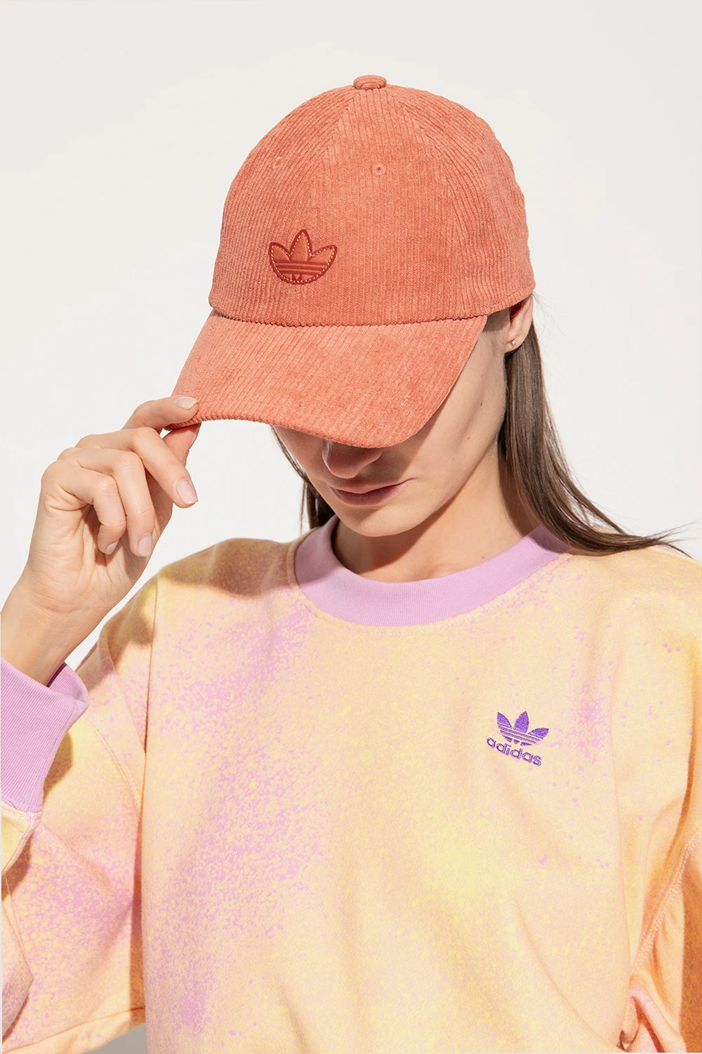 Orange and pink corduroy baseball cap from ADIDAS Originals. Made from recycled material, this item features a logo-shaped patch on the front and an adjustable buckle strap at the back.